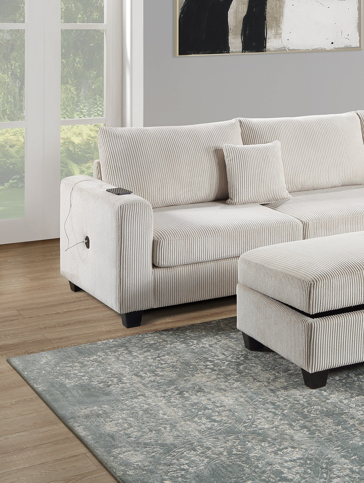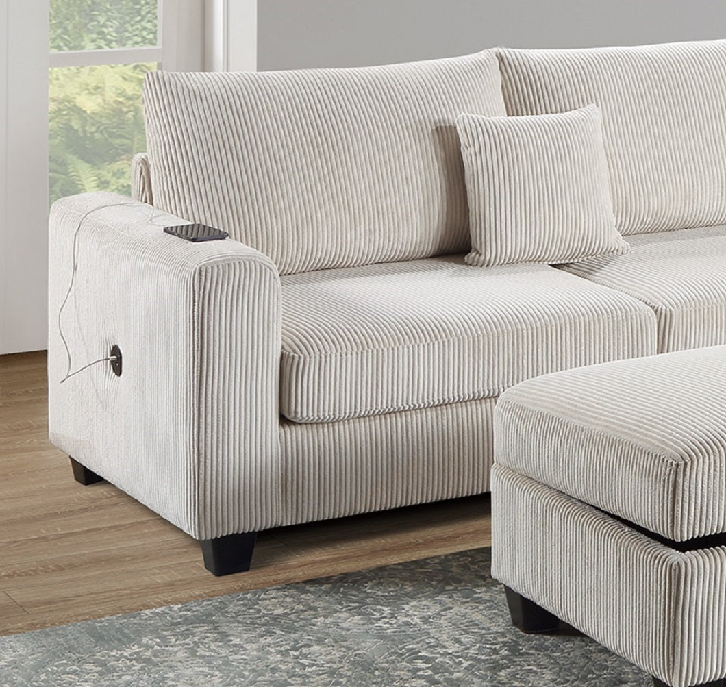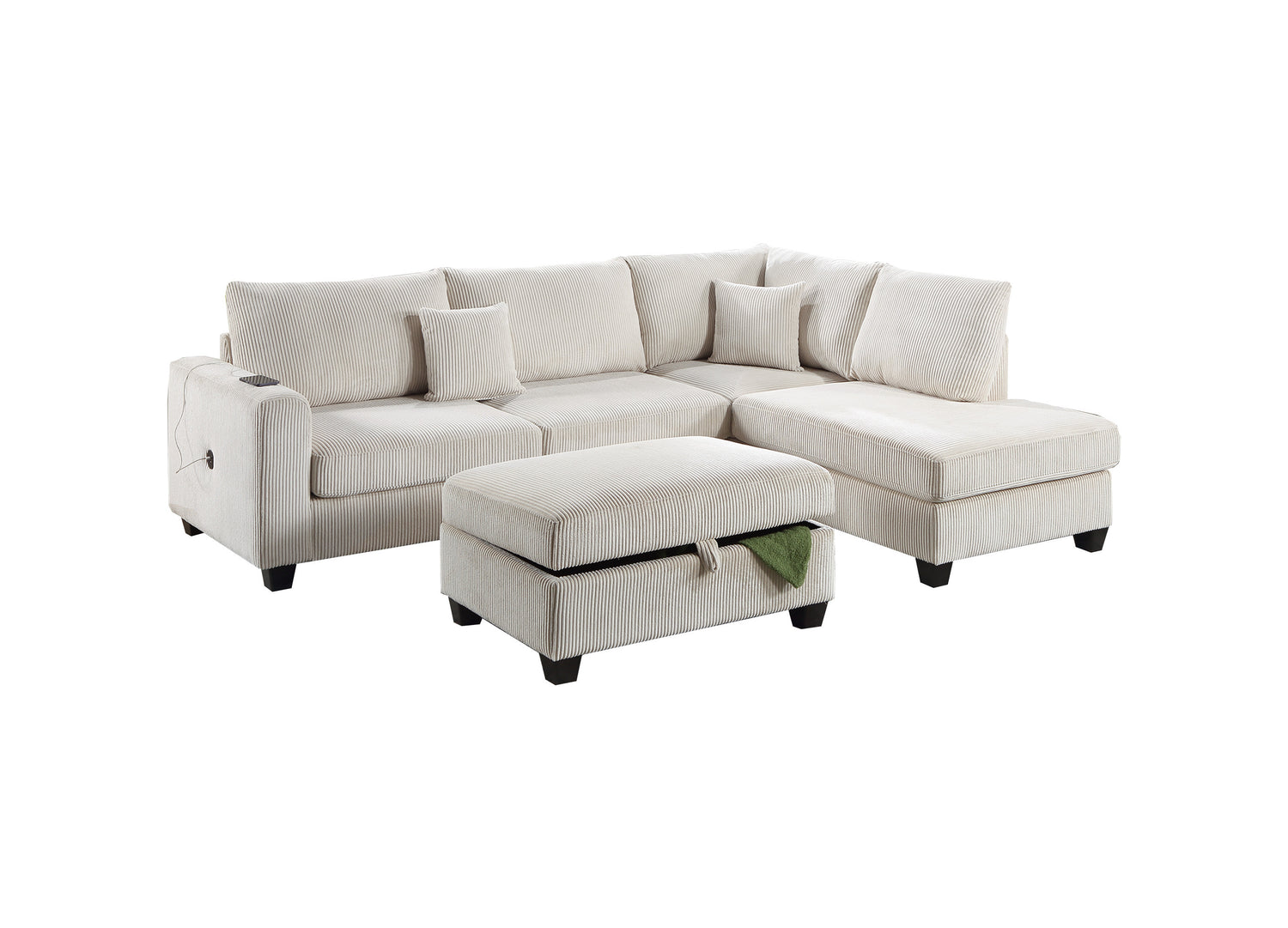 This 3-Piece Sectional Set is designed to redefine comfort and style in your living space. Experience convenience at your fingertips with the Left Arm Facing (LAF) Sofa, featuring a built-in USB port for easy charging of your devices. Sink into relaxation with the Right Arm Facing (RAF) Chaise, offering ample space to stretch out and unwind after a long day. Making it the perfect spot for lounging, reading, or simply enjoying your favorite movie. Maximize your living room storage with the included Storage Ottoman, perfect for stashing away blankets, magazines, or remote controls, it seamlessly blends style with functionality. Crafted with corduroy material soft to the touch and adds a touch of sophistication to your living space. Complete with two throw pillows, this 3-Piece Sectional Set is the epitome of modern elegance and comfort.