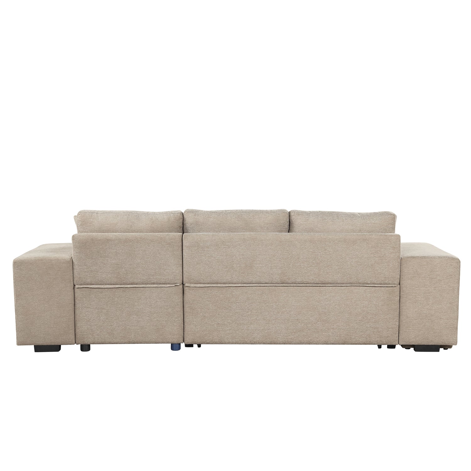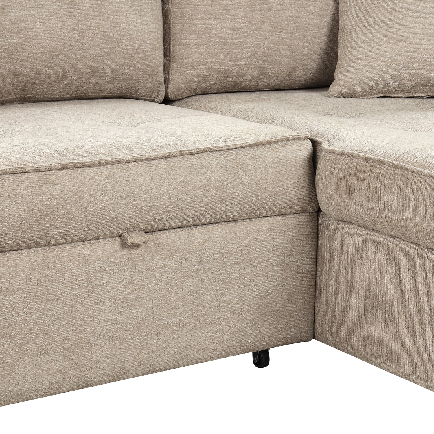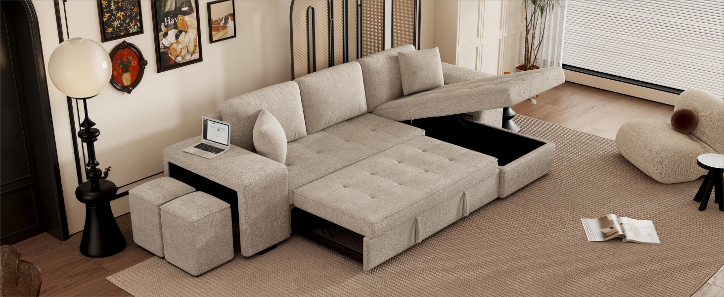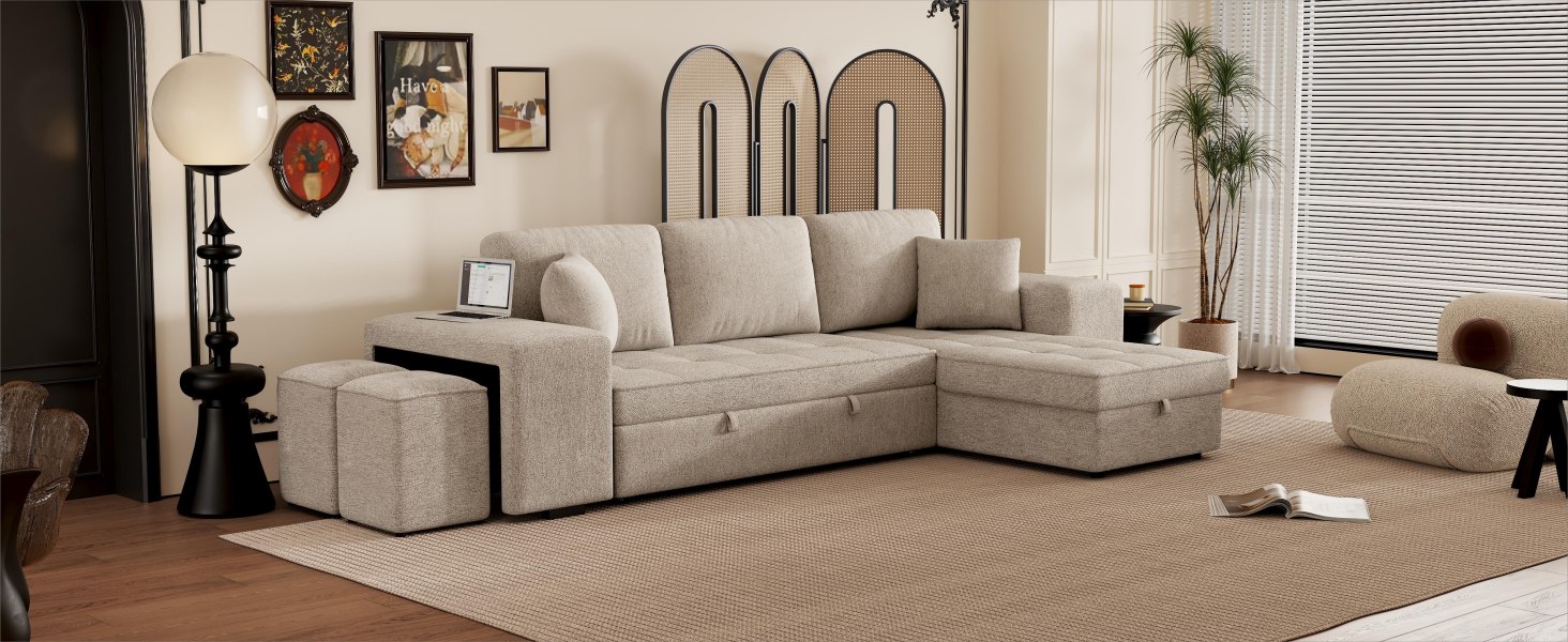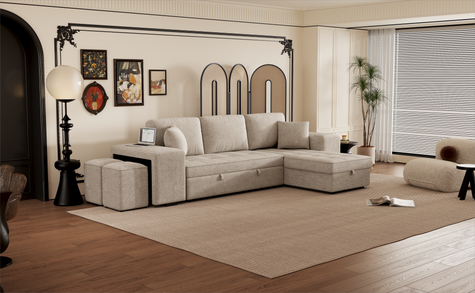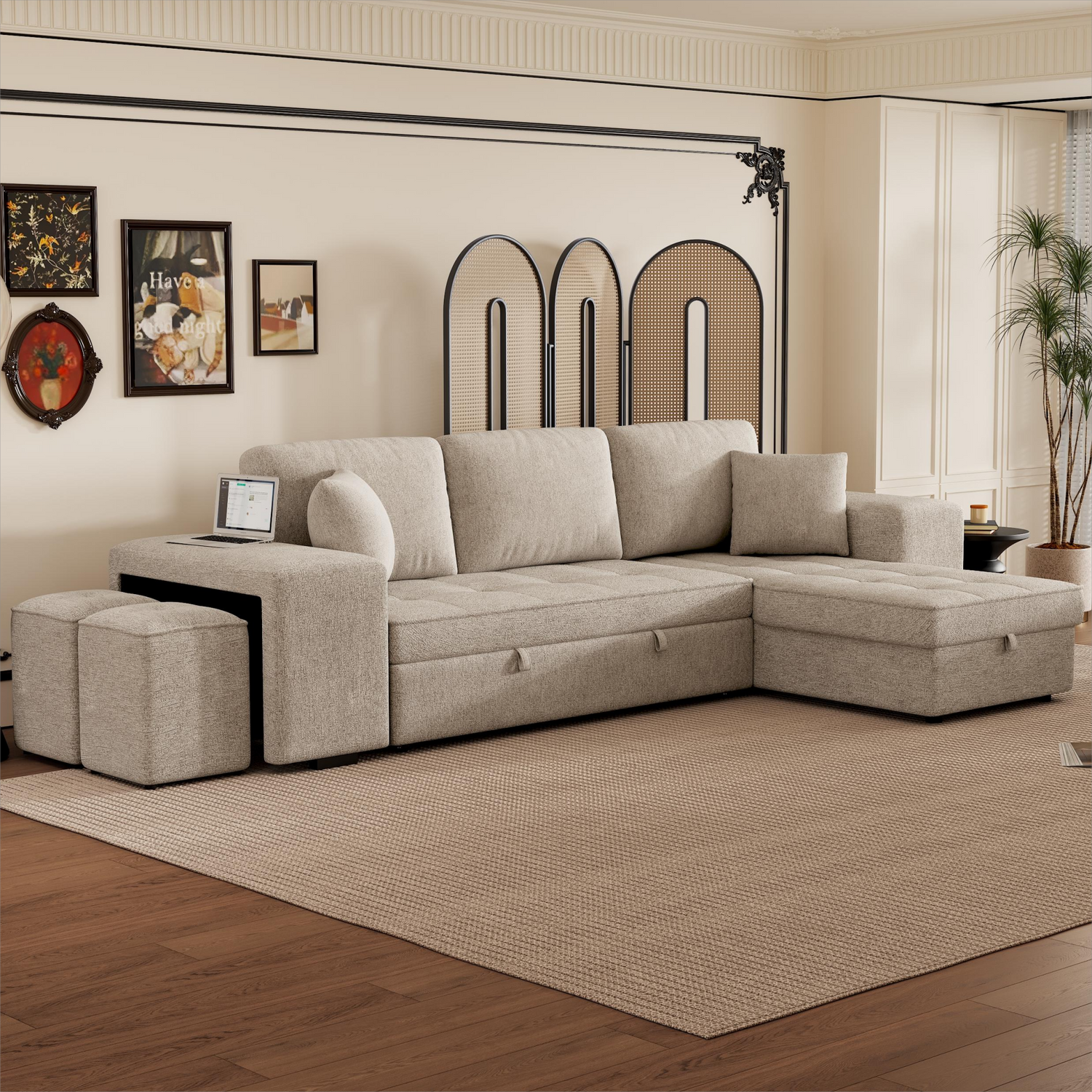 Modern L-Shape 3 Seat Reversible Sectional Couch with Pull Out Sleeper, Storage Chaise & 2 Stools, Cream, Linen Chenille is available