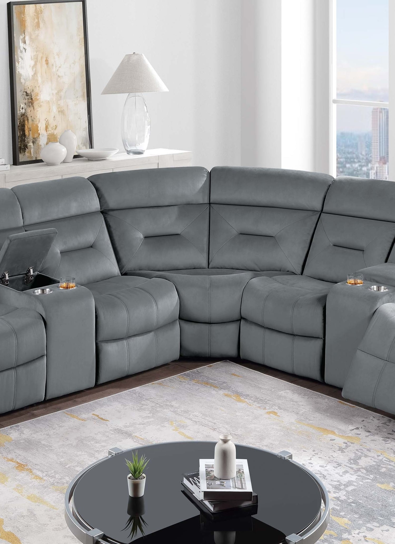 Bring home the ultimate balance of comfort, function, and modern luxury with this Power Motion Sectional. Designed with a spacious profile, this sectional creates a welcoming hub for movie nights, family gatherings, or everyday lounging. Its curved shape allows it to seat five people comfortably, giving everyone their own cozy spot without crowding. Each side of the sectional is built with convenience in mind. The LAF Arm Loveseat with Recliner and Console and the RAF Arm Loveseat with Recliner and Console each feature a built-in console with two cup holders, offering a total of four cup holders for drinks and small essentials. At the center, the Corner Wedge completes the curved design, connecting the pieces seamlessly. The velvet upholstery gives the sectional a smooth, stylish finish that feels as good as it looks. Tufted seat and back cushions enhance the design while adding extra support, making long hours of lounging even more enjoyable. Plush pillow top armrests create a soft landing spot whether you’re reclining back or sitting upright. The standout feature is the power motion reclining seats on each arm loveseat. With the easy-to-use power buttons located on the arms, you can adjust your seat to the perfect angle with just a touch. This makes it easy to kick back, stretch out, and enjoy personalized comfort at any time. Whether it’s for relaxing with family, hosting guests, or creating a stylish entertainment space, this sectional checks every box. Its combination of elegant velvet, modern reclining technology, and thoughtful details makes it a statement piece that elevates any living room.