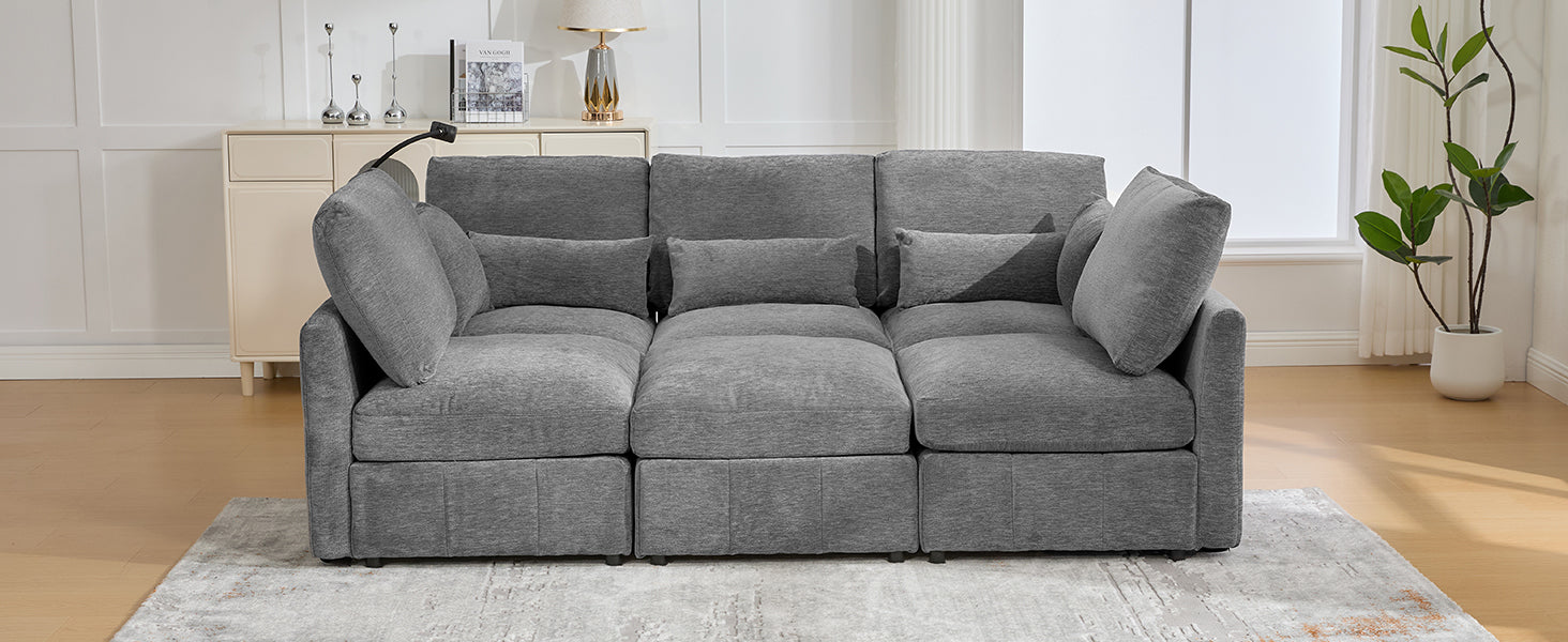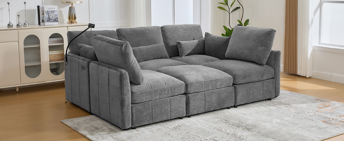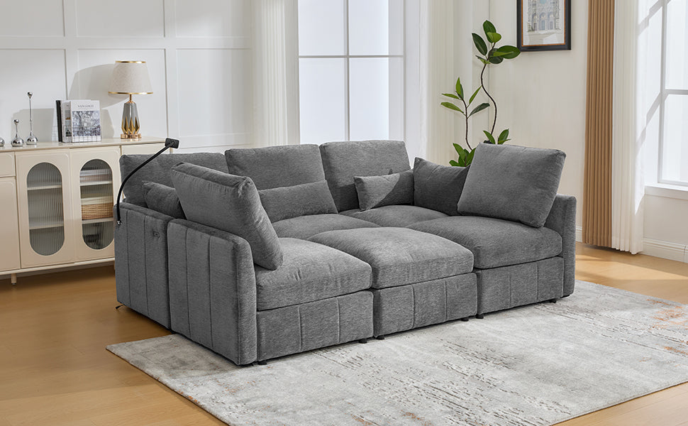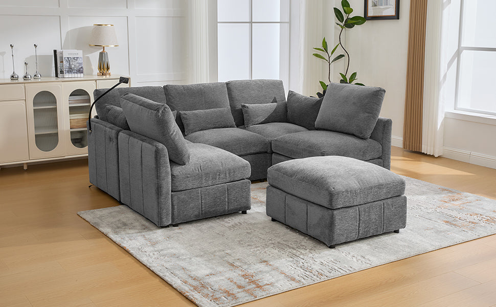 Modern Sectional Sofa Modular Sofa with Movable Ottoman, USB Ports & Phone Holder, Grey Chenille, 85.4' is available