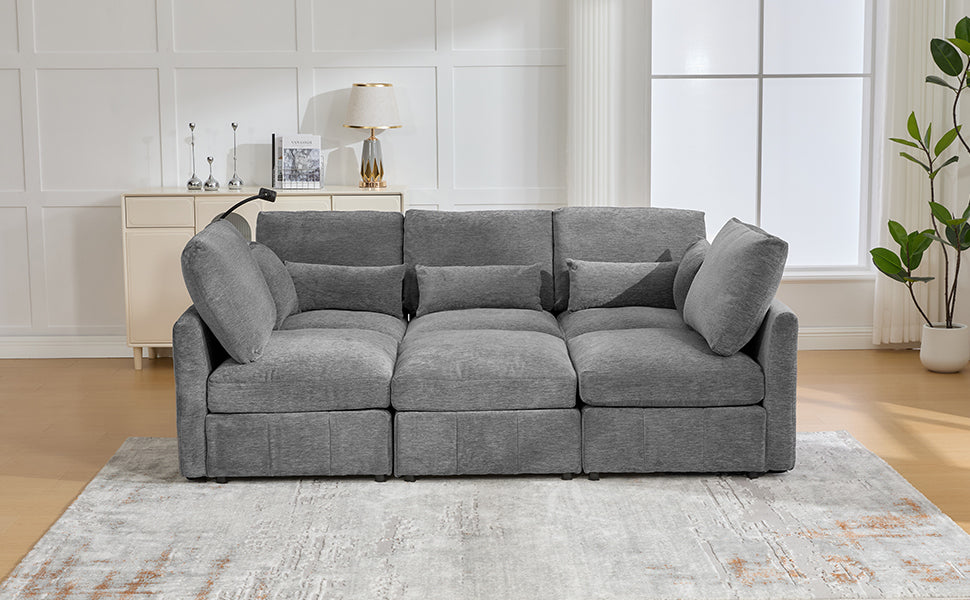 Modern Sectional Sofa Modular Sofa with Movable Ottoman, USB Ports & Phone Holder, Grey Chenille, 85.4'