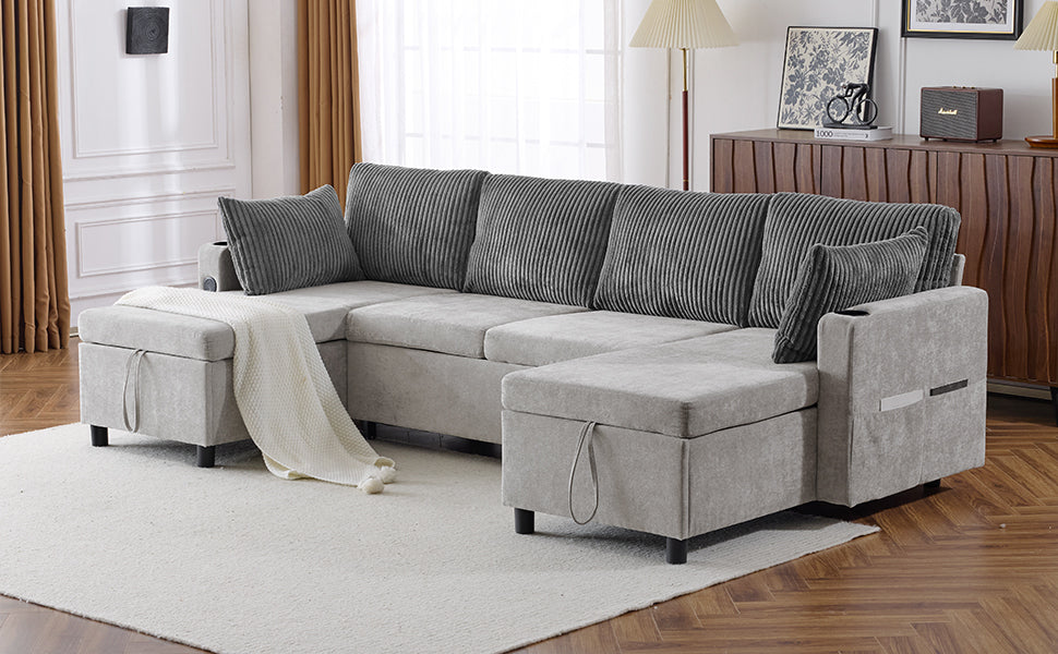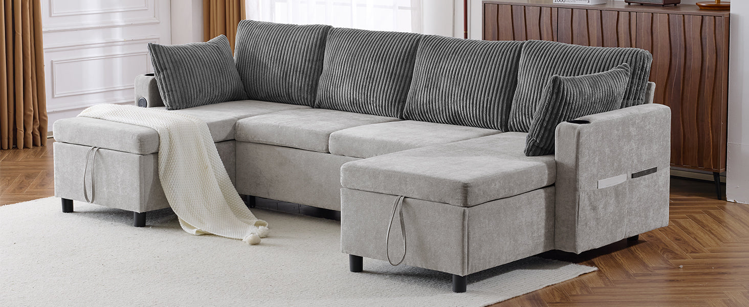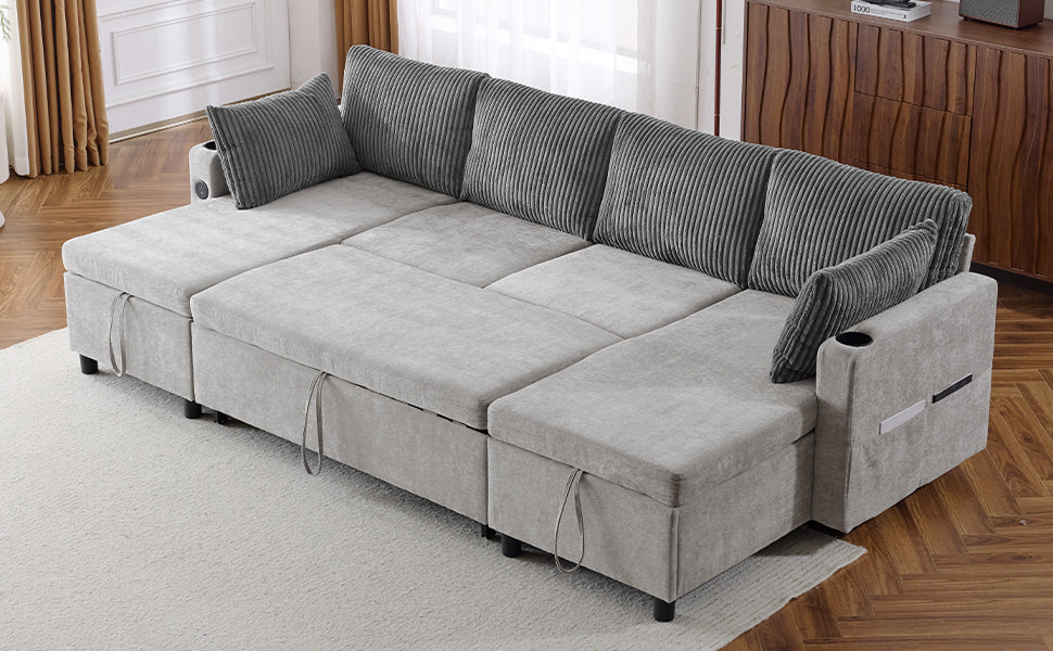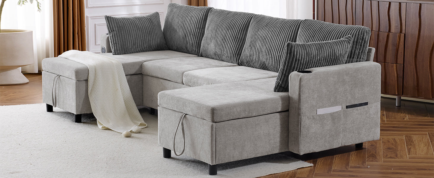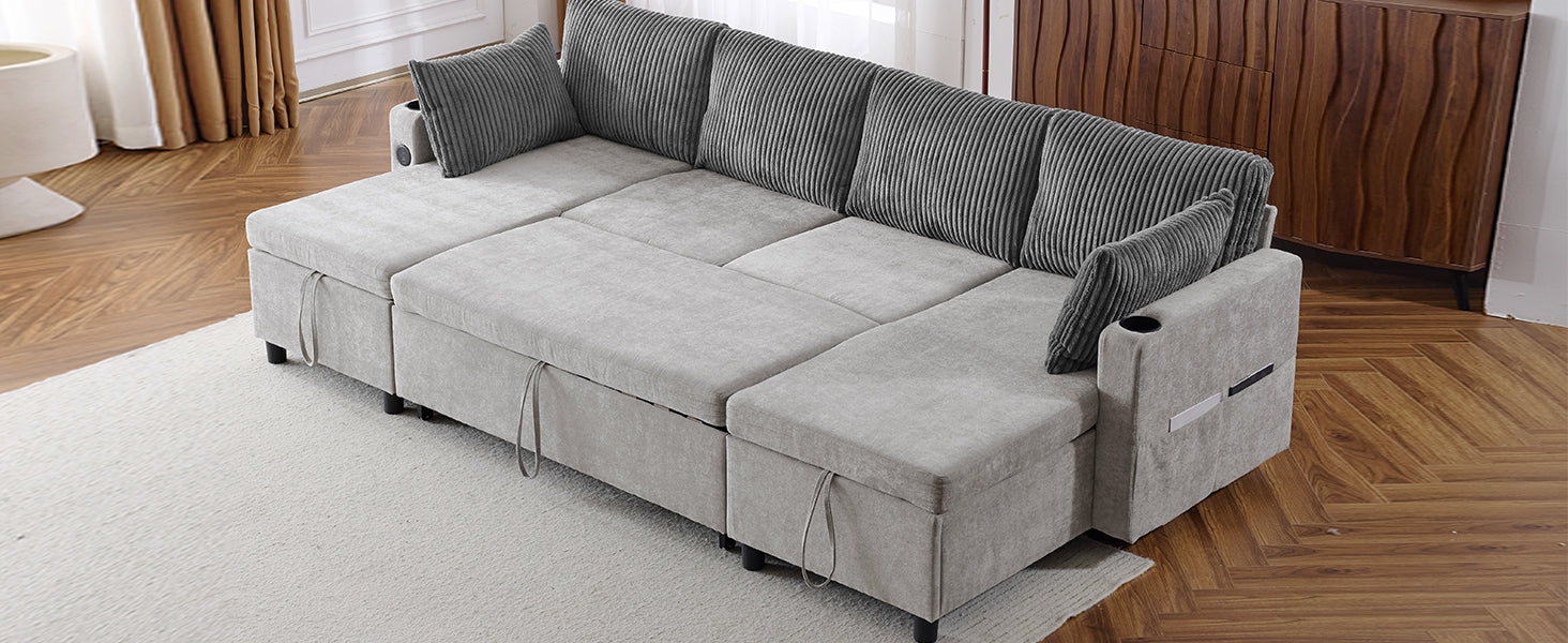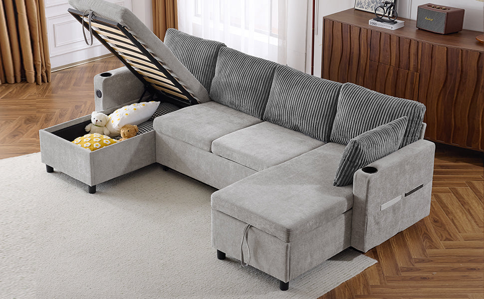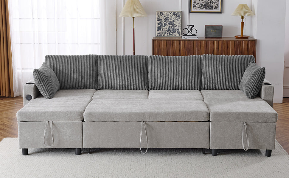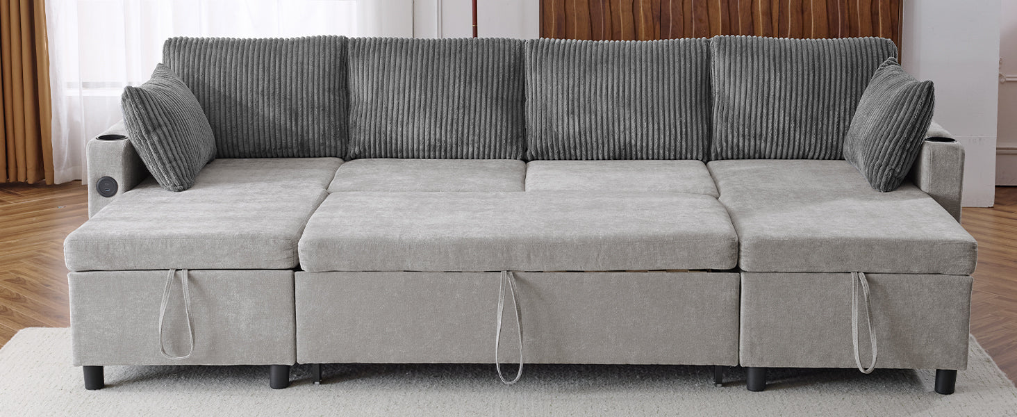 Versatile Grey Sectional Sofa Pull-out Bed with Storage, USB Ports & Cup Holders, Corduroy & Chenille Fabric, 111.8'