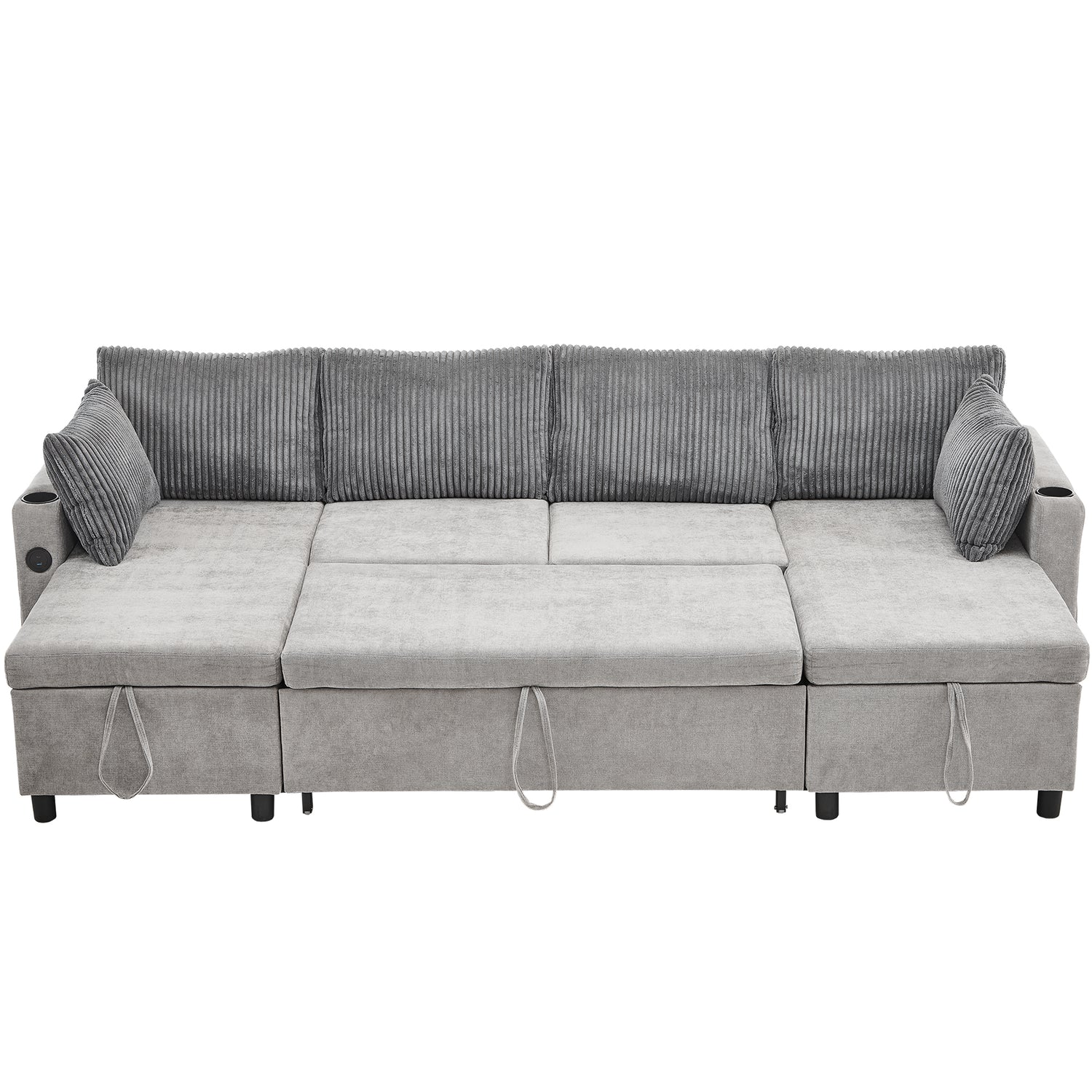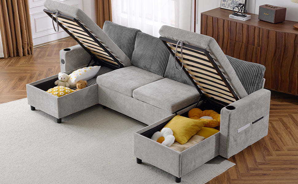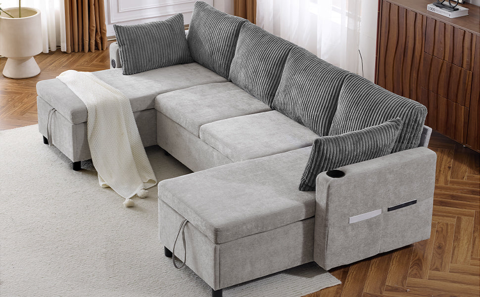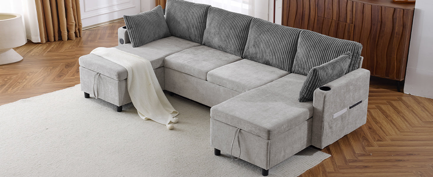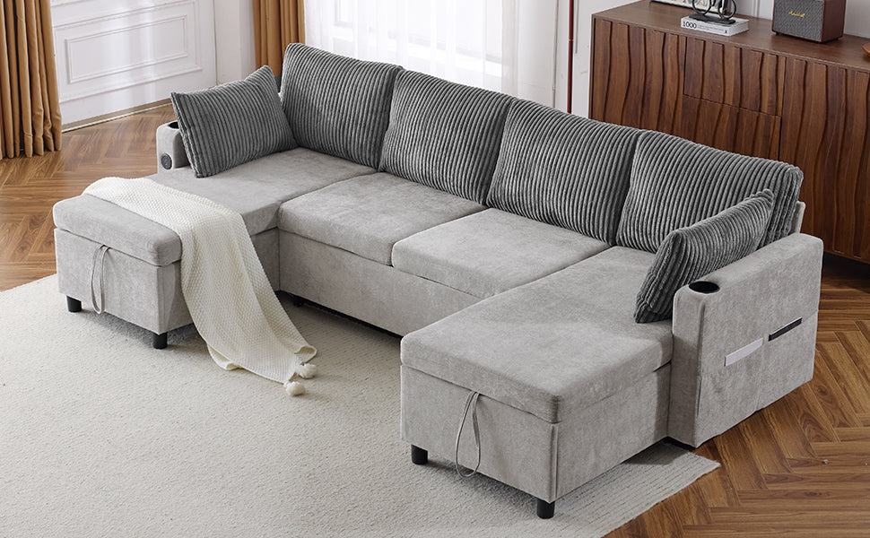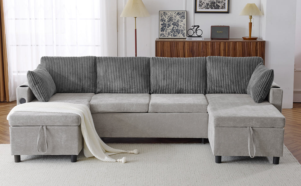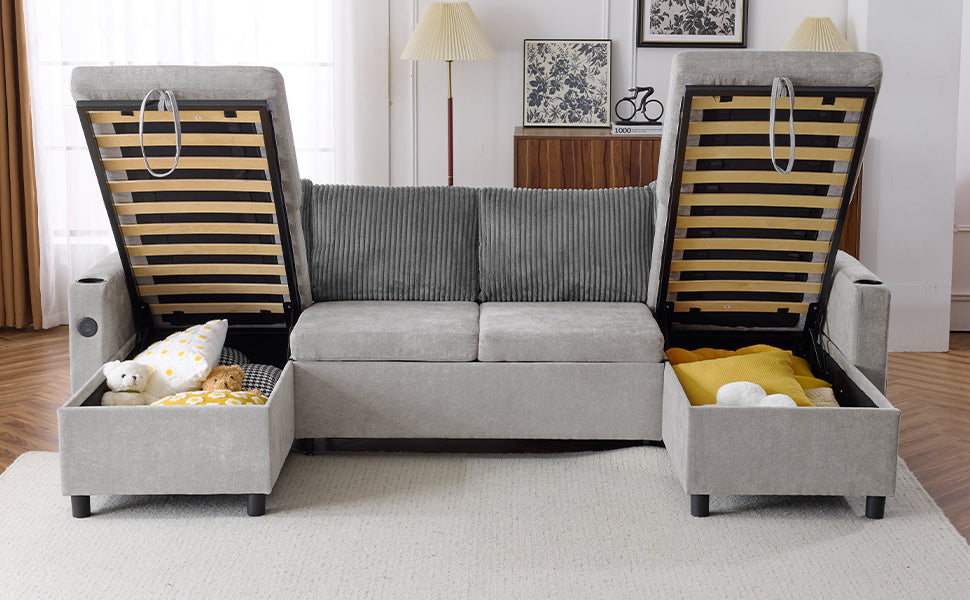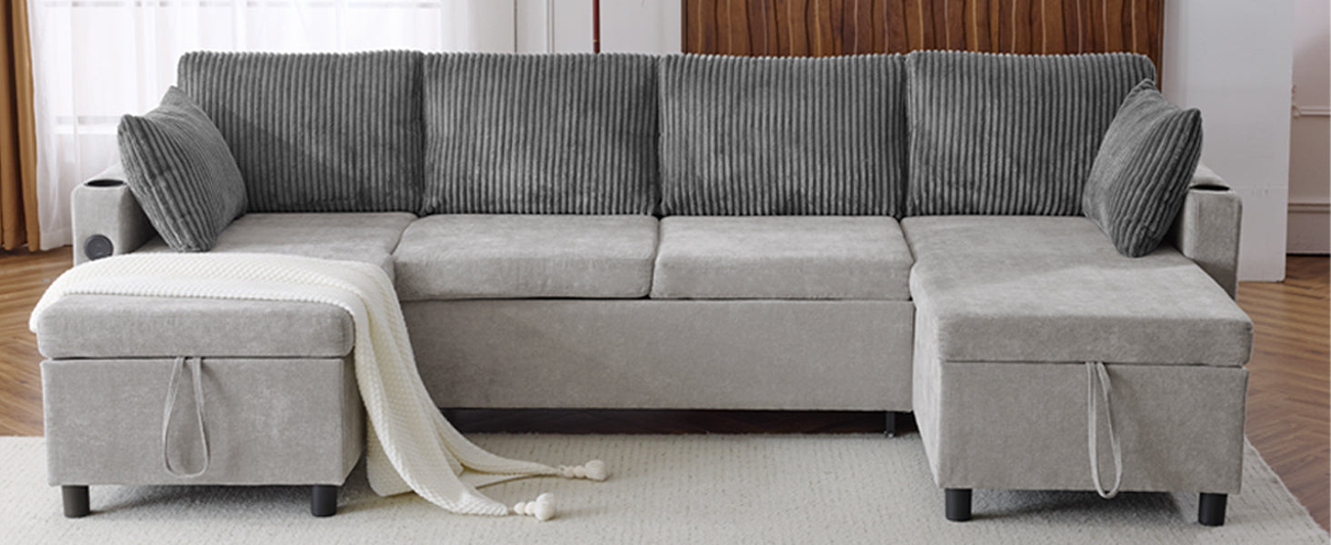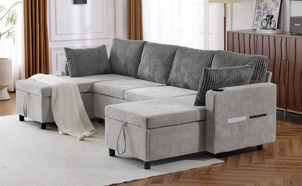 Versatile Grey Sectional Sofa Pull-out Bed with Storage, USB Ports & Cup Holders, Corduroy & Chenille Fabric, 111.8'