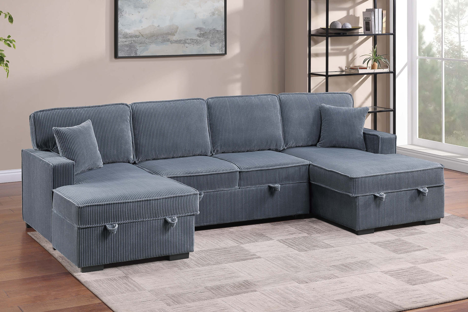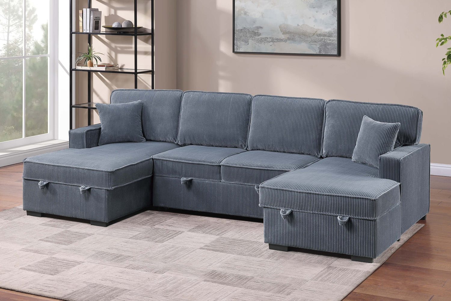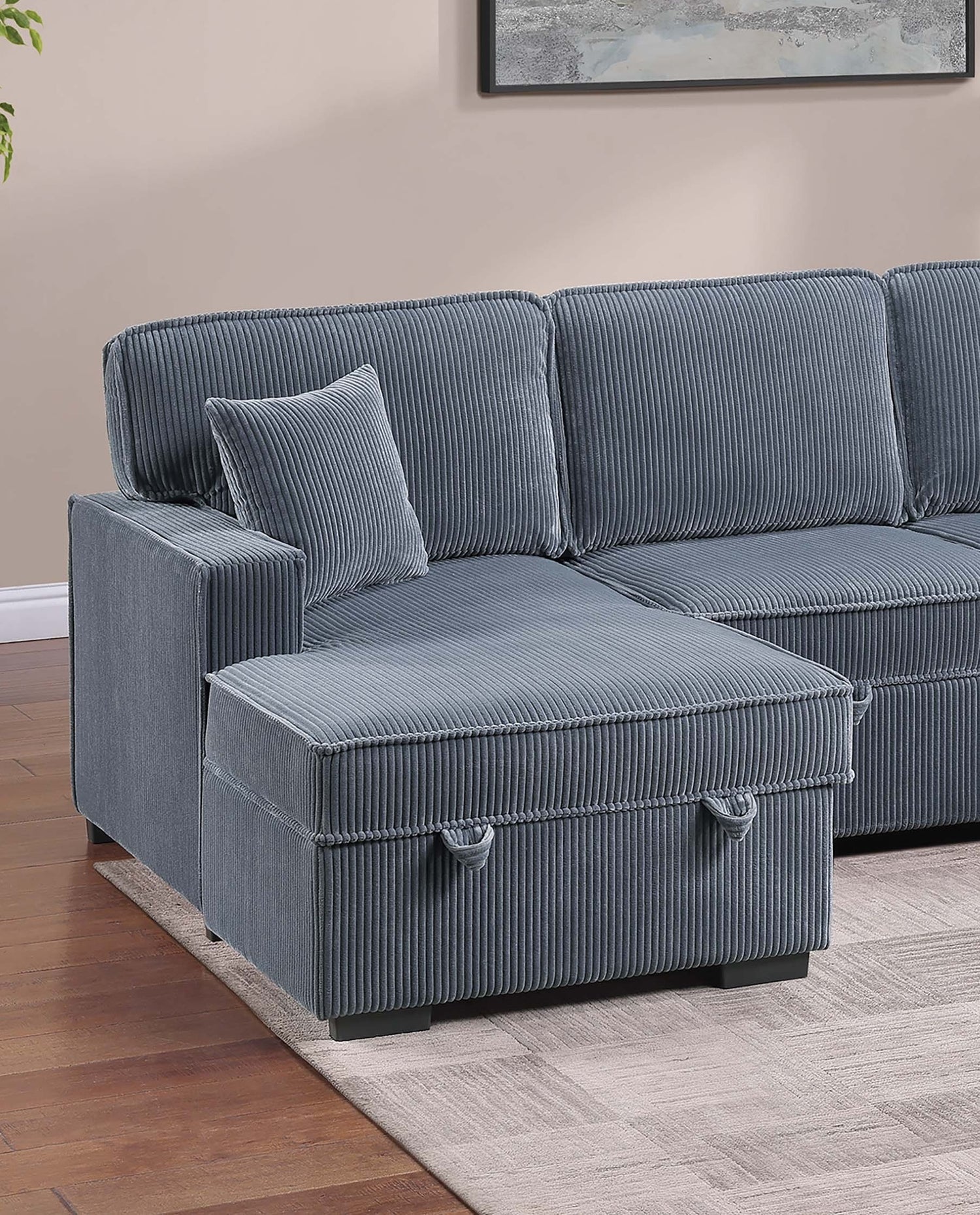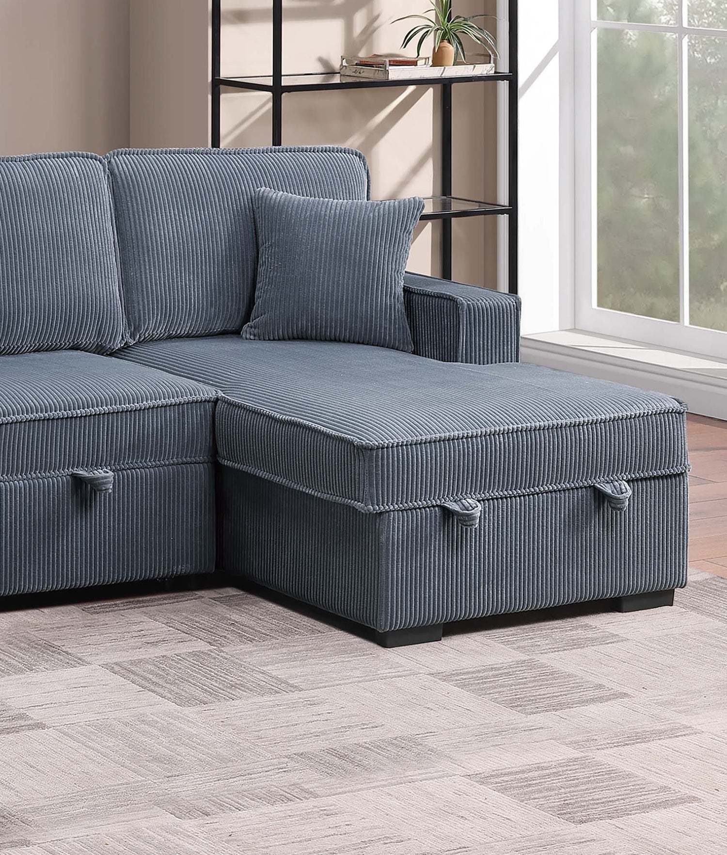 Convertible Sectional Upholstered Corduroy 3pc RAF And LAF Storage Chaises Pull Out Middle Section Dark Gray Finish Pillow Included Primary Living Room