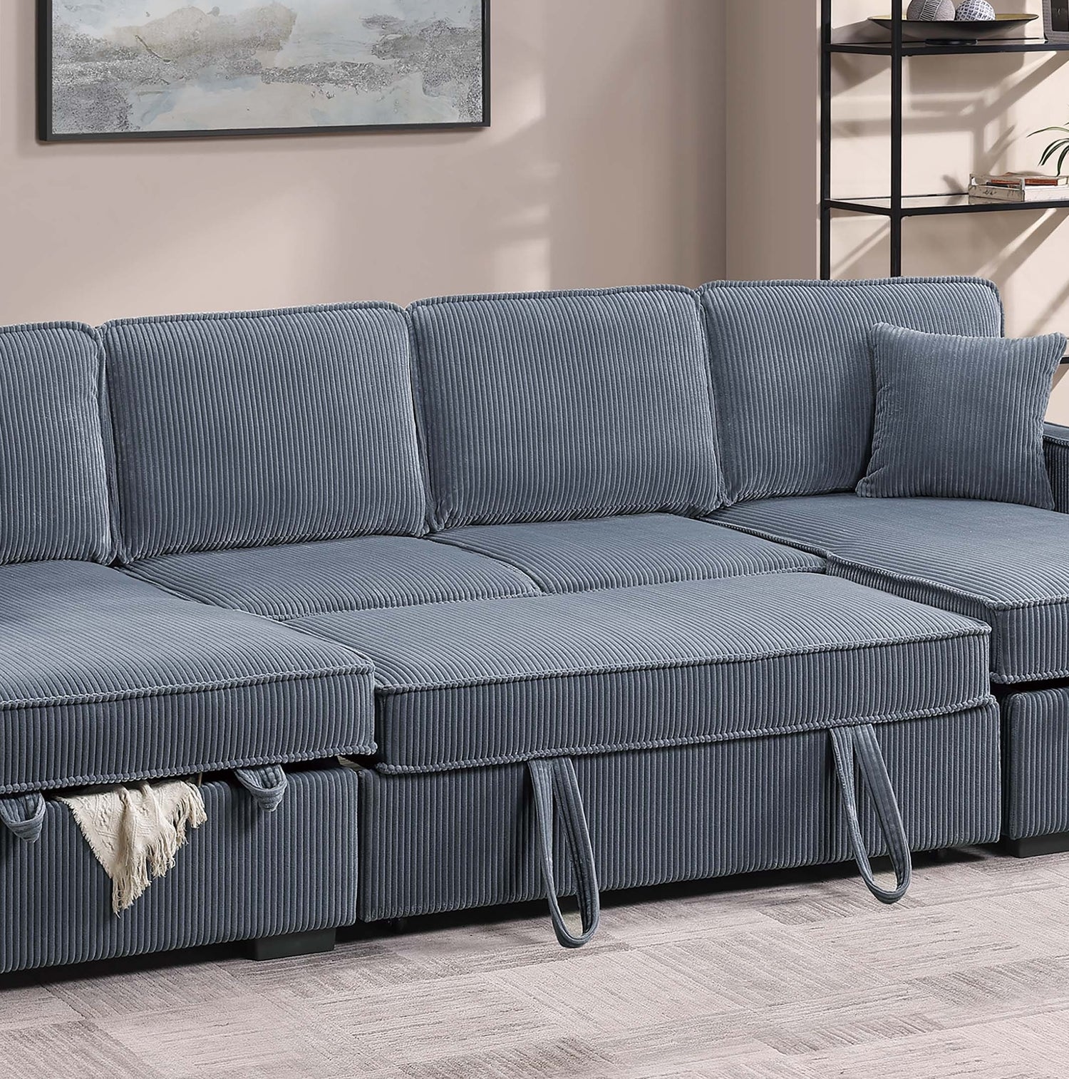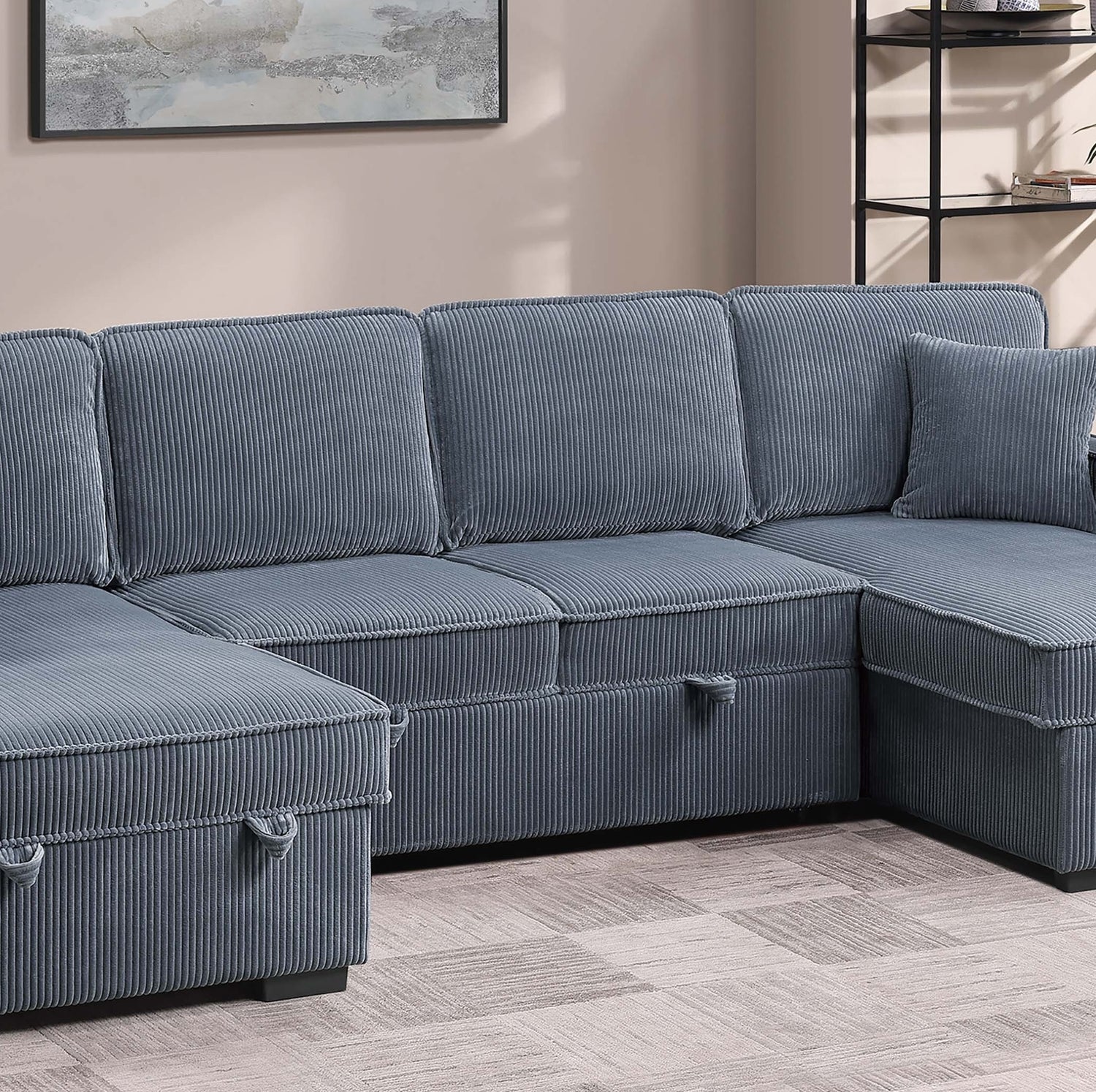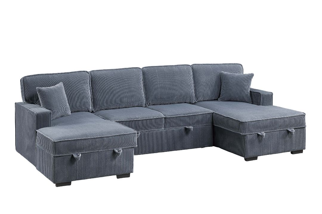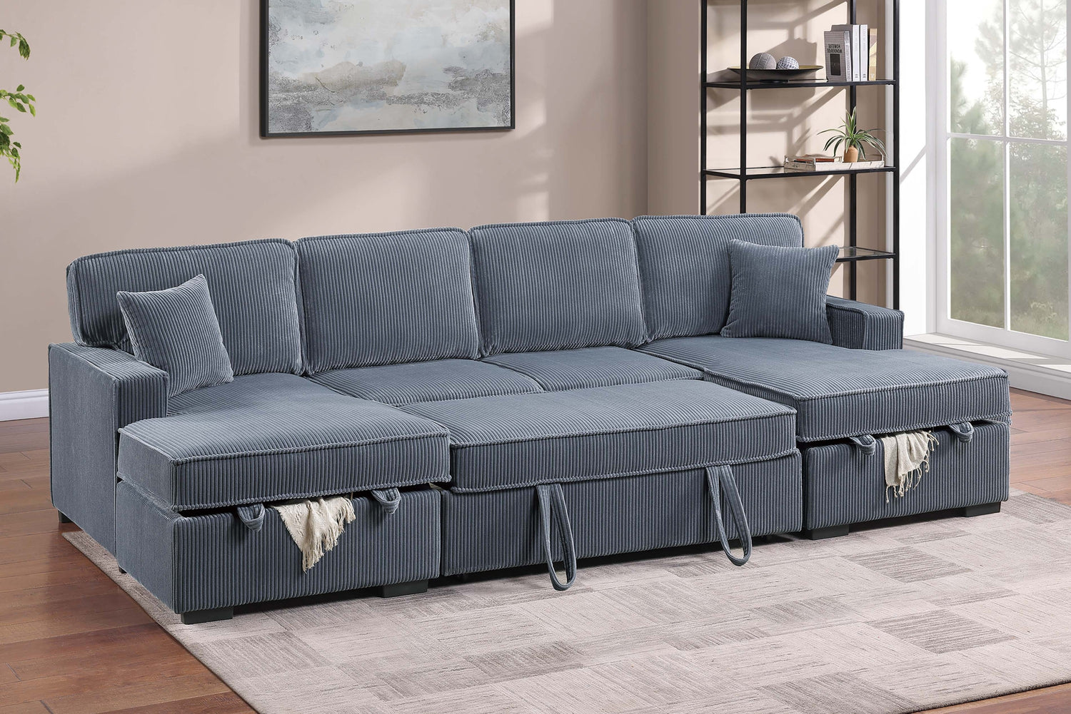 Convertible Sectional Upholstered Corduroy 3pc RAF And LAF Storage Chaises Pull Out Middle Section Dark Gray Finish Pillow Included Primary Living Room
