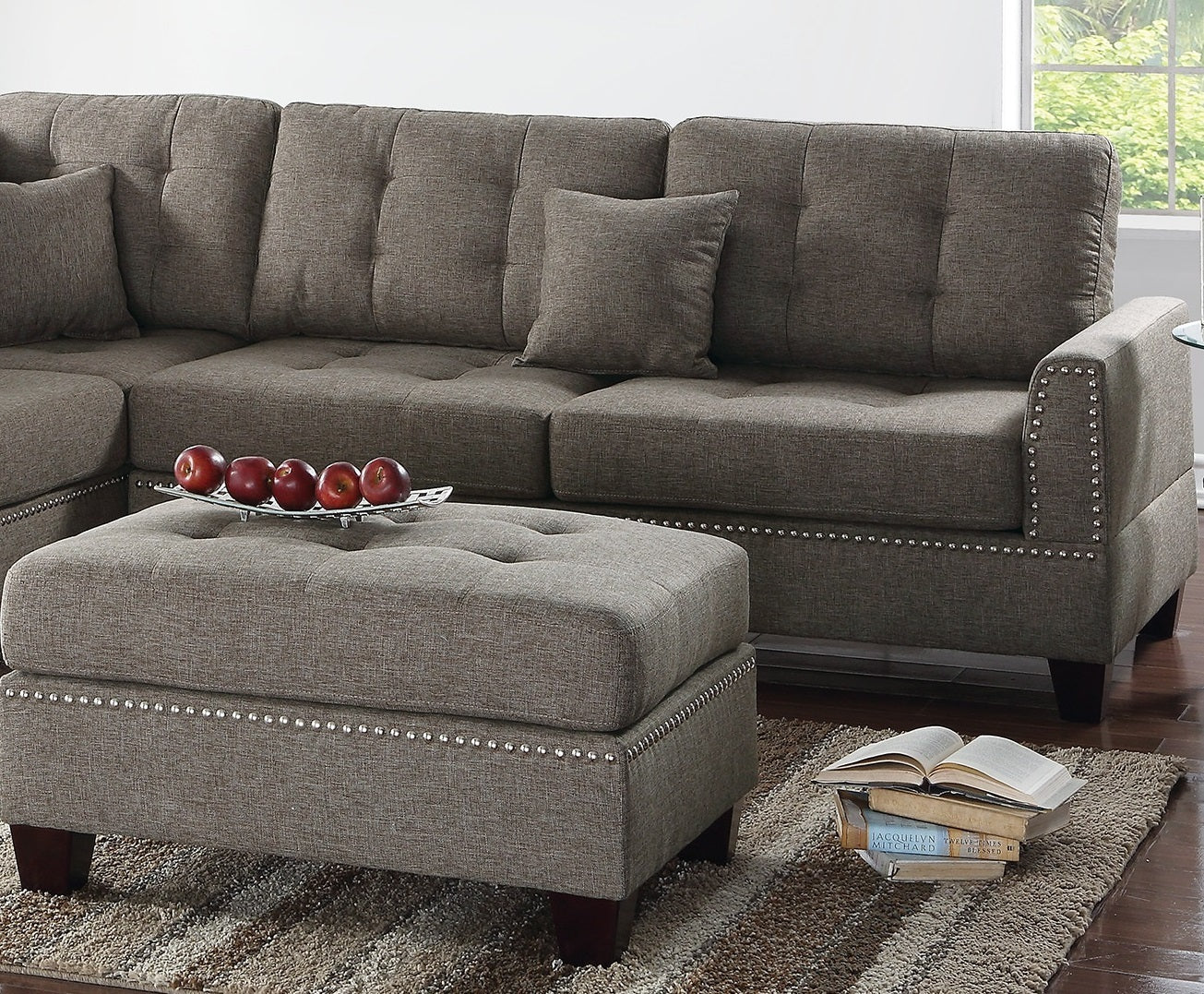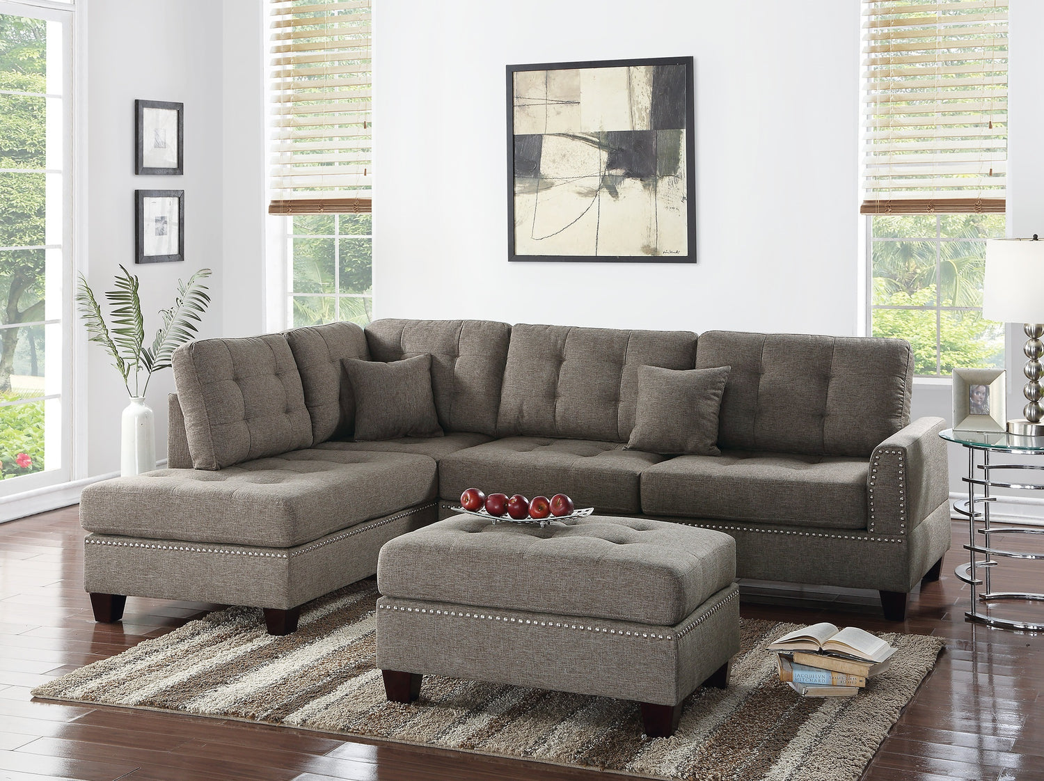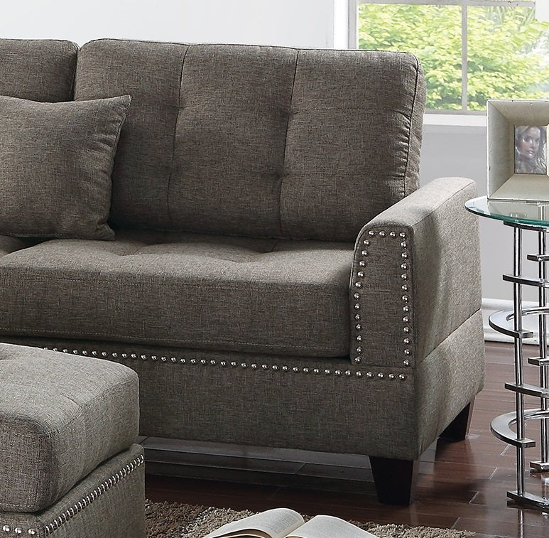 A chic design of fashionable flare is delivered with this 3-piece reversible sectional sofa covered in a smooth but functional fabric. The lower portion is trimmed with nickel-finished studs and the seating is of pure, plush comfort. This platform-framed sectional also features short wooden legs, accent tufted stitching, and a matching ottoman. Available in Coffee, Blue, or Citrus (Polyfiber (Linen-Like Fabric).