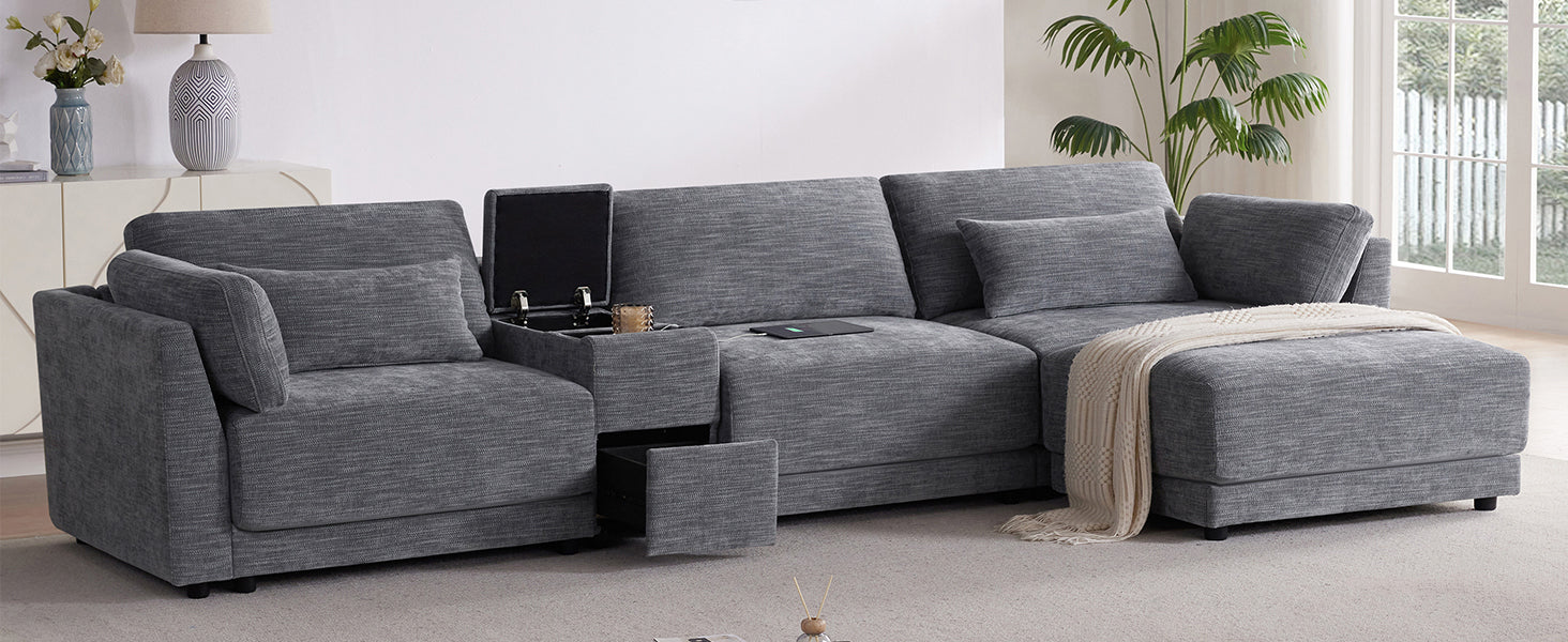 124'' L-Shaped Sectional Sofa with Multi-Functional Storage Console, Wired&Wireless Charger, Movable Ottoman, Wider&Thicker Cushion, Free Combination for Living Room&Apartment, Chenille is available