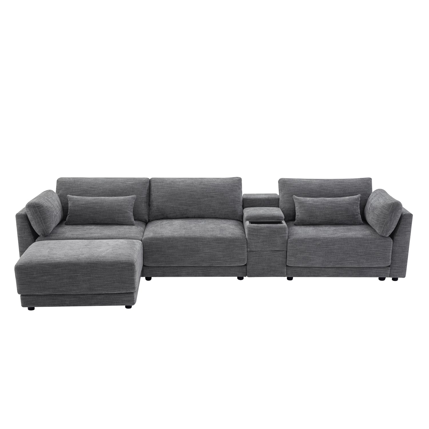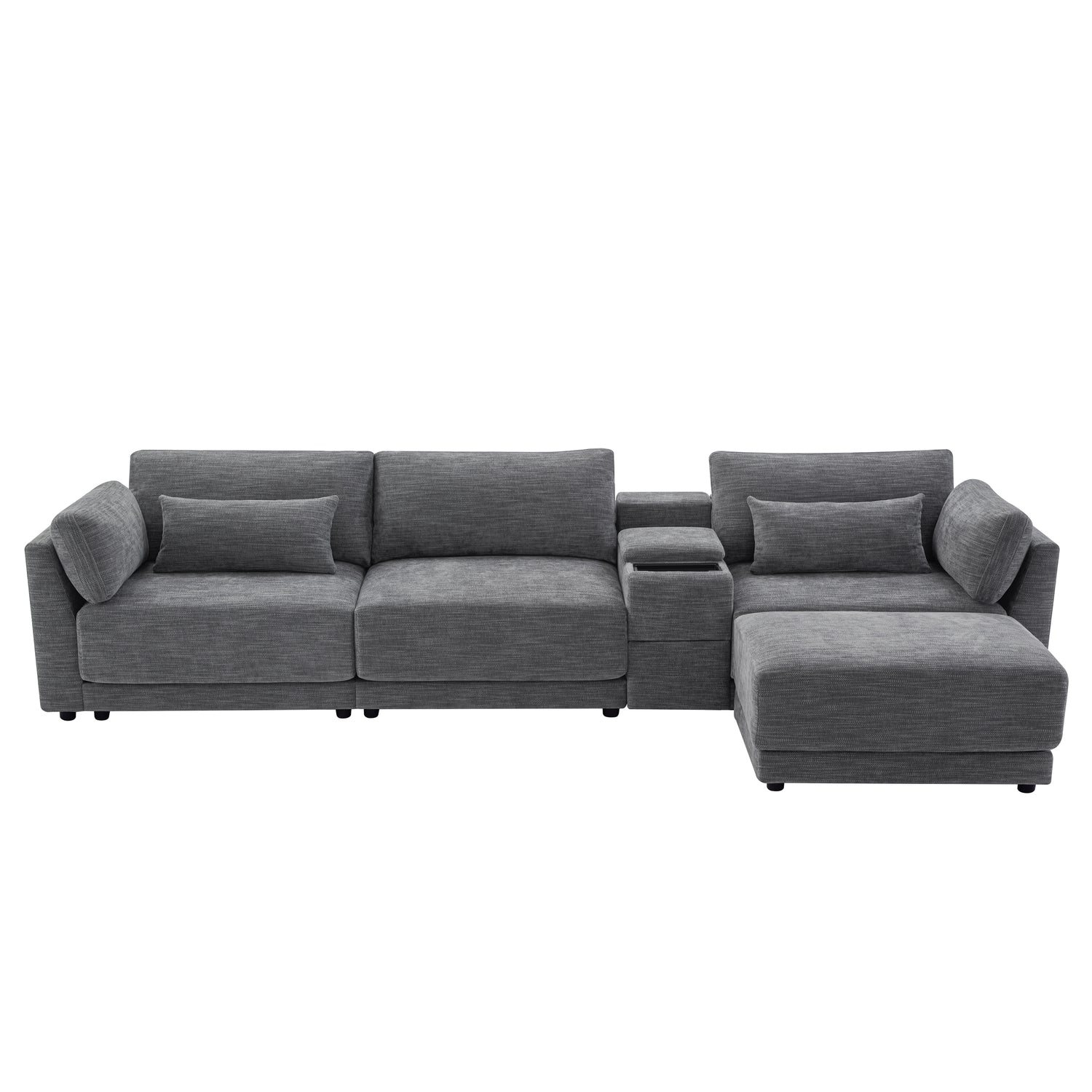 124'' L-Shaped Sectional Sofa with Multi-Functional Storage Console, Wired&Wireless Charger, Movable Ottoman, Wider&Thicker Cushion, Free Combination for Living Room&Apartment, Chenille