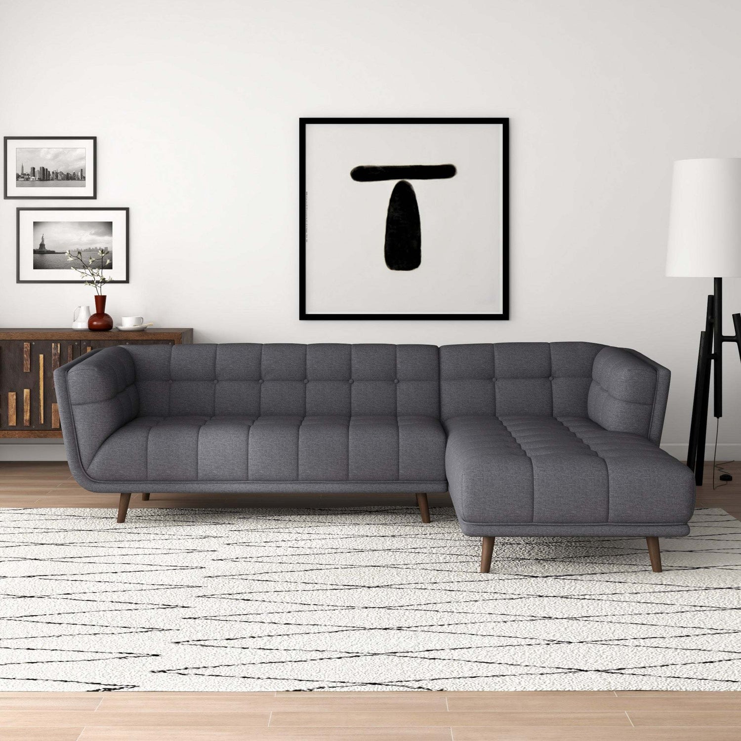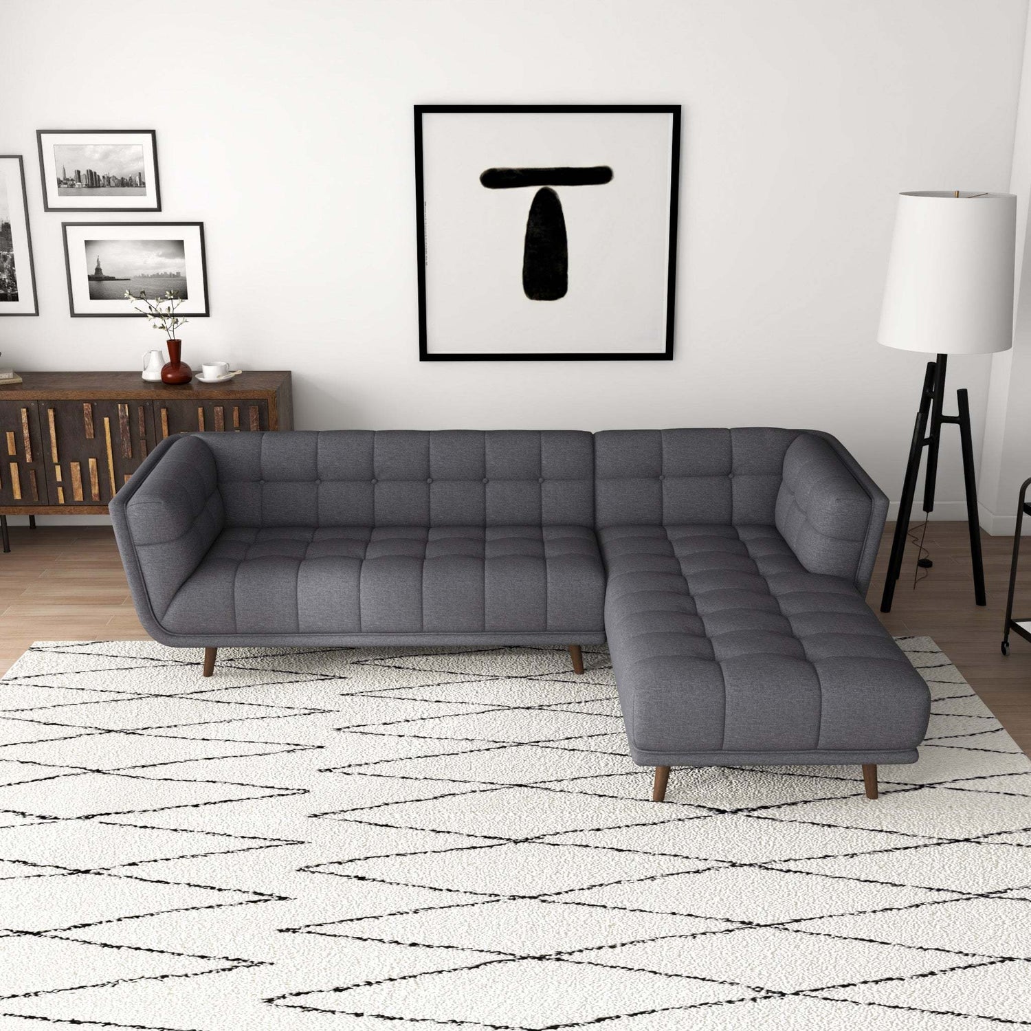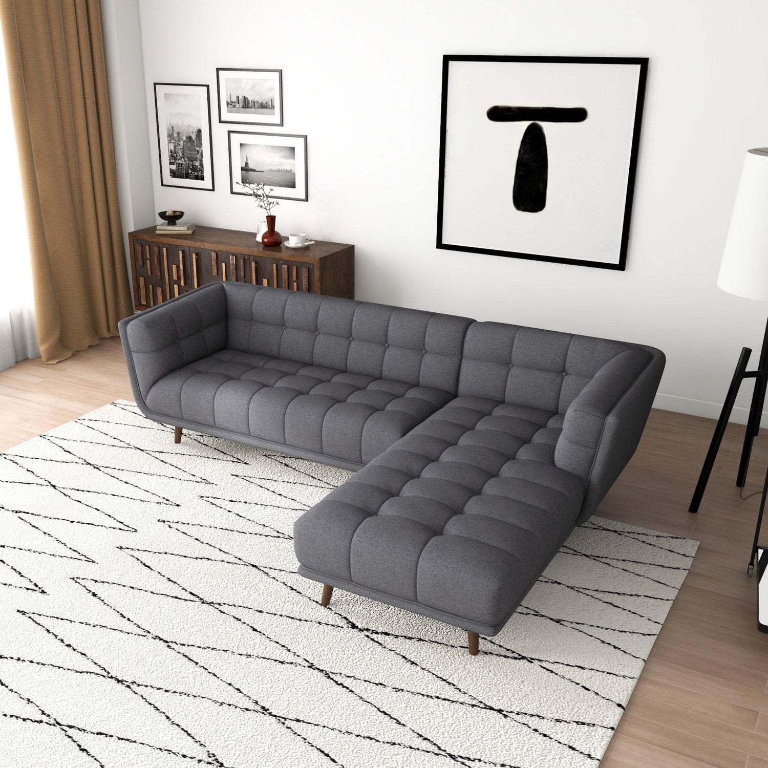 • This sofa-and-chaise sectional brings mid-century modern style to your living room with its clean lines and pillows.