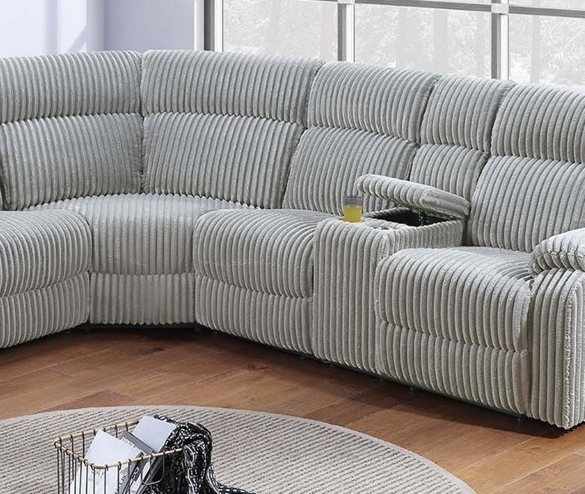 Relax in ultimate comfort with this stunning manual motion recliner sectional, thoughtfully designed to enhance your living space. Upholstered in a luxurious fur-like corduroy material, its soft texture invites you to unwind and feel at ease. The elegant ash color adds a contemporary touch, effortlessly blending with a variety of décor styles while providing a sense of warmth and sophistication. This sectional comfortably seats up to five people, making it perfect for family gatherings or casual evenings with friends. Each reclining seat features a smooth manual handle on the side, allowing you to kick back and enjoy personalized comfort at your convenience. The ergonomic design ensures optimal support for your back and legs, turning every moment of relaxation into a luxurious experience. Convenience meets functionality with the inclusion of two consoles, each equipped with cup holders, keeping your favorite beverages and essentials within arm’s reach. Whether you’re enjoying a quiet night or hosting guests, these thoughtful features add practicality to your space without compromising on style.