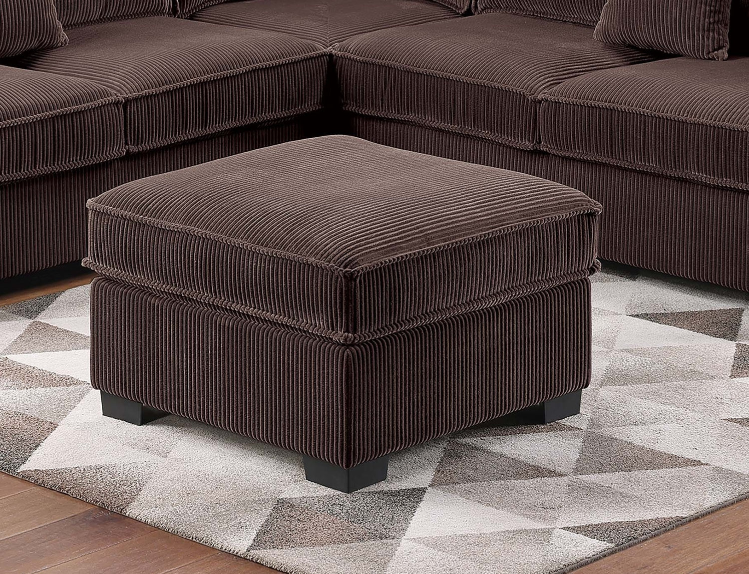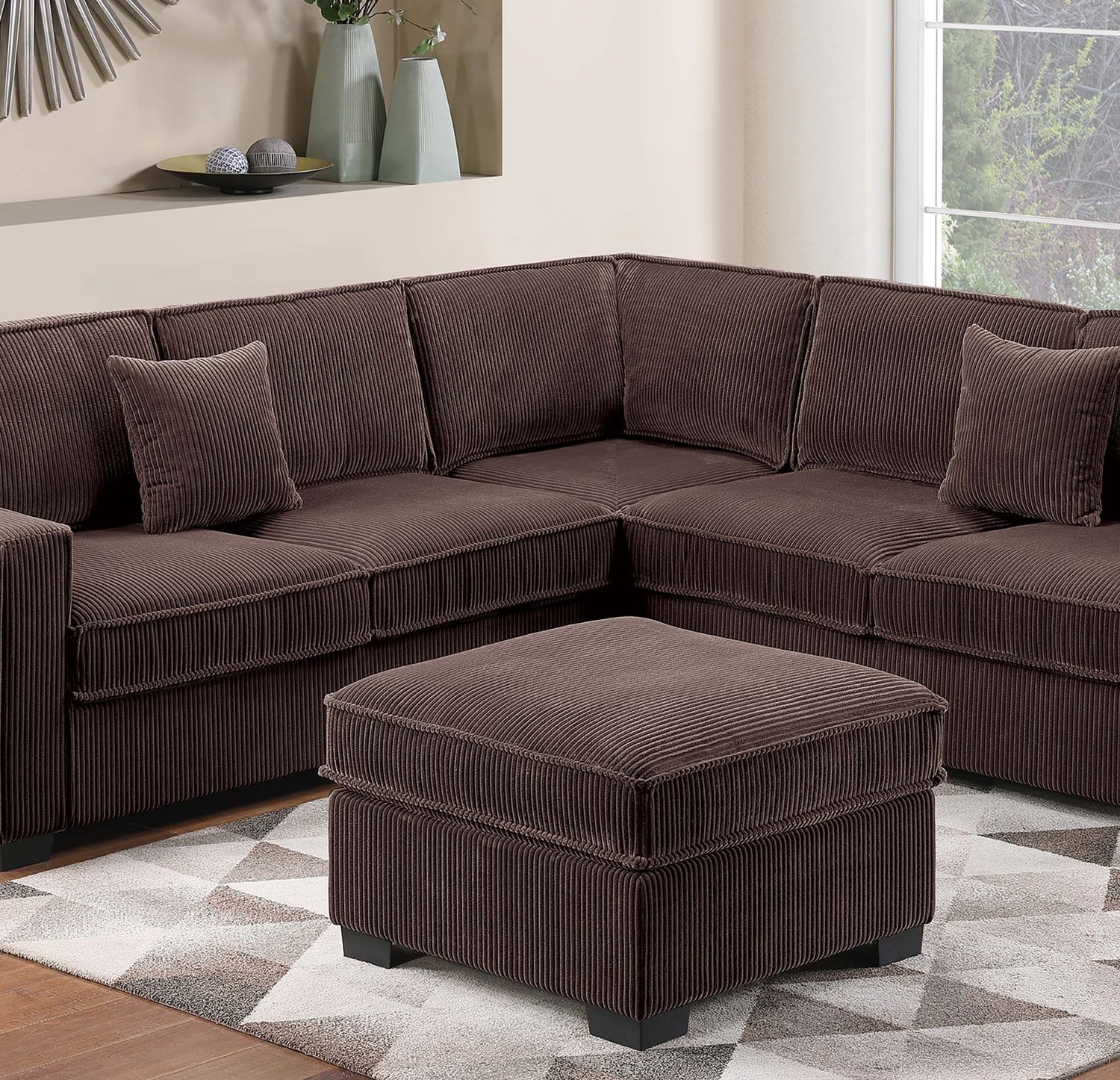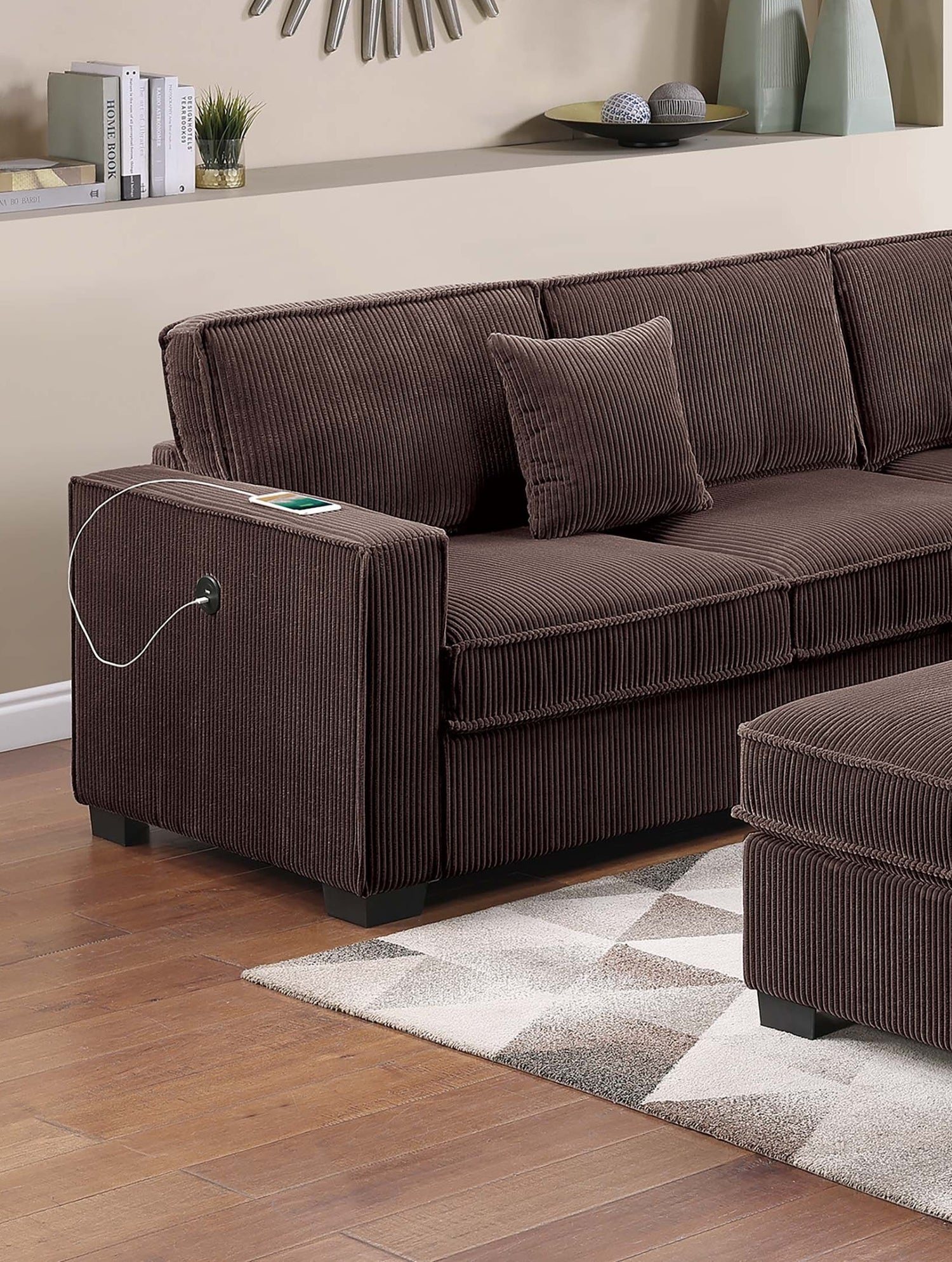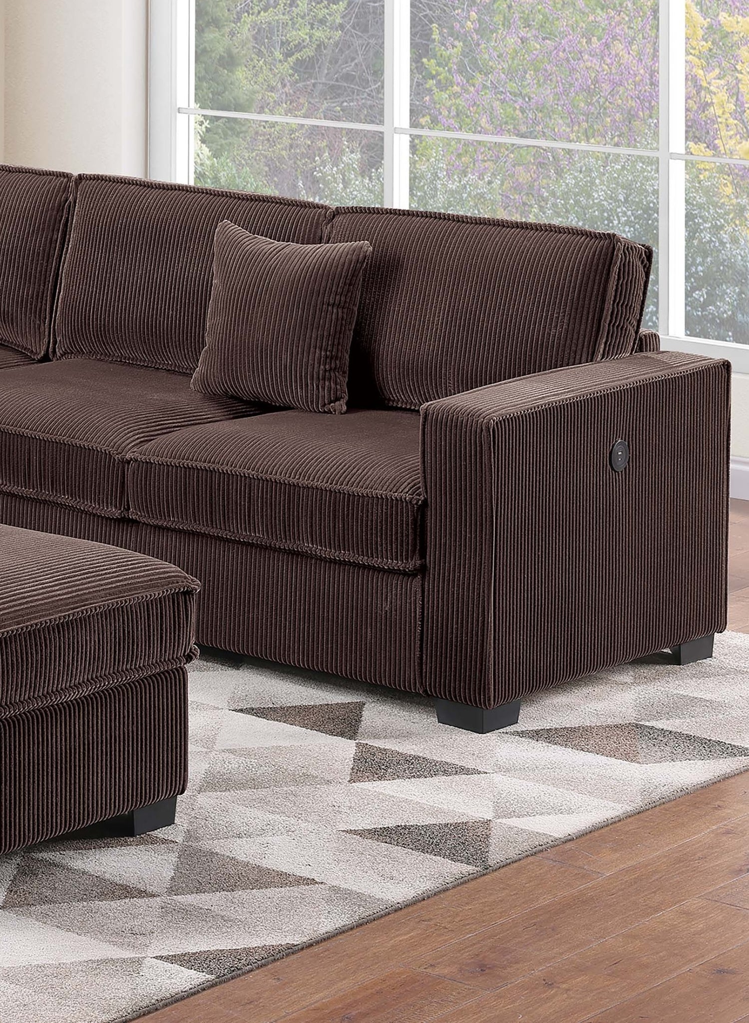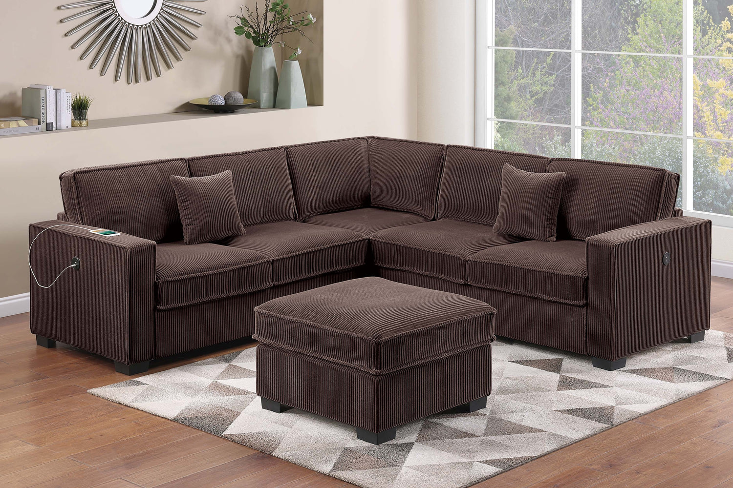 Transform your living room into a space that invites comfort, conversation, and relaxation with this 4-Piece Sectional Set, thoughtfully designed to balance modern function and casual style. Wrapped in cozy corduroy fabric, every seat feels soft to the touch and adds a warm, inviting texture to your home. This sectional includes a Left-Arm and Right-Arm Facing Loveseat, a Corner Wedge, and a matching Cocktail Ottoman—all crafted to create a cohesive and relaxed layout. The sectional offers generous seating for gatherings or quiet nights in, whether you're hosting friends or enjoying your favorite shows, this piece adapts to your routine with ease and comfort. This Sectional features built-in USB ports, so you can stay connected without leaving your seat. Keep your phone charged while you unwind, stream, or scroll. The Corner Wedge smoothly joins both loveseats, creating a seamless transition that rounds out the sectional’s silhouette and adds a natural conversational flow to the room. The coordinating Cocktail Ottoman is the perfect multipurpose piece. Use it as a footrest, extra seating, or an impromptu coffee table—it’s a flexible addition that completes the set while offering practical use in a compact size. The plush corduroy upholstery, with its inviting ridged texture and soft finish, adds a layer of visual interest while encouraging you to sit back and stay awhile. Wide seat cushions and ample back support create a cozy setting whether you're lounging, reading, or spending time with family. Pair this sectional with neutral tones, layered throw blankets, and accent pillows for a relaxed, homey atmosphere.