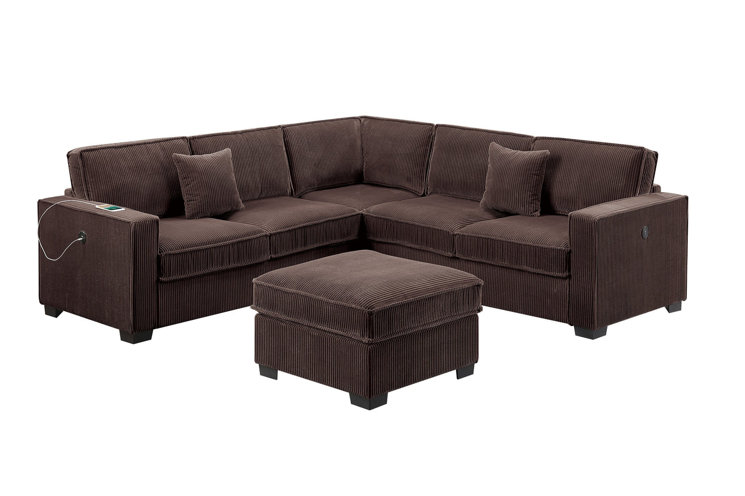Modern Style 4pc Sectional Set Right Arm And Left Arm Loveseat USB Port Plastic Legs Cocktail Ottoman Matching Two Pillows Chocolate Finish Primary Living Room is available