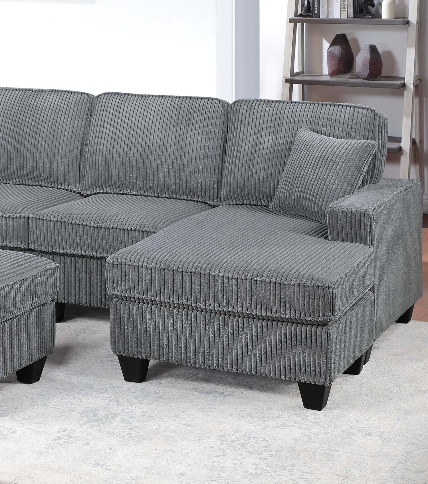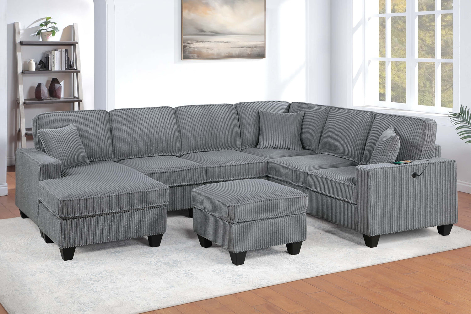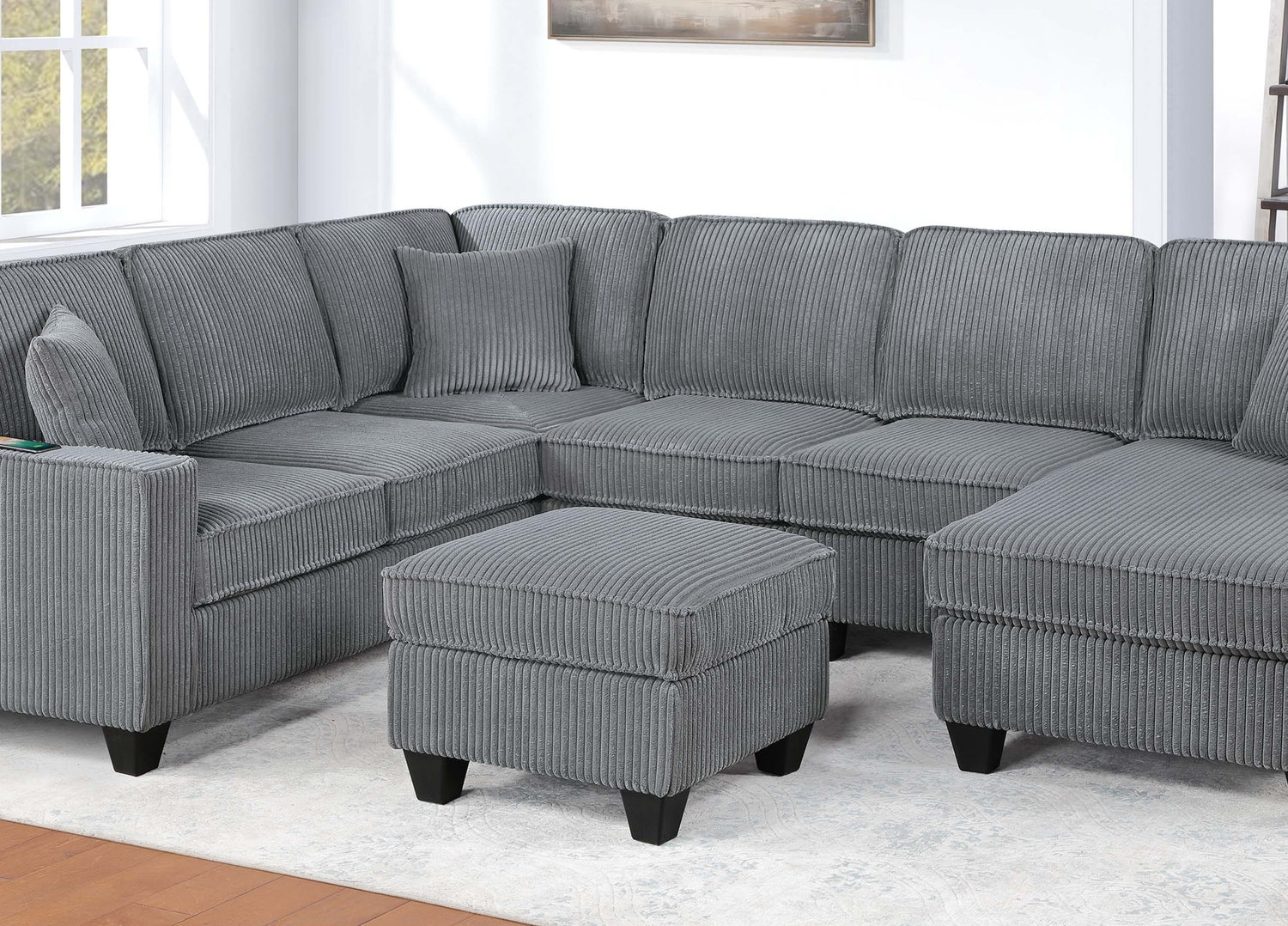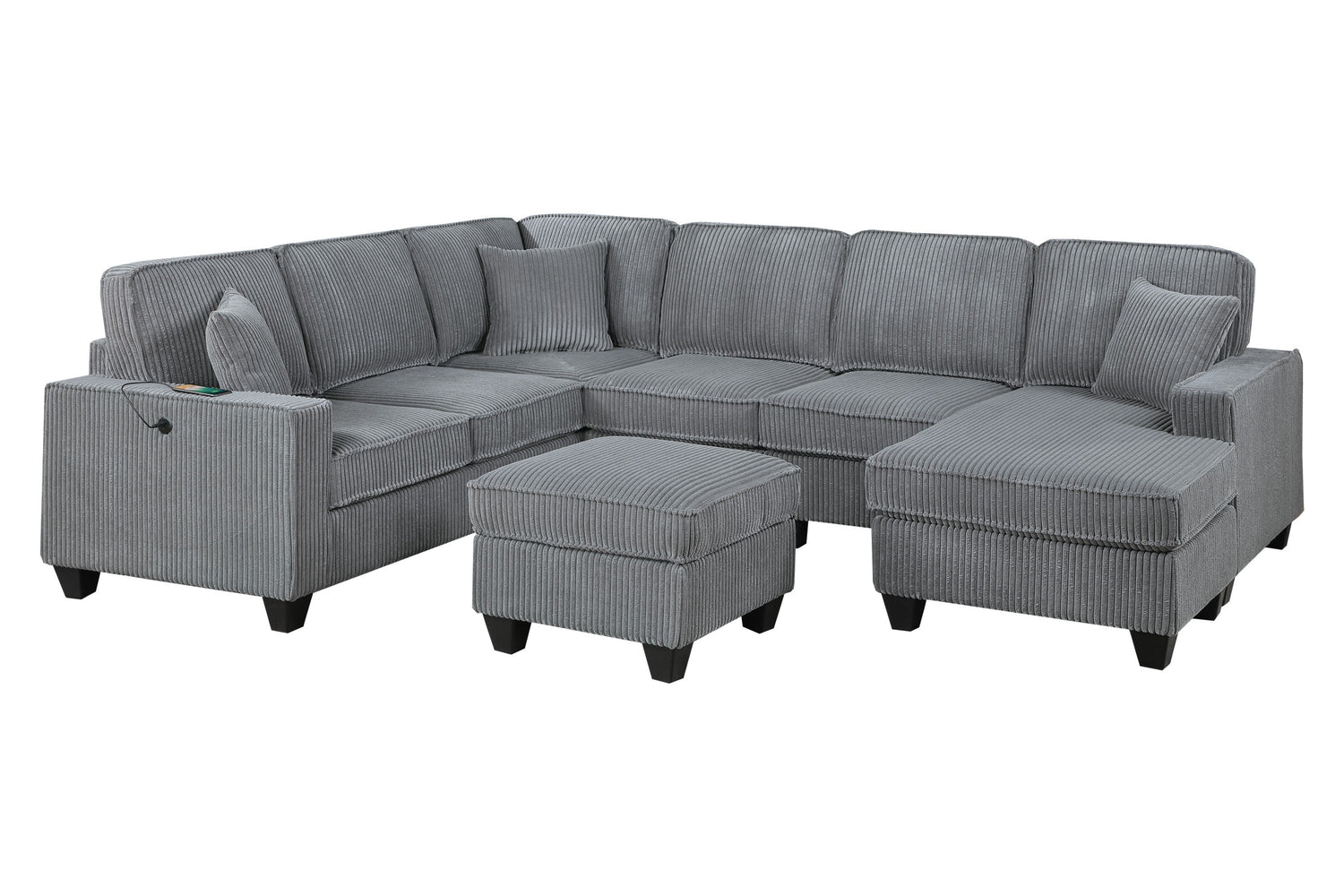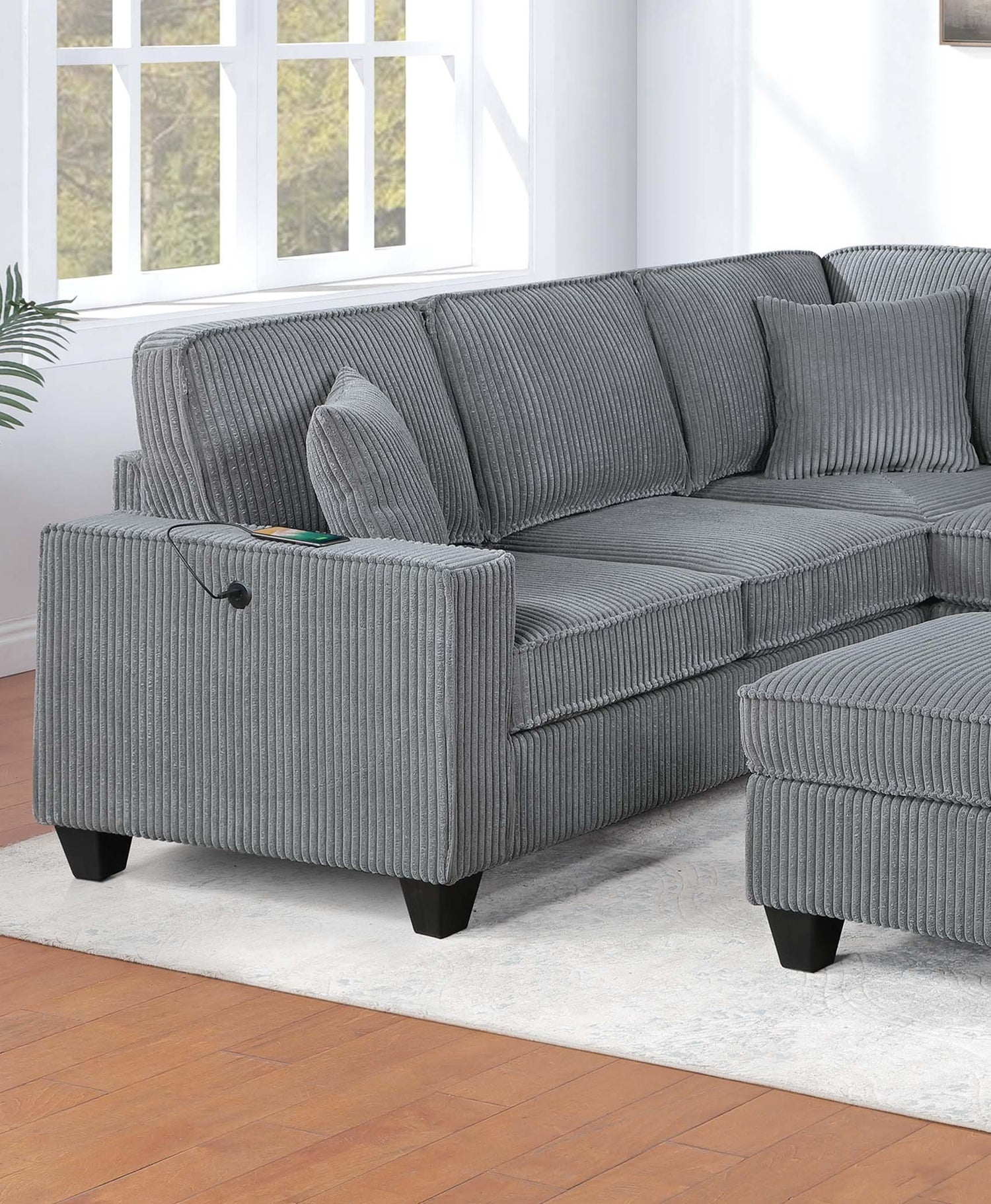This 5-Piece Sectional Set redefines your living space with modern elegance. Crafted in plush corduroy, this sectional seamlessly combines style with functionality. Thoughtfully designed for both function and flow, this collection forms a spacious U-shaped layout—perfect for movie nights, weekend gatherings, or stretching out solo after a long day. Wrapped in ultra-soft corduroy, every inch of this sectional invites you to sink in and relax. The distinct texture brings warmth and character to your space, while the plush seat and back cushions provide an inviting feel you can enjoy every day. Whether you're sitting upright for conversation or reclining into your favorite lounging position, this sectional supports the rhythm of real life. This set includes five distinct pieces that come together to create a seating arrangement that feels tailored to your space. The RAF Loveseat with Chaise offers a generous place to kick up your feet, while the LAF Loveseat with USB ports gives you a convenient charging station right at your side—perfect for keeping your devices close and powered without interrupting your downtime. At the center, the Corner Wedge smoothly connects each arm, creating an open U-shape that encourages face-to-face conversations and easy flow. The Armless Chair seamlessly blends into the layout, offering additional seating without breaking the clean lines of the design. Completing the ensemble is the Cocktail Ottoman an adaptable piece that works as a footrest, extra seat, or even a casual table for serving trays and books. Move it where you need it most—it’s as flexible as your lifestyle. With its tailored proportions