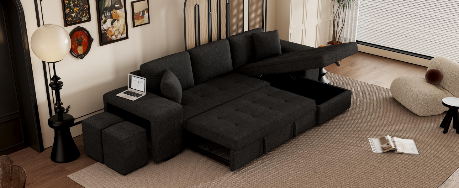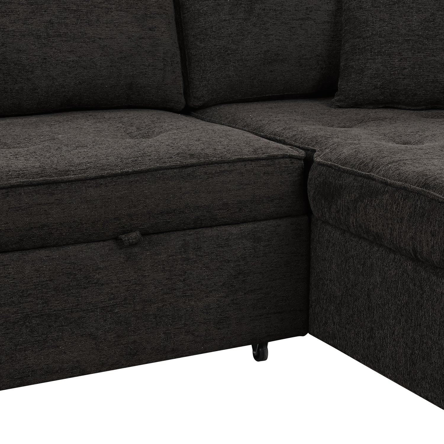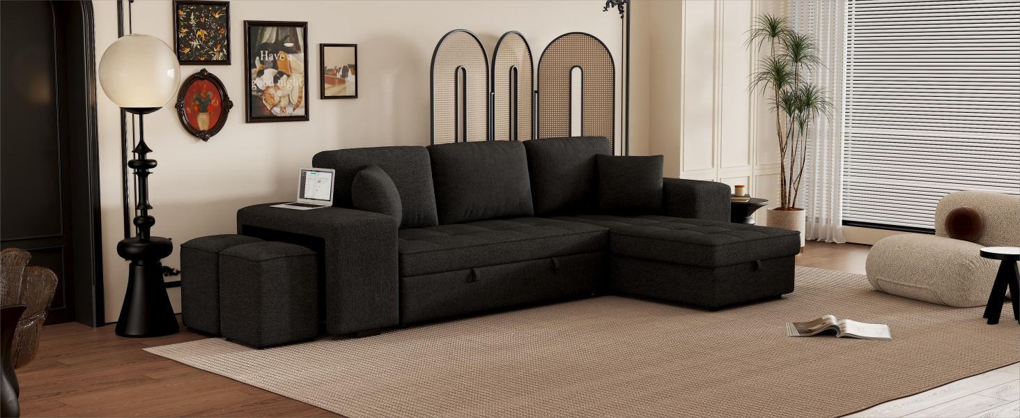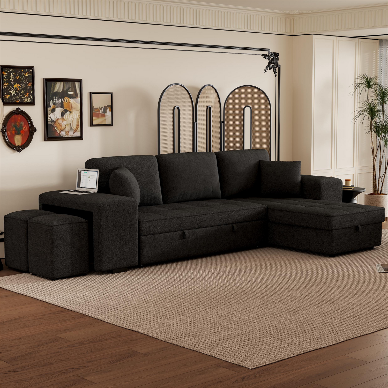 Modern L-Shape 3 Seat Reversible Sectional Couch with Pull Out Sleeper Sofa, Storage Chaise, 2 Stools, Charcoal Grey, Linen Chenille is available