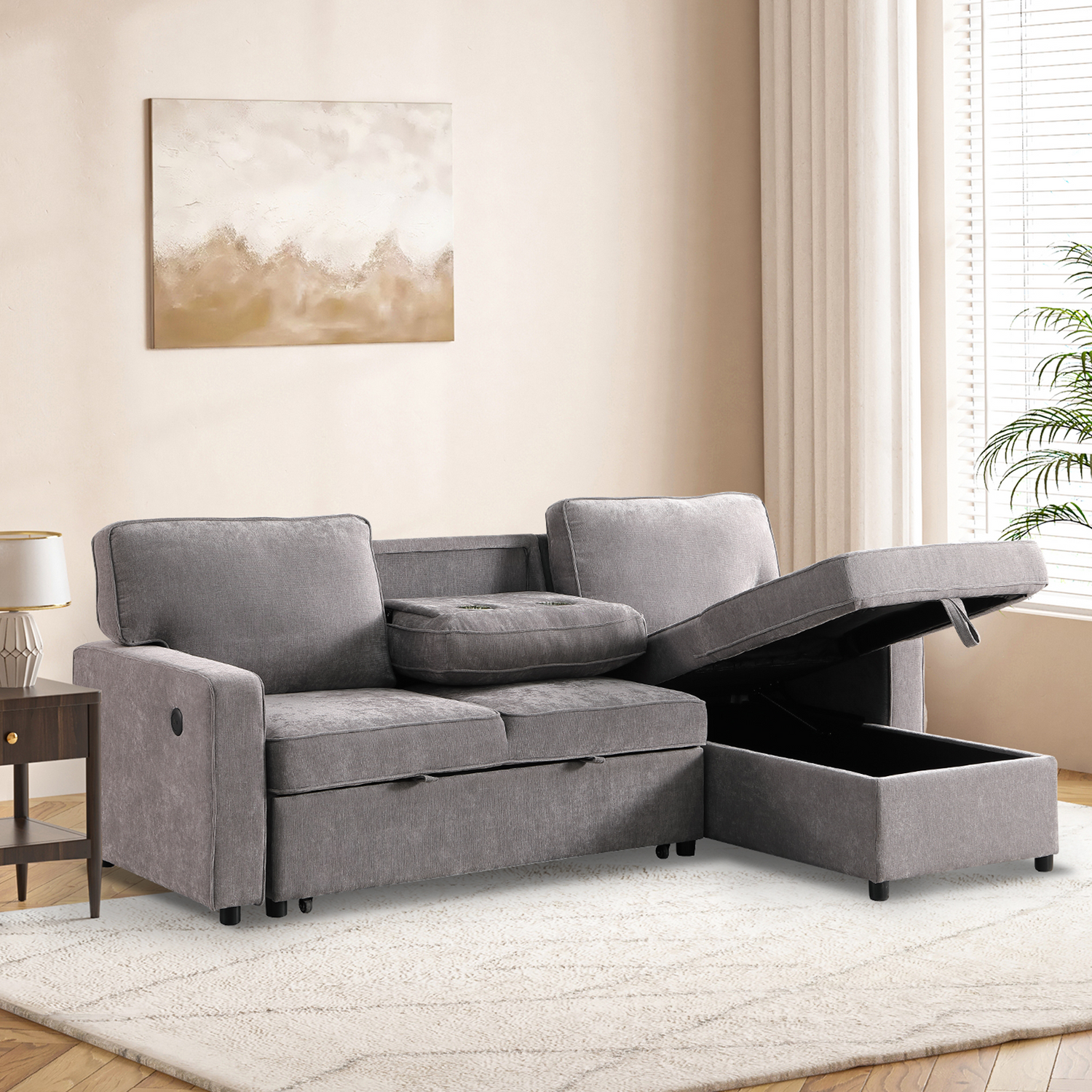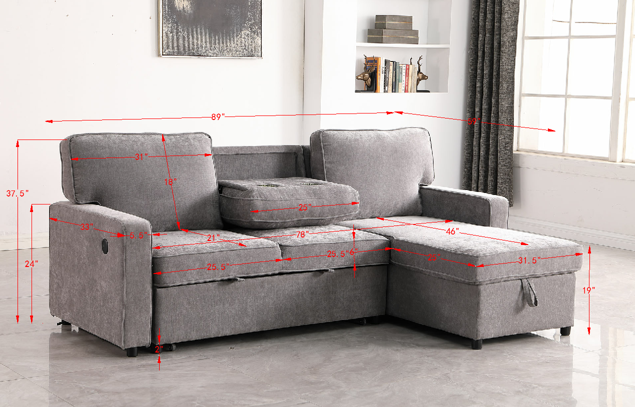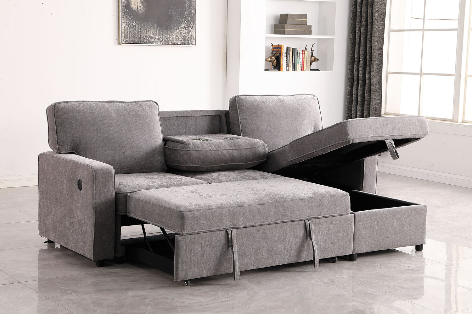 Upholstery Sleeper GREY Sectional Sofa with Storage Space, USB port, 2 cup holders on Back Cushions is available