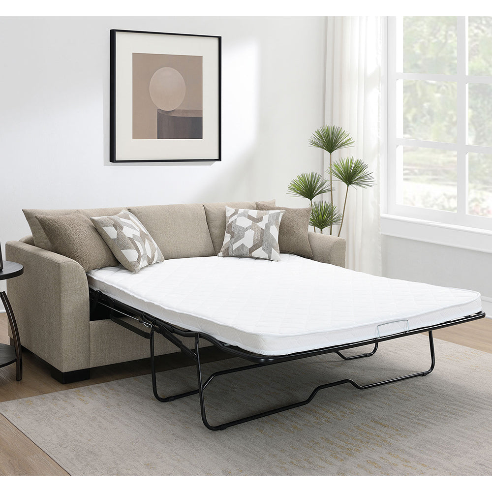 This modern sleeper sectional with chaise turns a casual hangout into an instant guest space, using a smooth pullout that stays comfortable by day and supportive at night. Four patterned pillows finish the look, and a fully encased frame delivers dependable structure for everyday lounging.