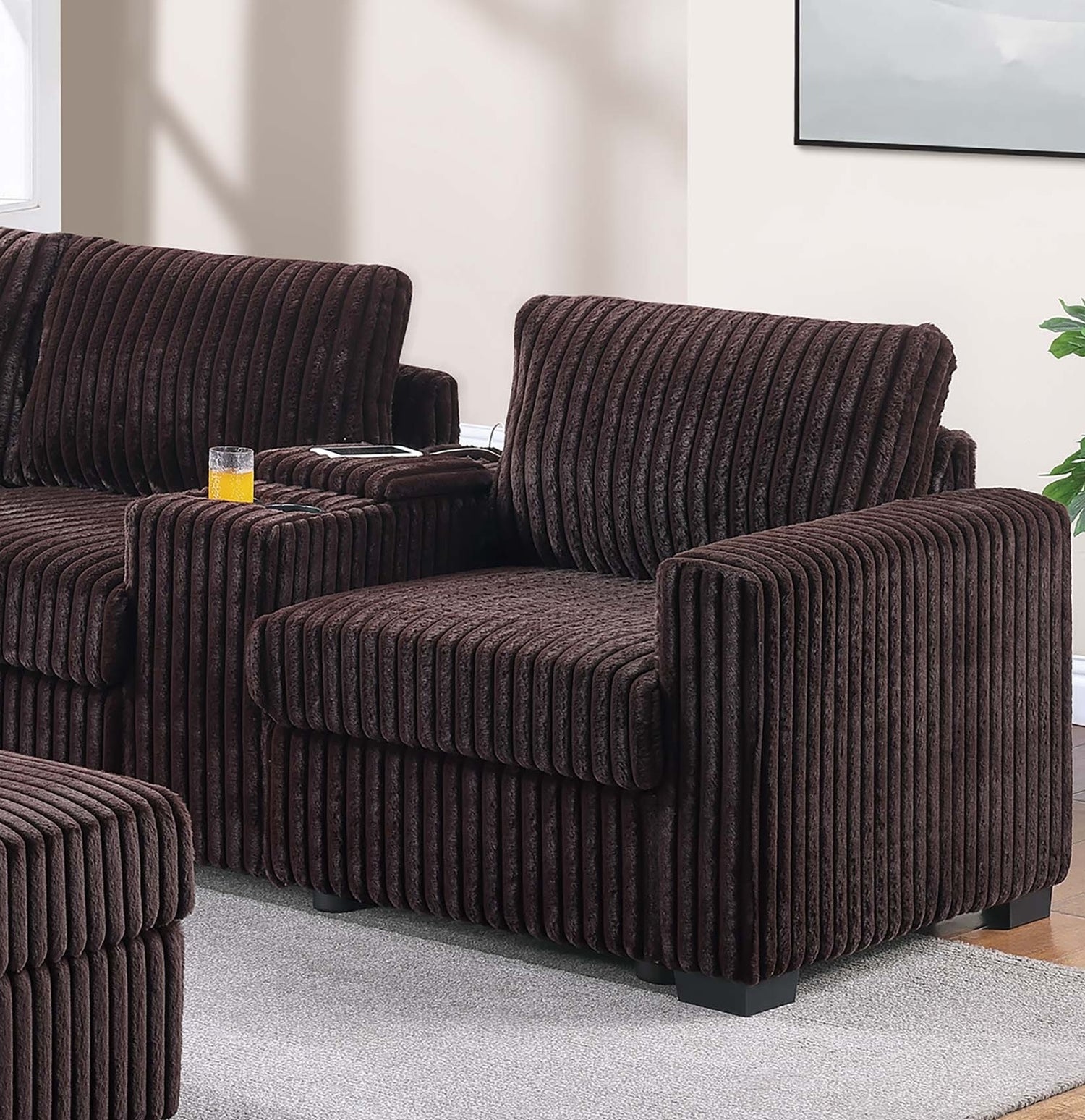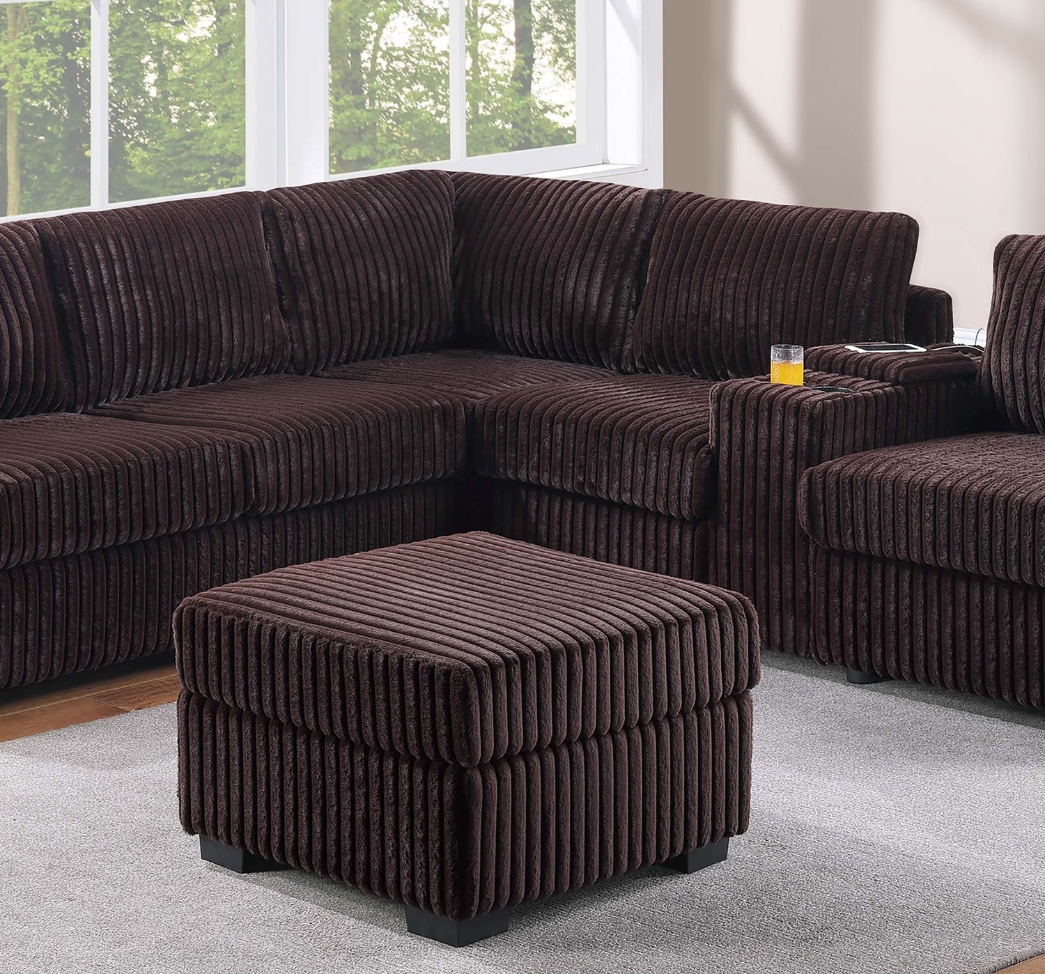his 4-Piece L-Shaped Sectional Set with Ottoman is designed to accommodate both relaxation and entertainment, making it an ideal choice for modern homes. Wrapped in Fur-Like Jumbo Corduroy, this sectional delivers a soft and textured feel that enhances the overall comfort. Designed with an L-shaped layout, this sectional maximizes seating space while maintaining a stylish and streamlined silhouette. Whether you're hosting guests, lounging with family, or enjoying a quiet moment alone, the configuration allows for optimal relaxation and functionality. The included ottoman offers additional leg support or can be used as a coffee table or extra seating when needed. Functionality is at the forefront of this design, with one of the loveseats featuring a built-in console equipped with convenient USB ports and cup holders. Whether you're charging your devices or keeping your favorite beverages within reach, this thoughtful addition enhances your relaxation experience. For added flexibility, both the loveseat and the console are fully reversible, allowing you to adapt the layout to suit your space and preference.