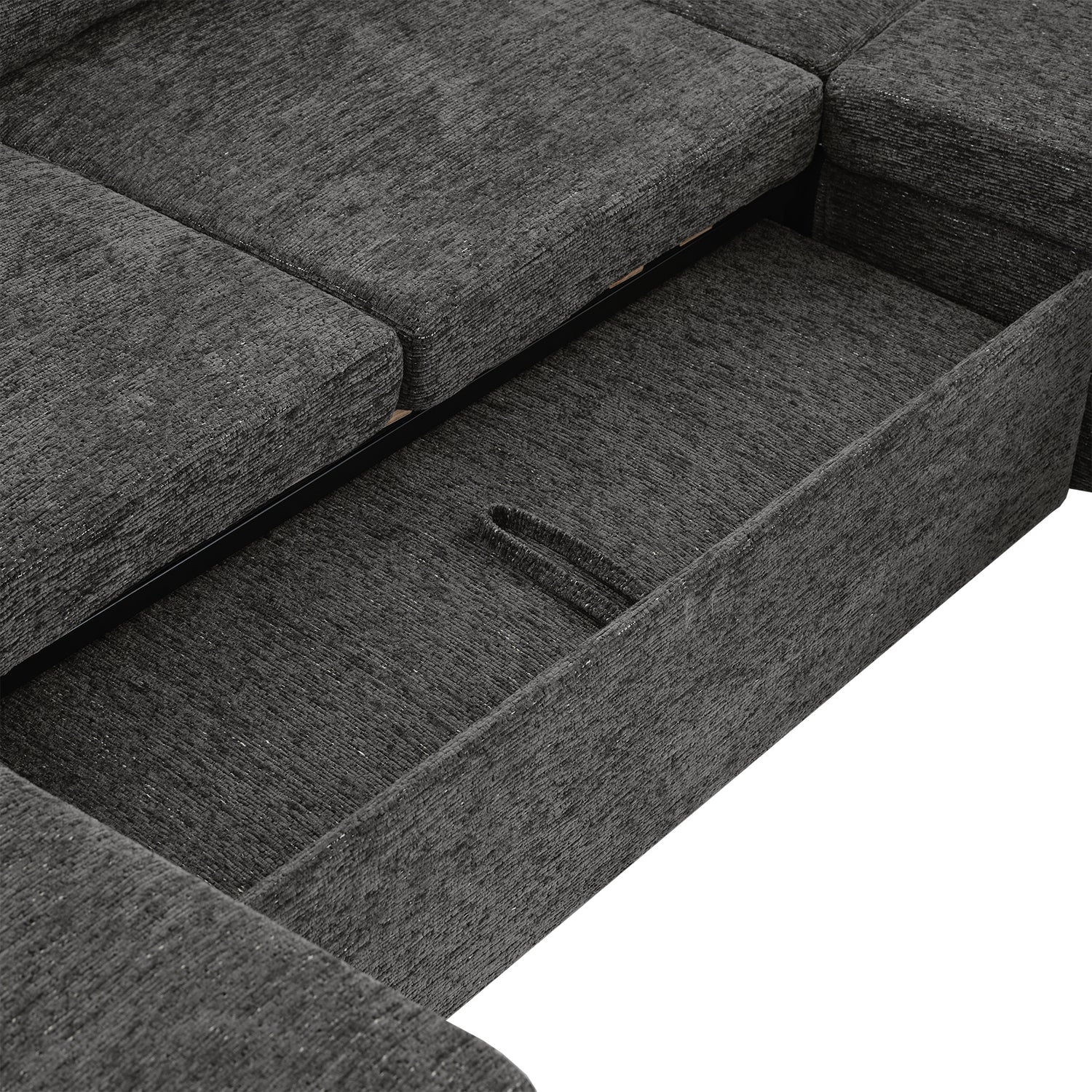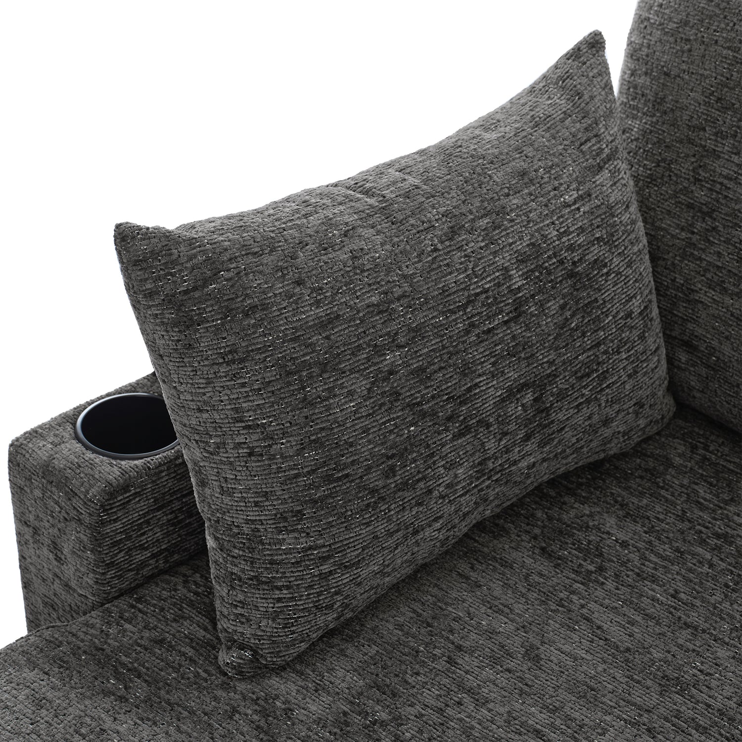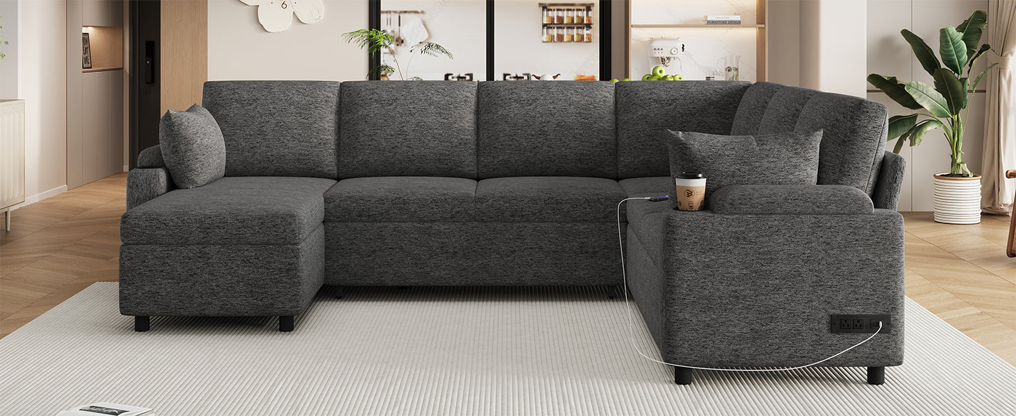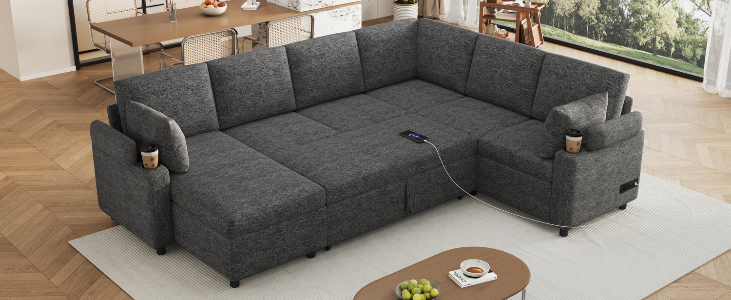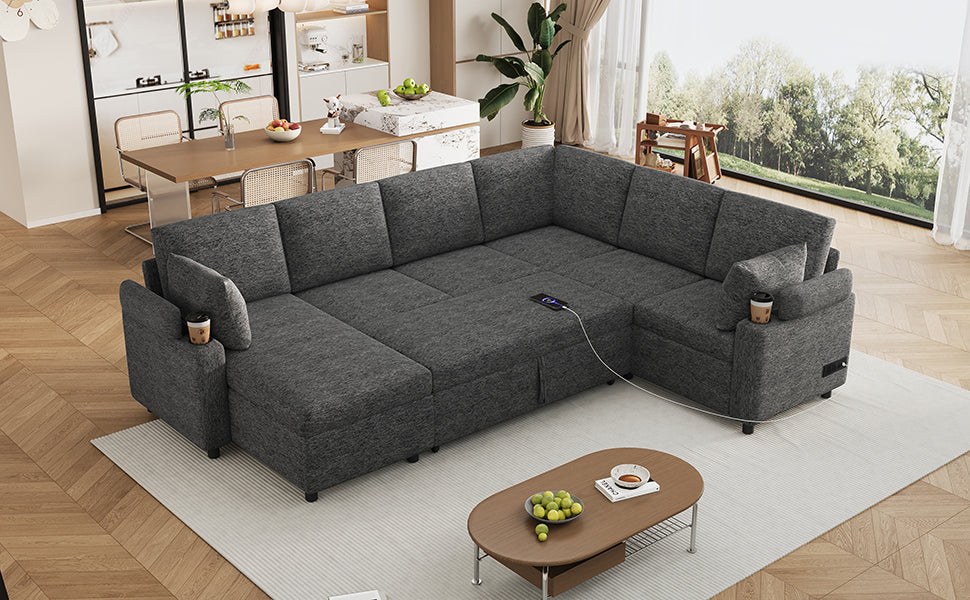 Versatile U-Shaped Sectional Sofa Bed with Storage, Cup Holders, Charging Ports in Grey Chenille is available