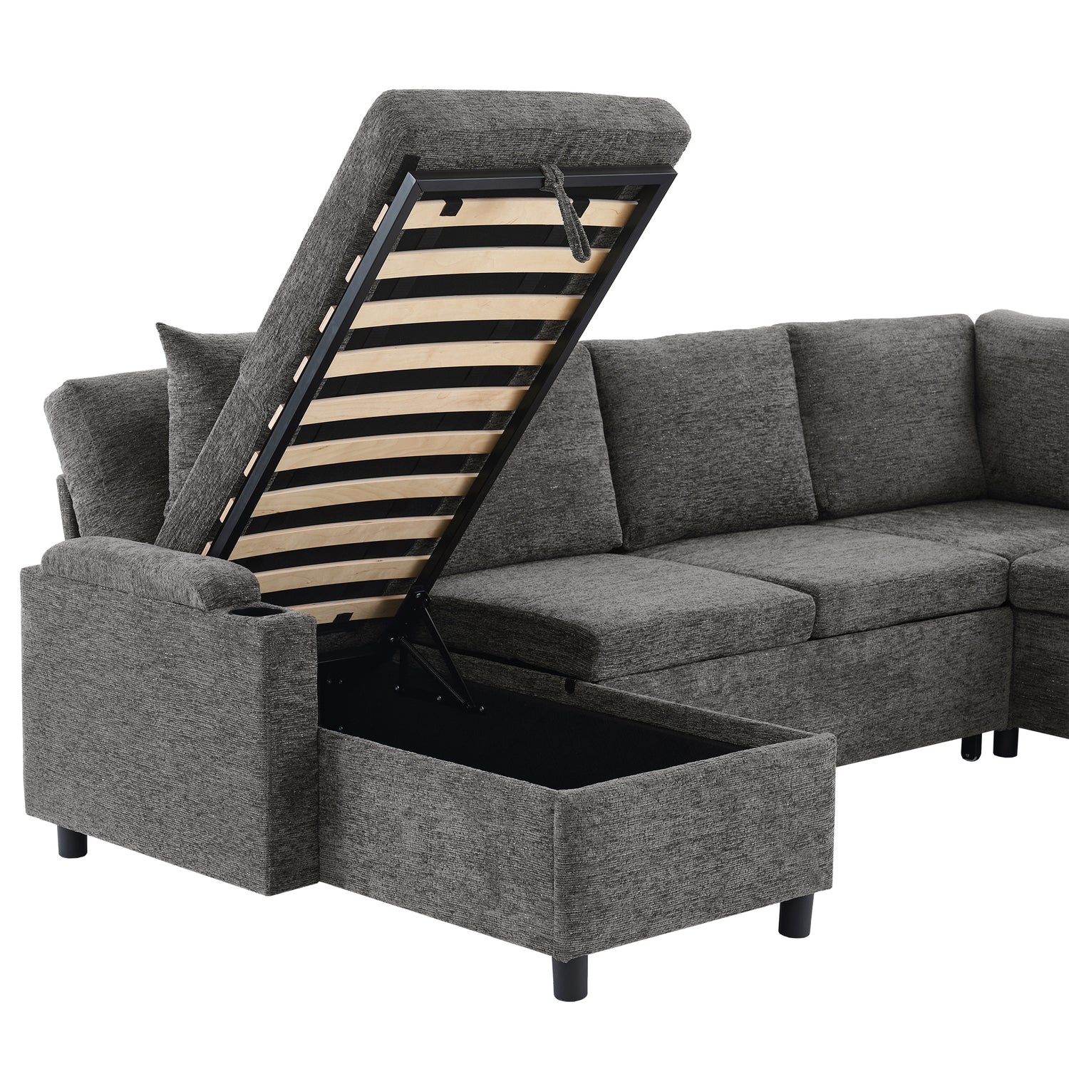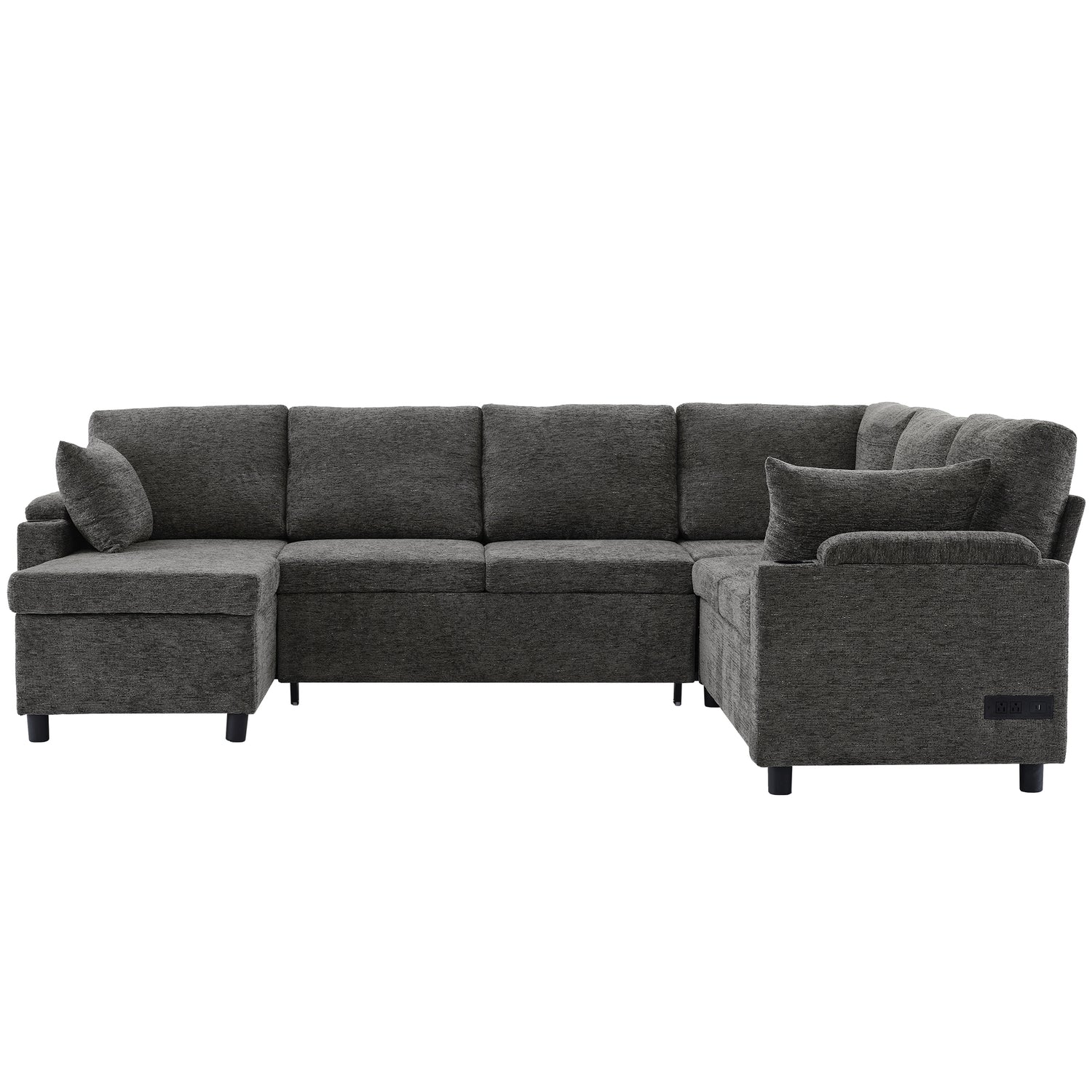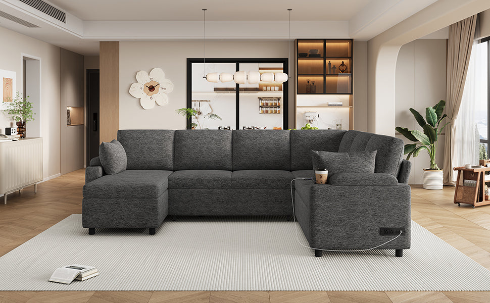 Versatile U-Shaped Sectional Sofa Bed with Storage, Cup Holders, Charging Ports in Grey Chenille