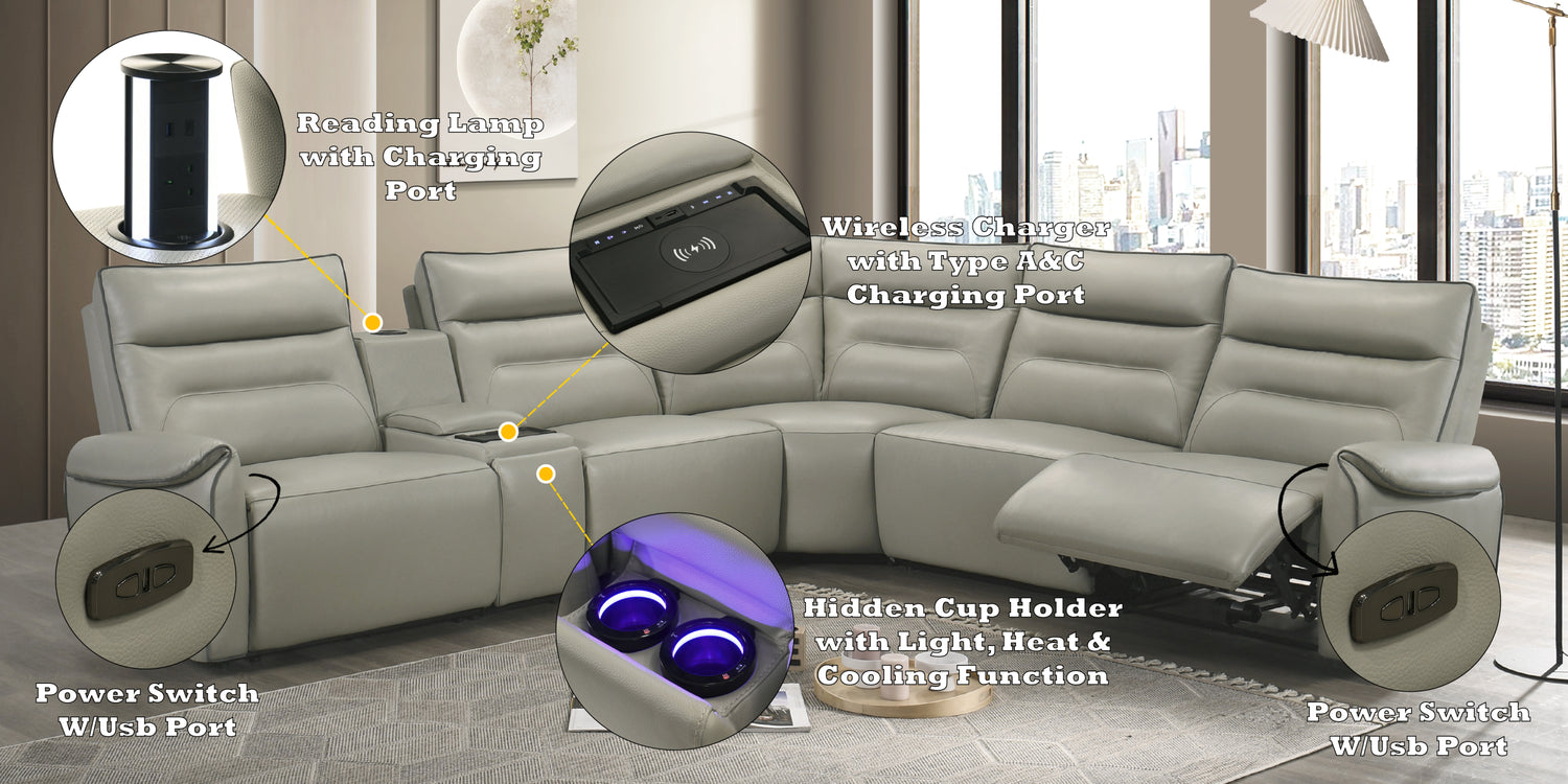 Jayke Top Grain Leather Match Power Motion Sectional Sofa, with Reading Lamp, Cupholder with Lights, Heat& Cooling Function, Wireless Charger with Type A&C Charging Port, Power Switch with USB Port