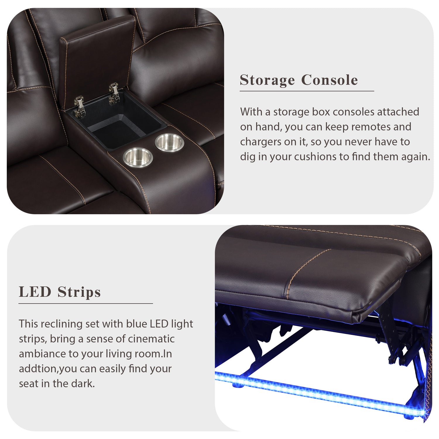 - Practical Functions - Come with 2 cup holders and a storage consoles. You can chat over a cup of coffee, or lie on a recliners to watch a movie.