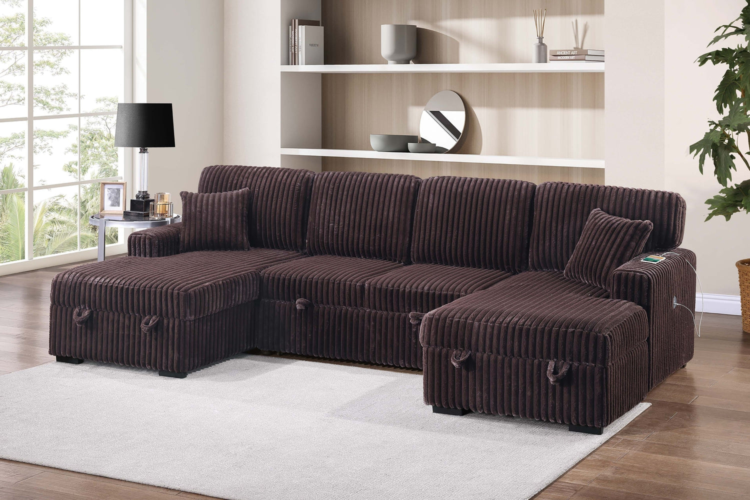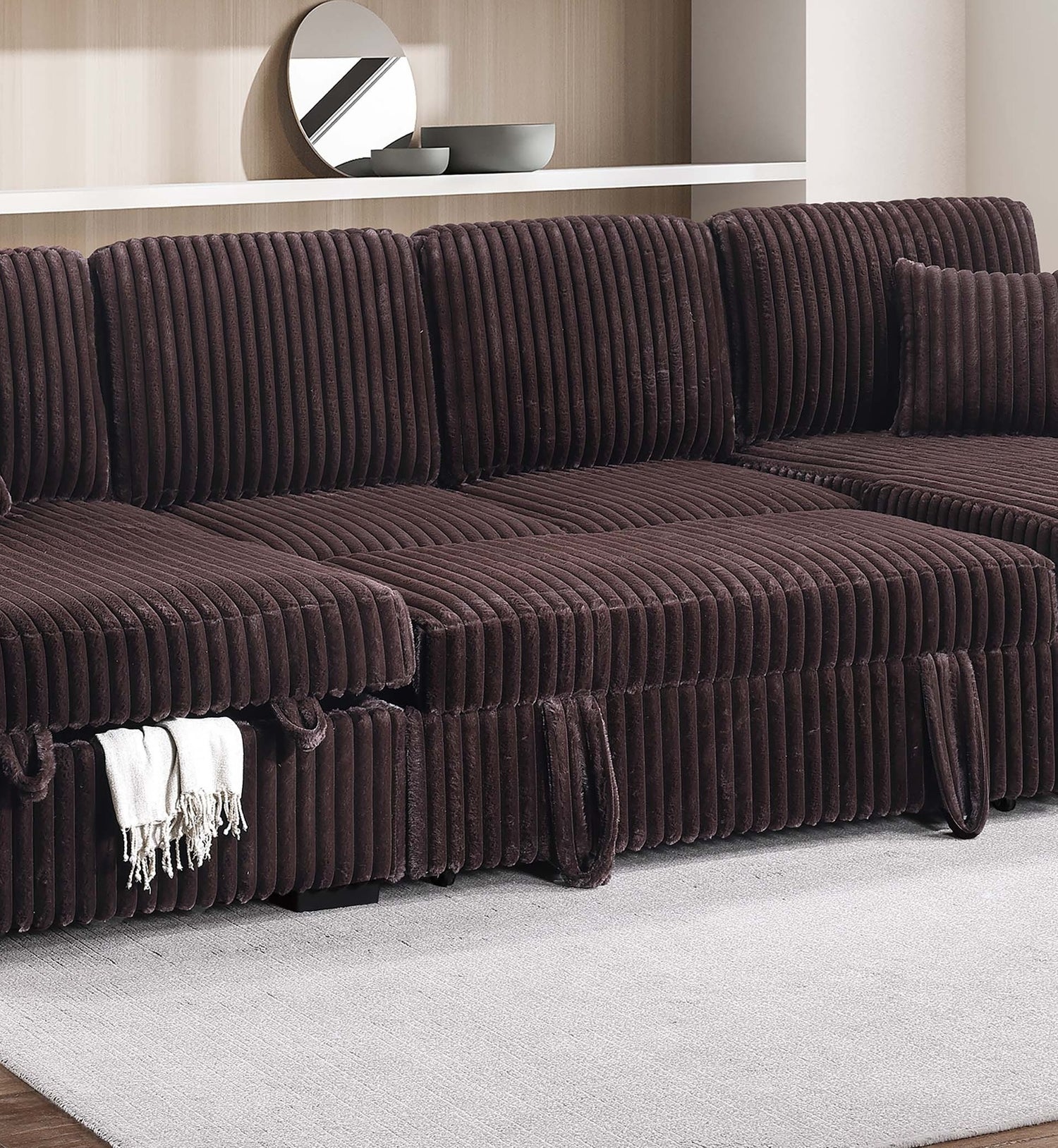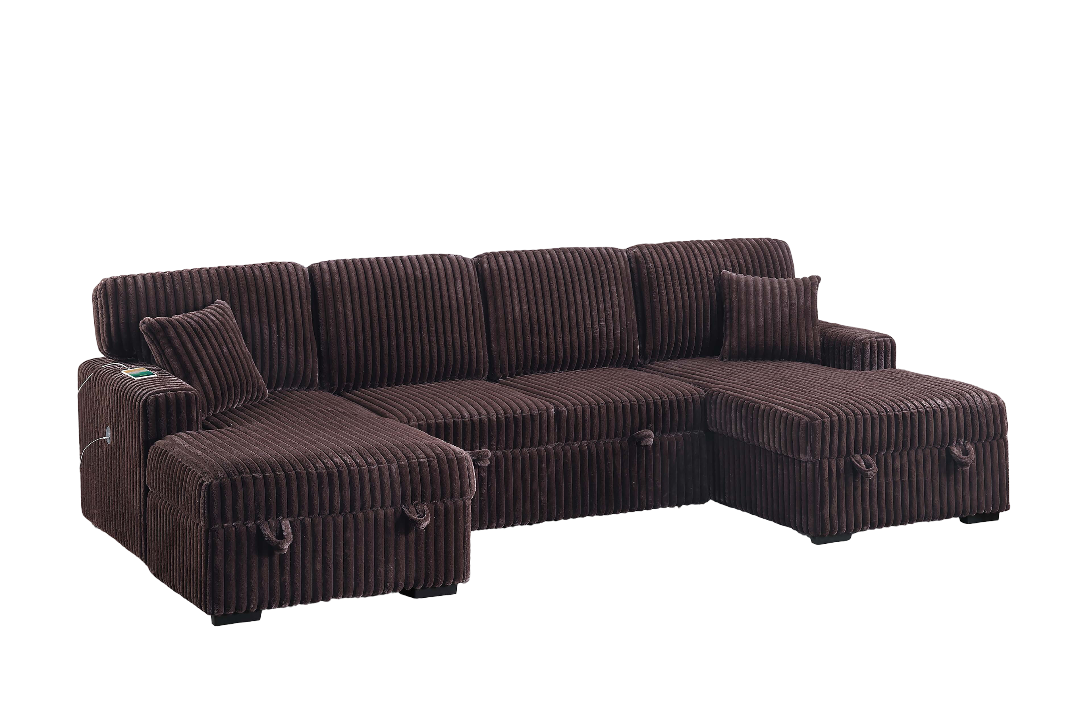 3pc Convertible Sectional Sleeper Sofa Two Chaise Storage Corduroy Upholstered Extendable Pull Out Bed Coffee Finish Pillow Included Primary Living Room