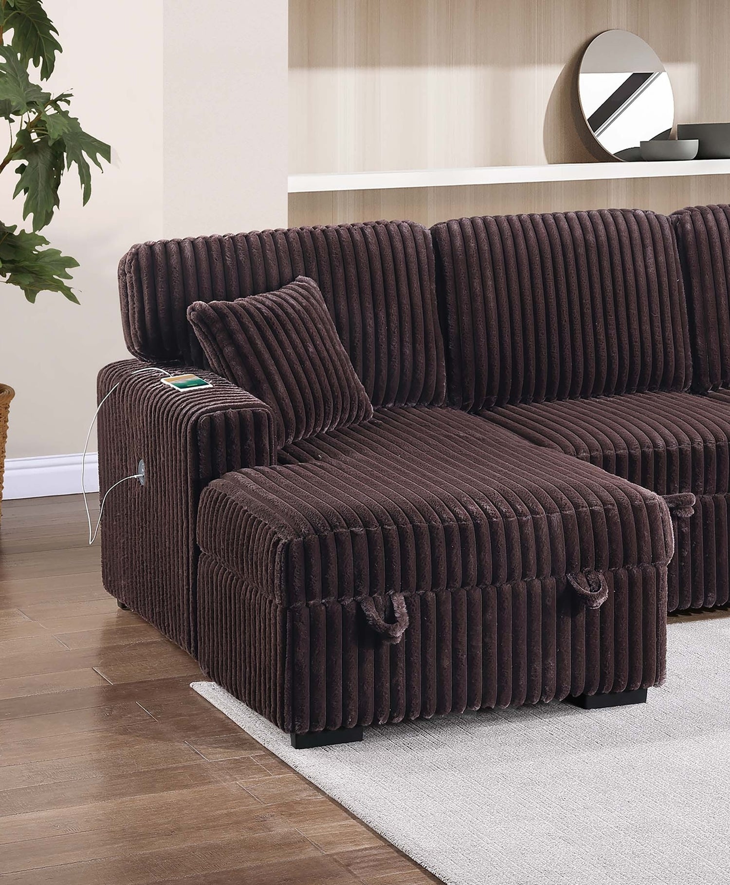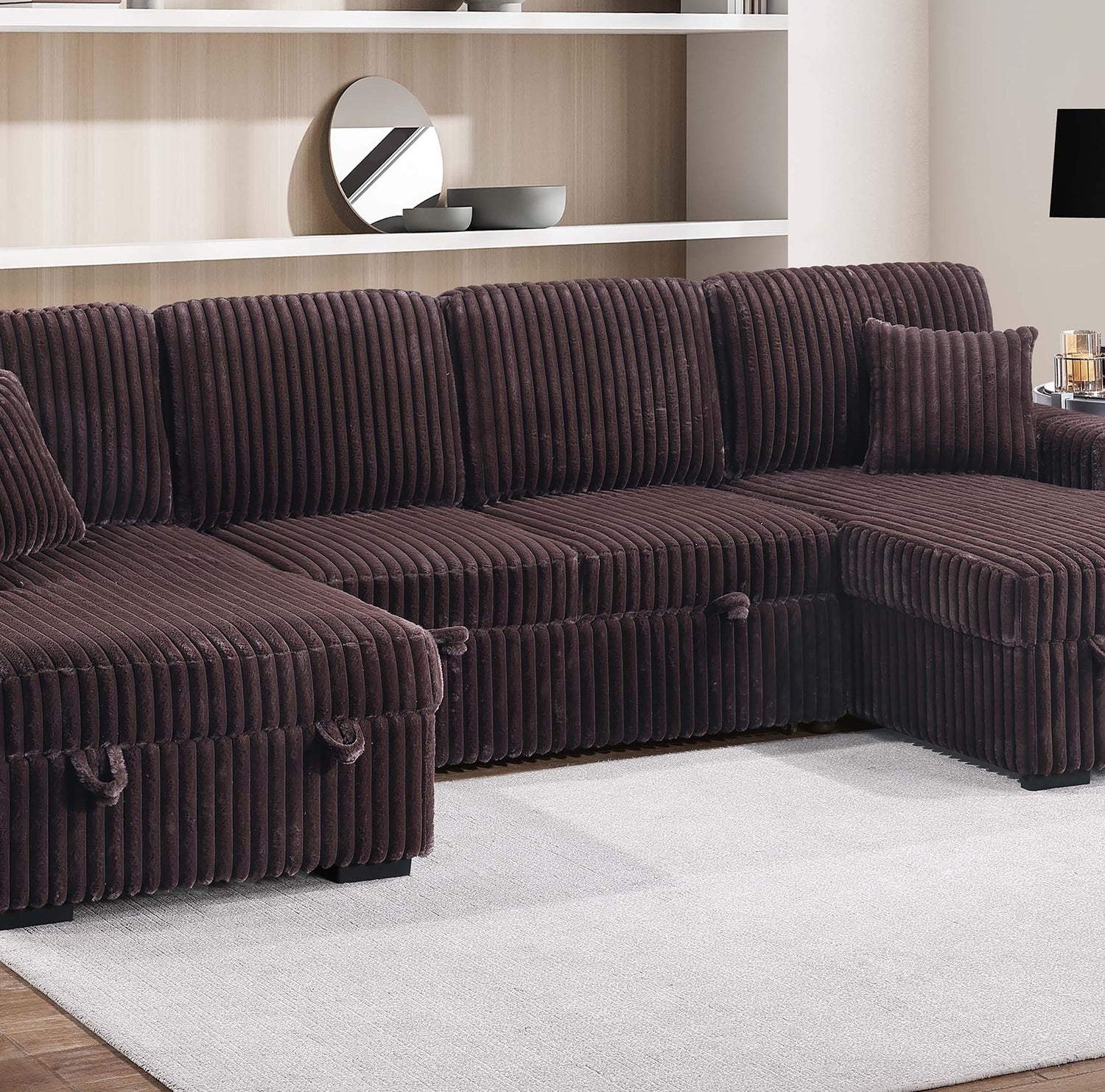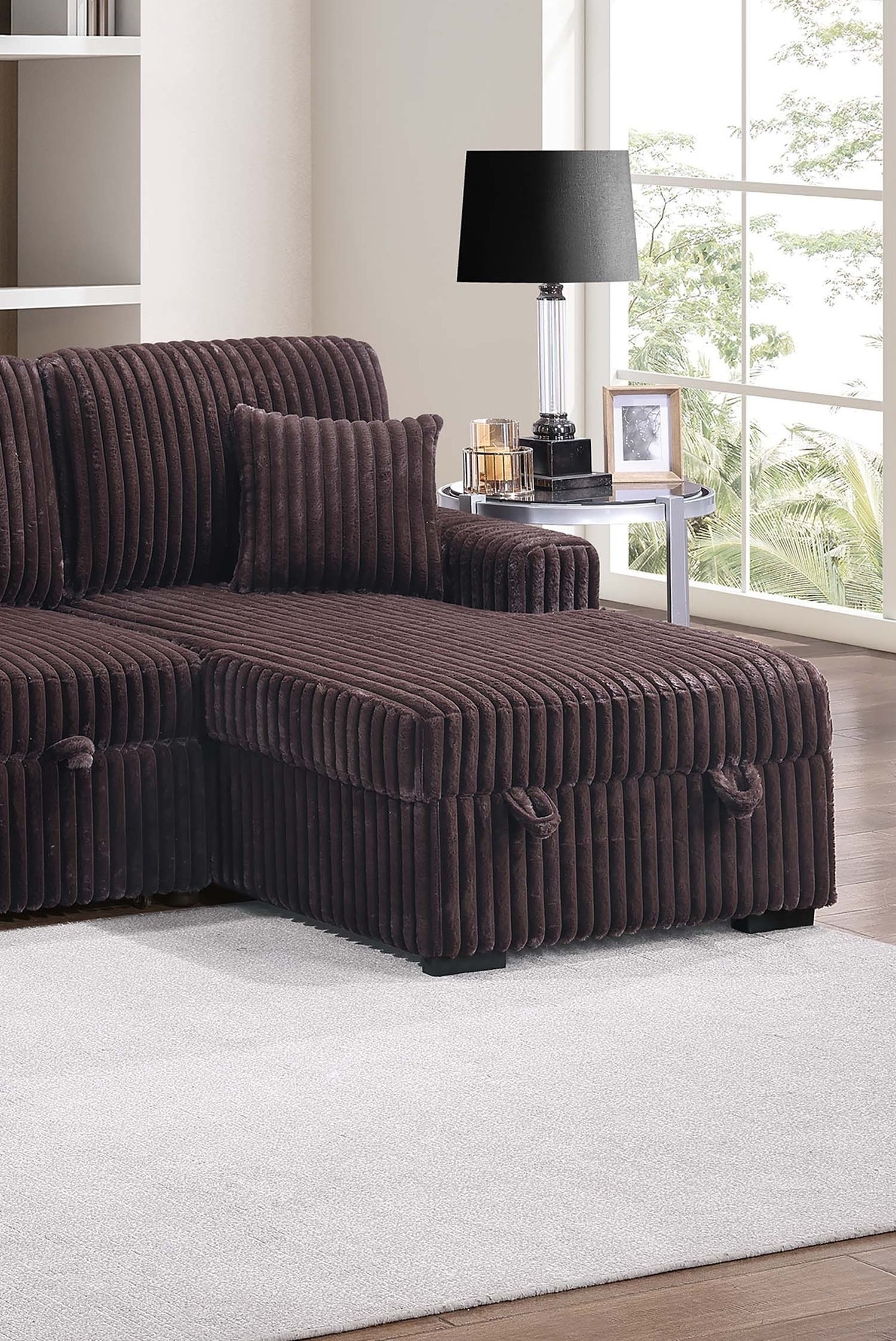 This stylish and practical piece combines comfort, storage, and versatility in one sleek design. Upholstered in soft Fur-Like Jumbo Corduroy, the sectional offers a cozy texture that’s perfect for lounging. It comfortably seats up to four people, making it ideal for family gatherings or relaxing with friends. The sectional features two spacious storage areas, conveniently located under the seats of both the RAF (Right Arm Facing) Chaise and LAF (Left Arm Facing) Chaise, providing the perfect spot to stow away blankets, pillows, or other living room essentials. When extra sleeping space is needed, the middle section easily pulls out, transforming the sectional into a bed for overnight guests. Adding to comfort and style are two matching accent pillows that complement the overall design, while the low-profile legs provide a modern, grounded look that seamlessly fits into any room layout. Whether you're hosting or just enjoying a quiet night in, this sectional offers functionality without compromising on style.