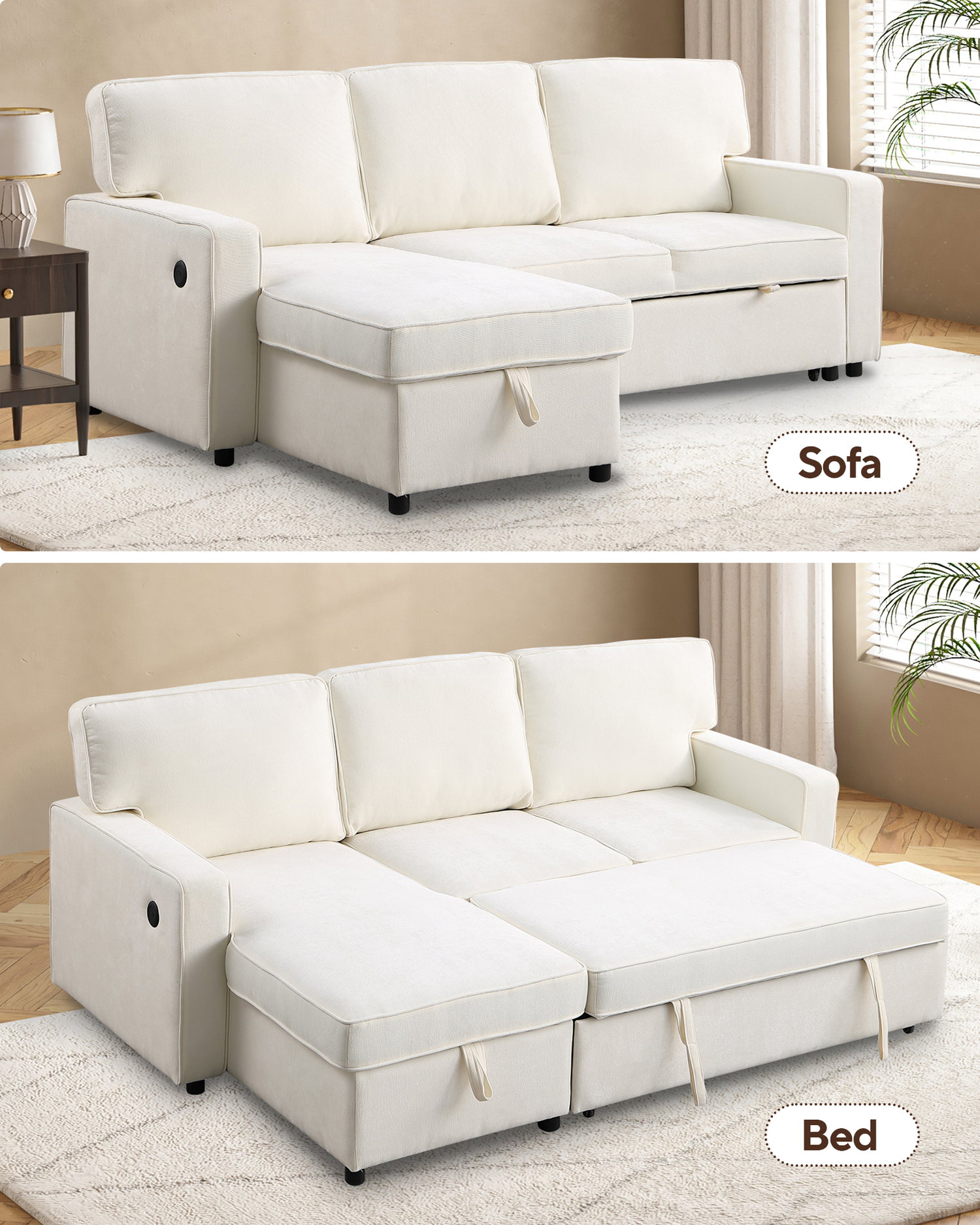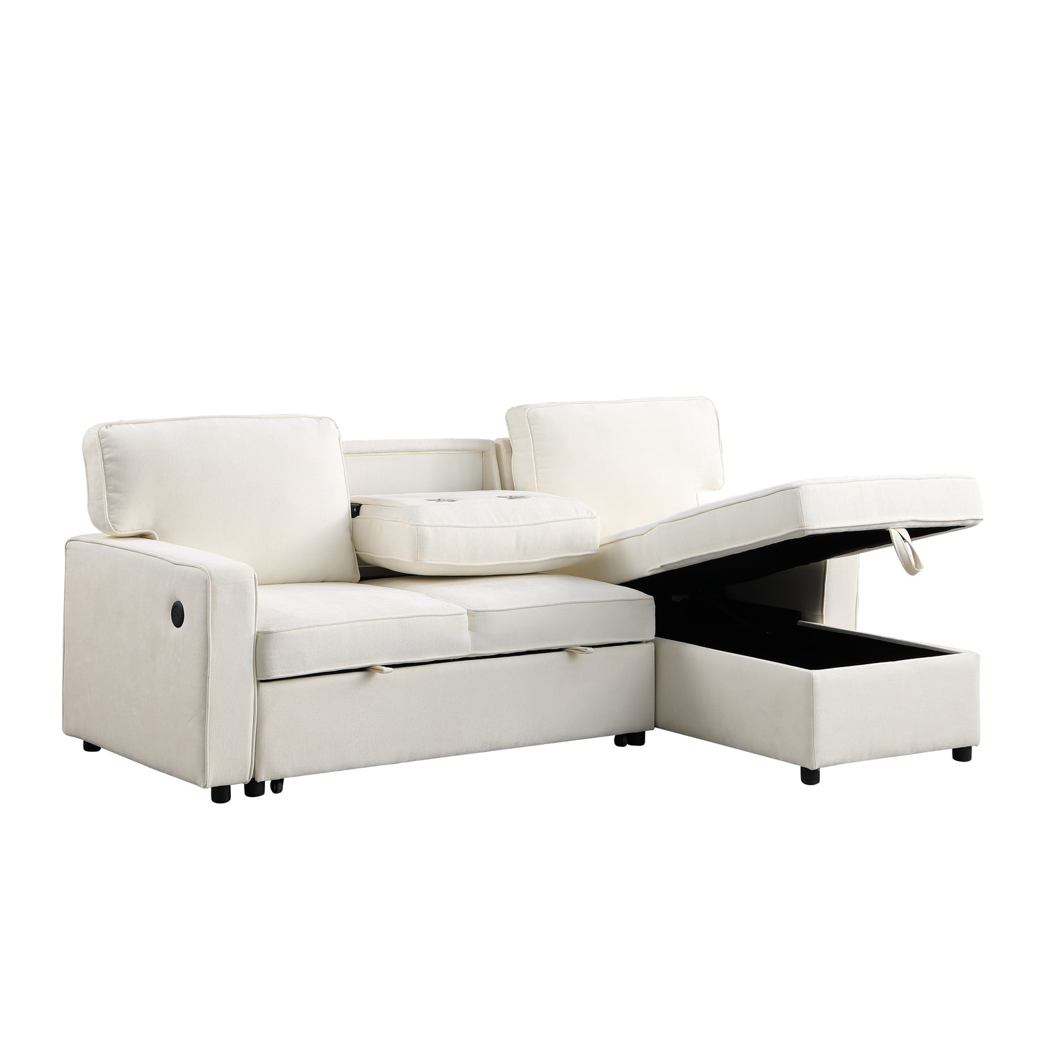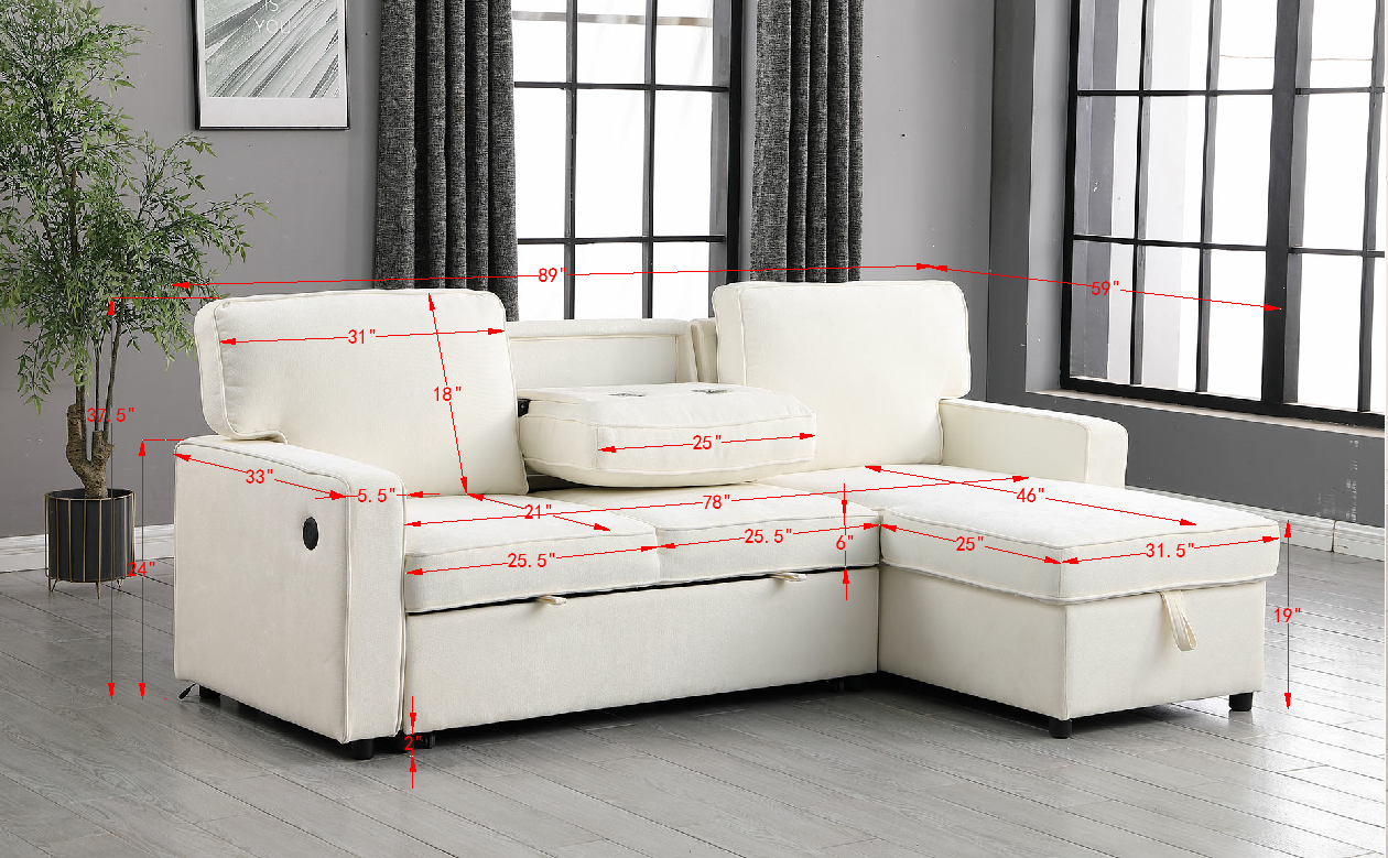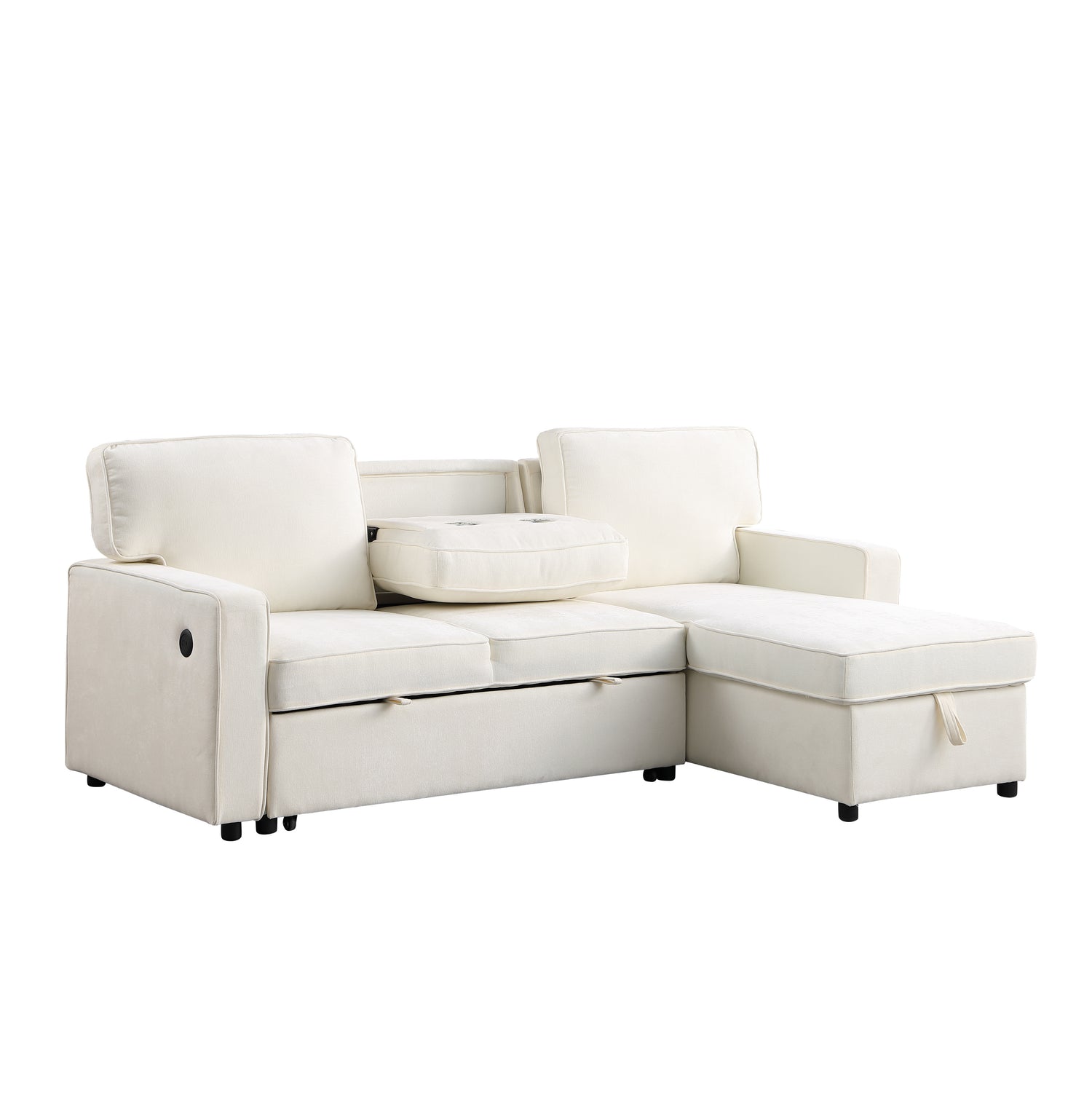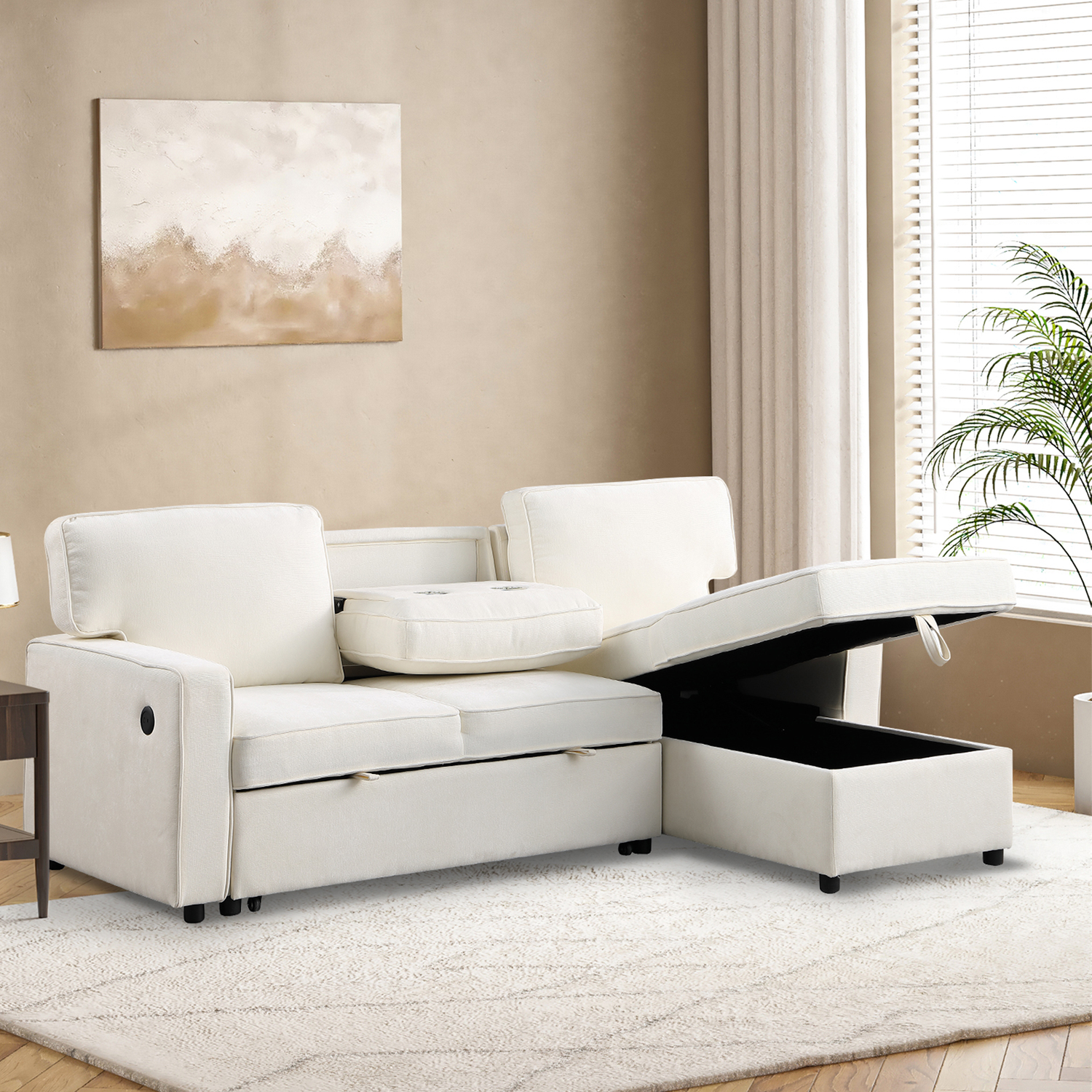 U_STYLE Upholstery Sleeper Sectional Sofa with Storage Space, USB port, 2 cup holders on Back Cushions