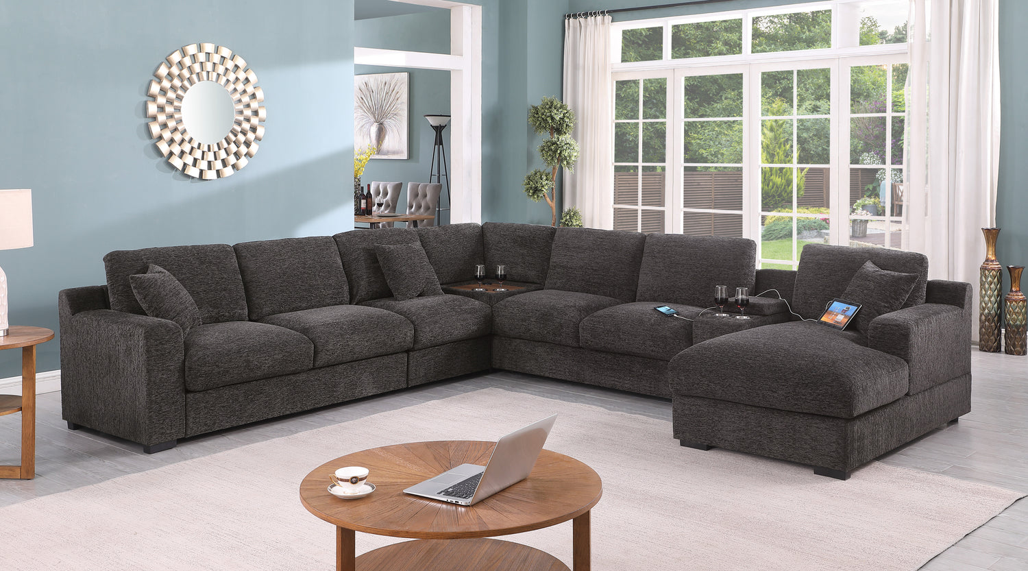 Celine 141.5' Gray Chenille Fabric Corner Sectional Sofa with Right-Facing Chaise, Cupholders, and Charging Ports is available