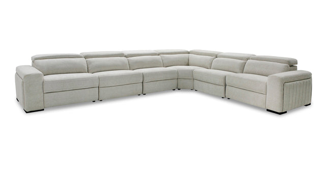 The Gering Sectional is the perfect combination of comfort and style. This six-piece sectional is upholstered in beige 100% polyester fabric and features adjustable headrests, push power buttons and collapsible cup holder consoles on both the left and right arm pieces. The combination of comfortable foam, supportive springs and a pillow backing offer the maximum level of comfort. The sectional pairs perfectly the Gering Power Recliner from the same collection.