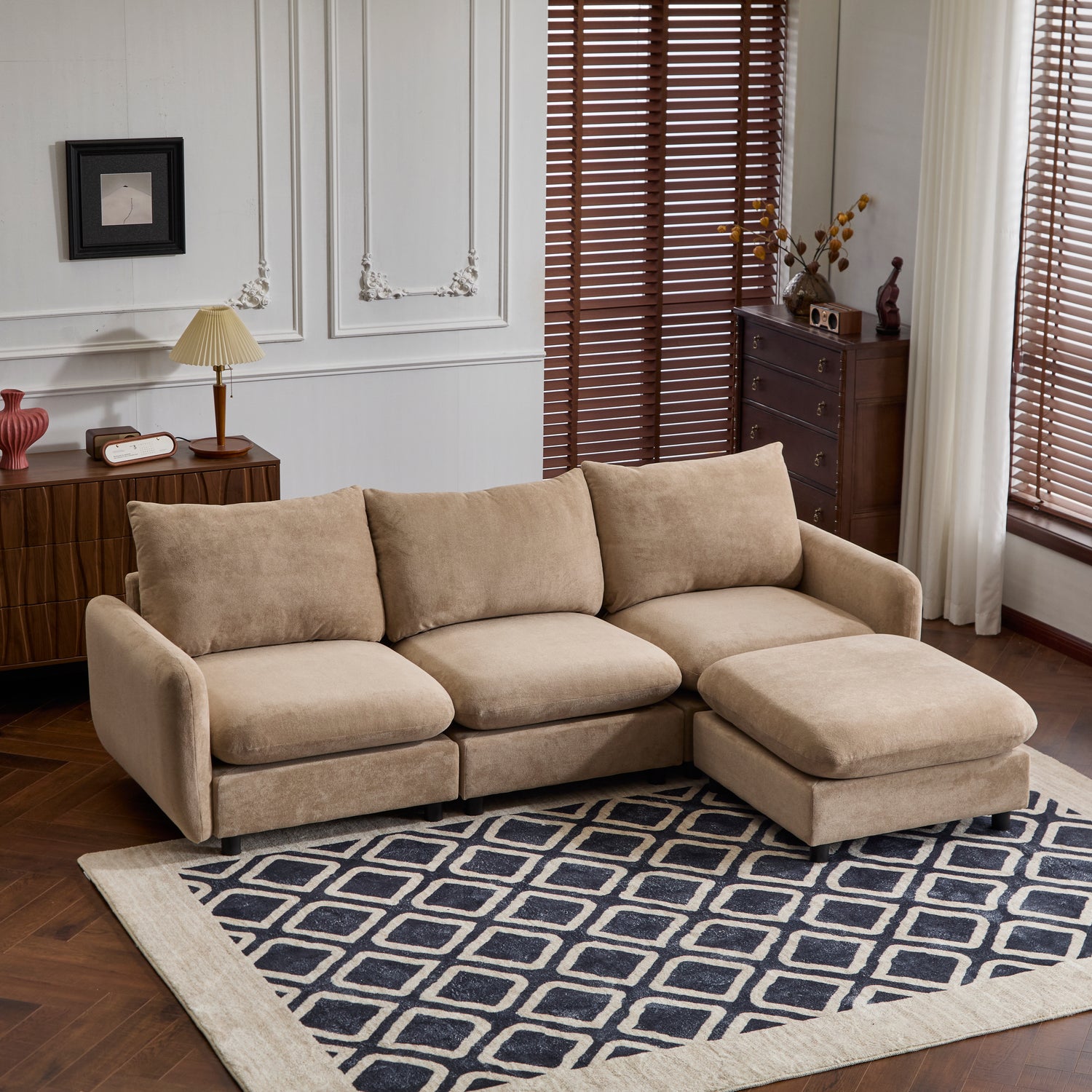 - This modular sectional sofa features a sturdy solid wood frame that guarantees long-lasting stability The reinforced structure includes supportive springs that offer a perfect balance of comfort and resilience, providing ample space for you to lounge and enjoy wonderful moments with your family or friends.