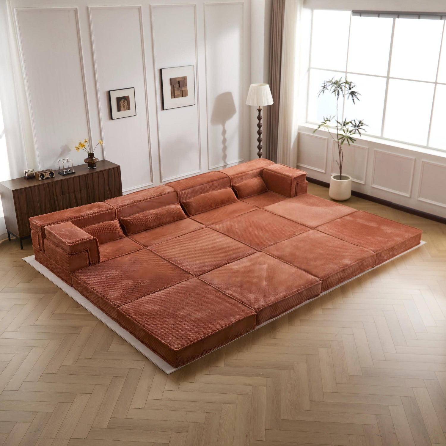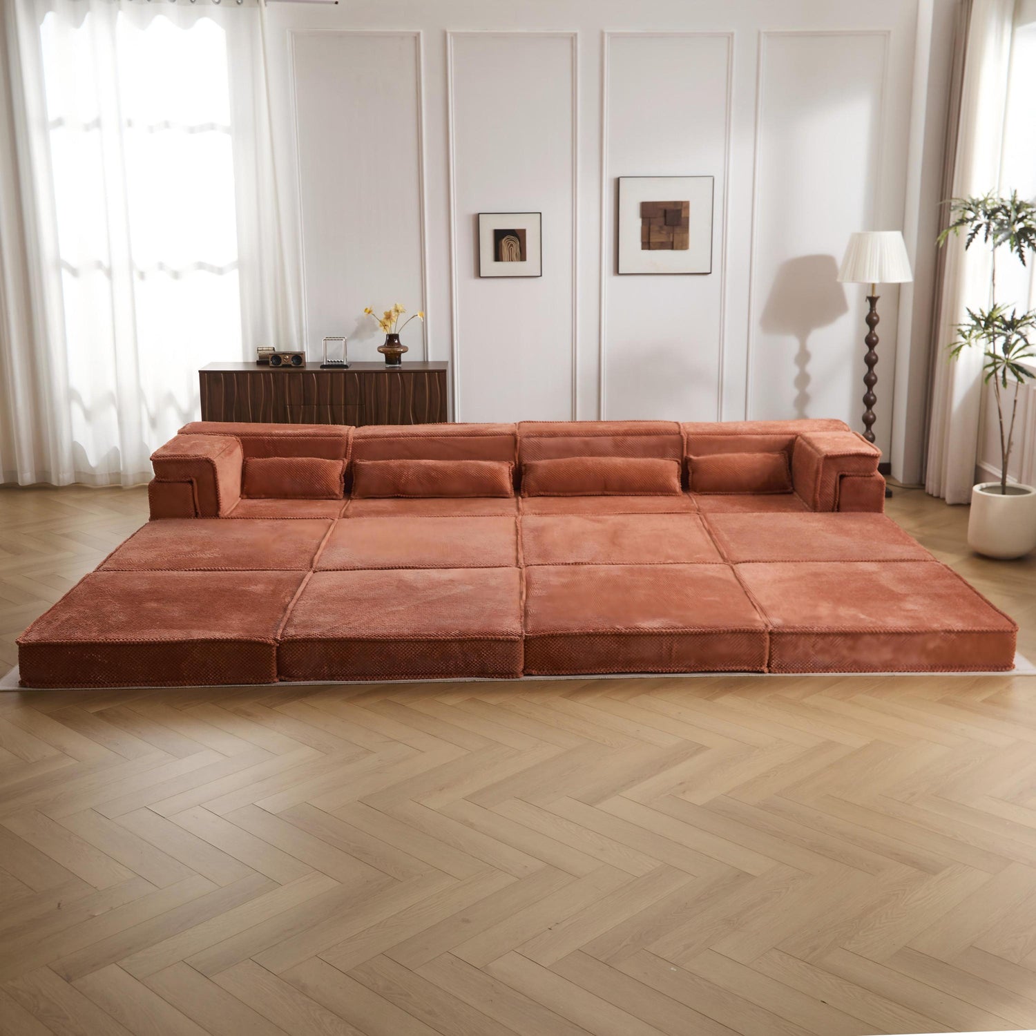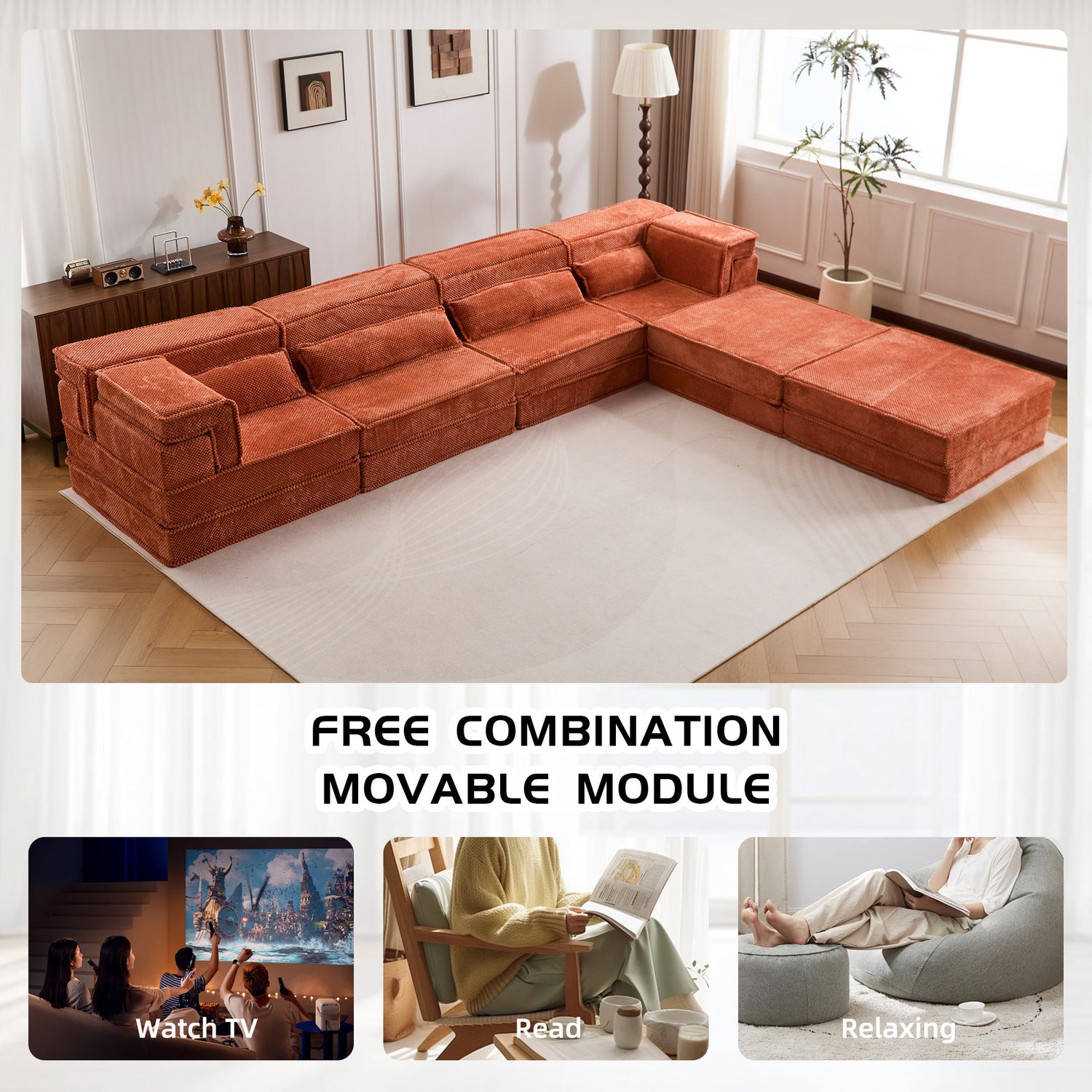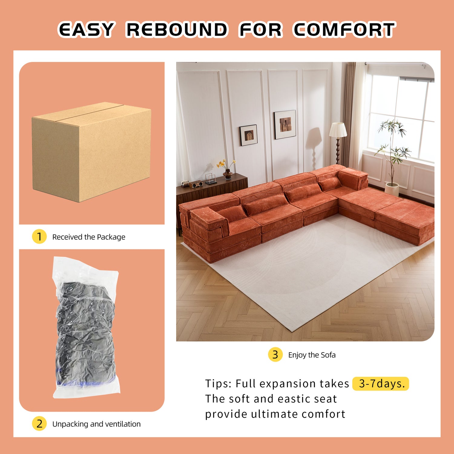 Compression Mahjong Sofa,Convertible Floor Sofa Bed,DIY Boneless Modular Sectional Sofa,No Assembly Required,Circle fleece fabric,Oversized 4 Seater with 2 Ottoman,Orange is available