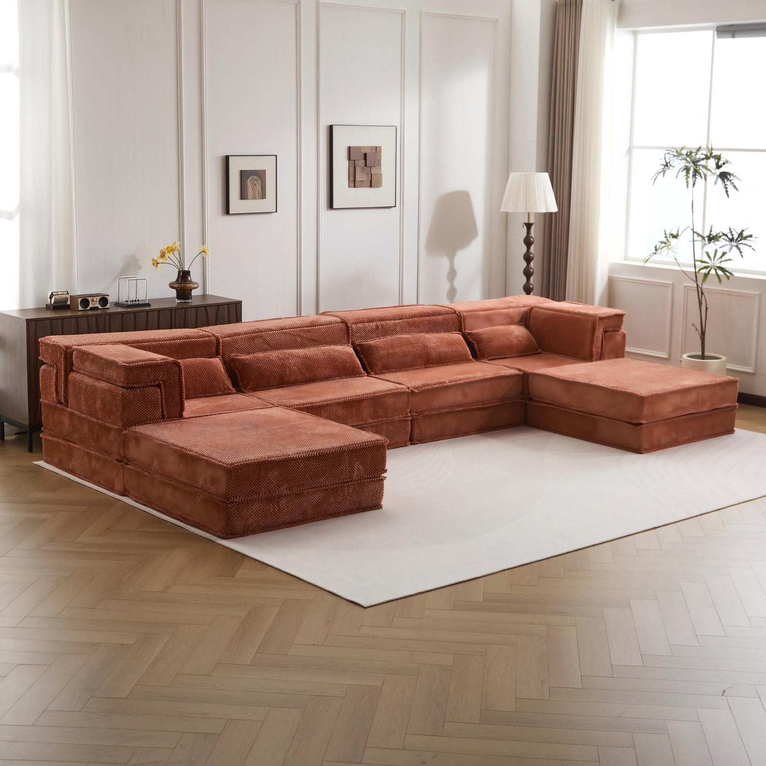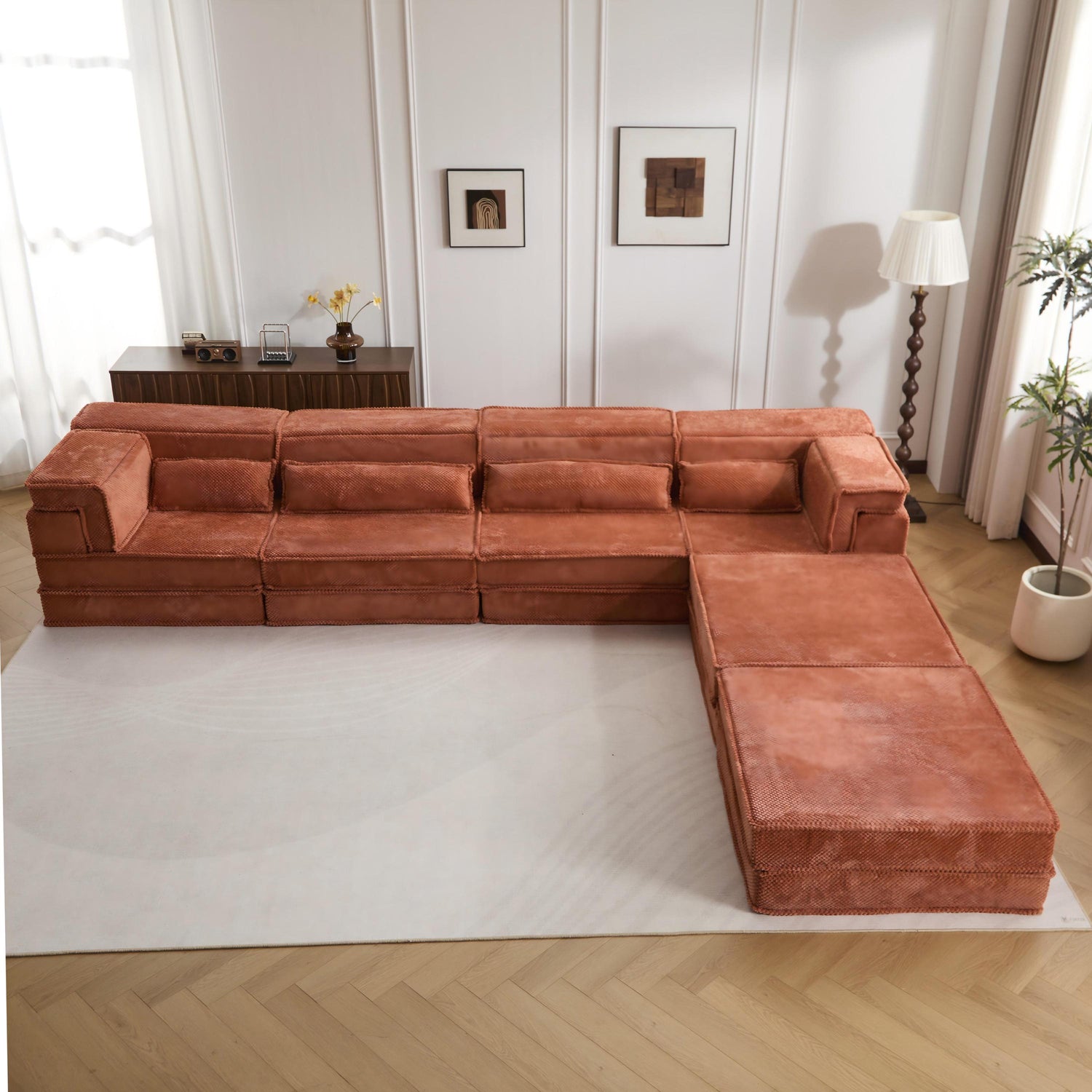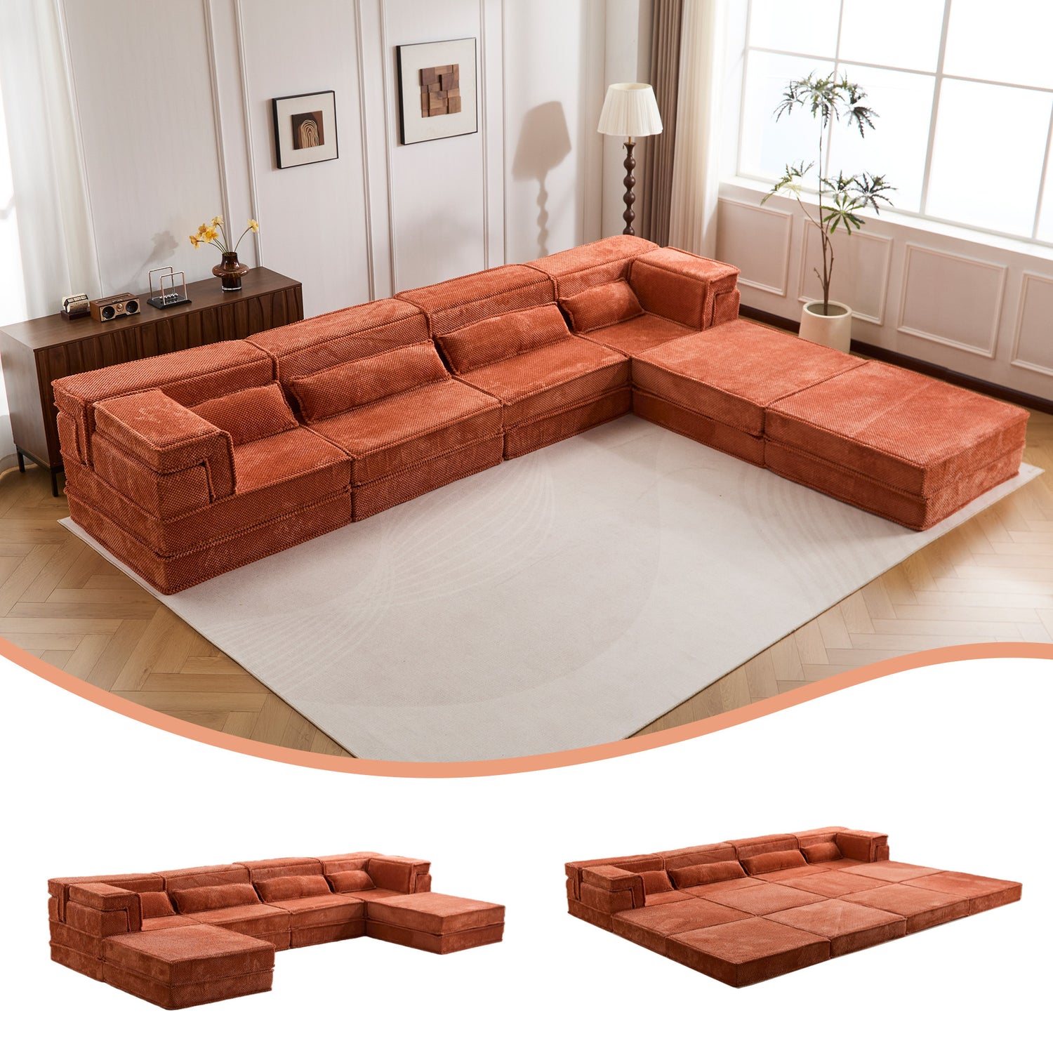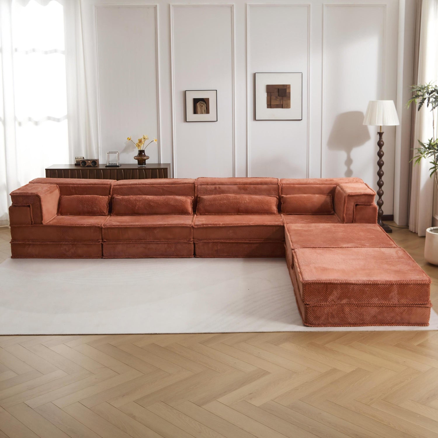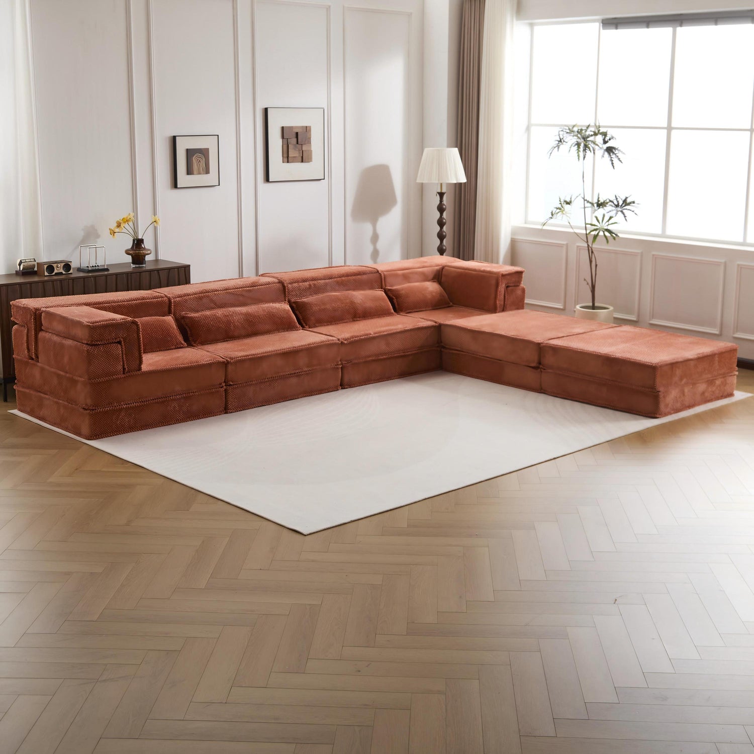 Compression Mahjong Sofa,Convertible Floor Sofa Bed,DIY Boneless Modular Sectional Sofa,No Assembly Required,Circle fleece fabric,Oversized 4 Seater with 2 Ottoman,Orange is available