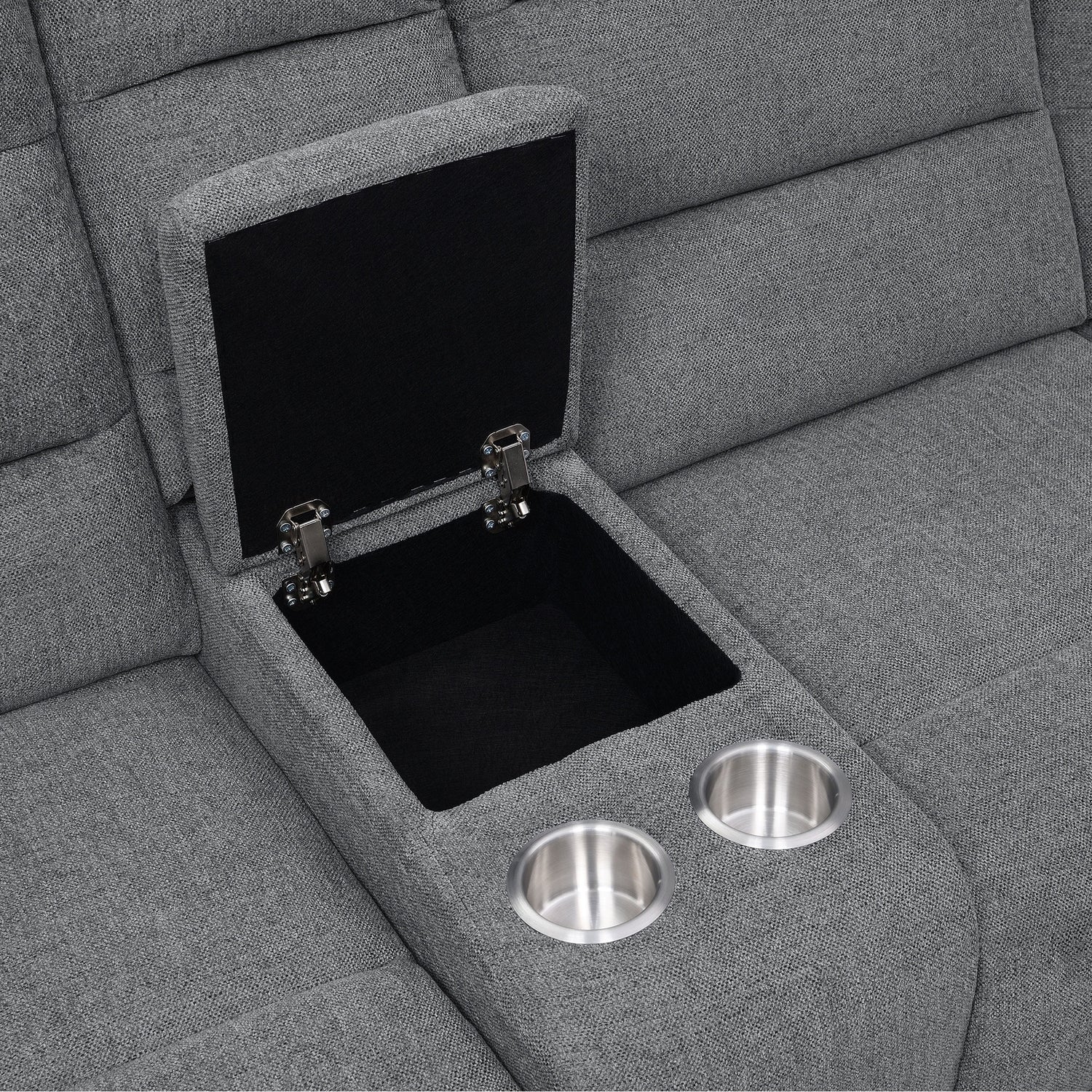 - Console includes a convenient lift top storage compartment and two stainless steel cup holders, perfect for organizing essentials and beverages