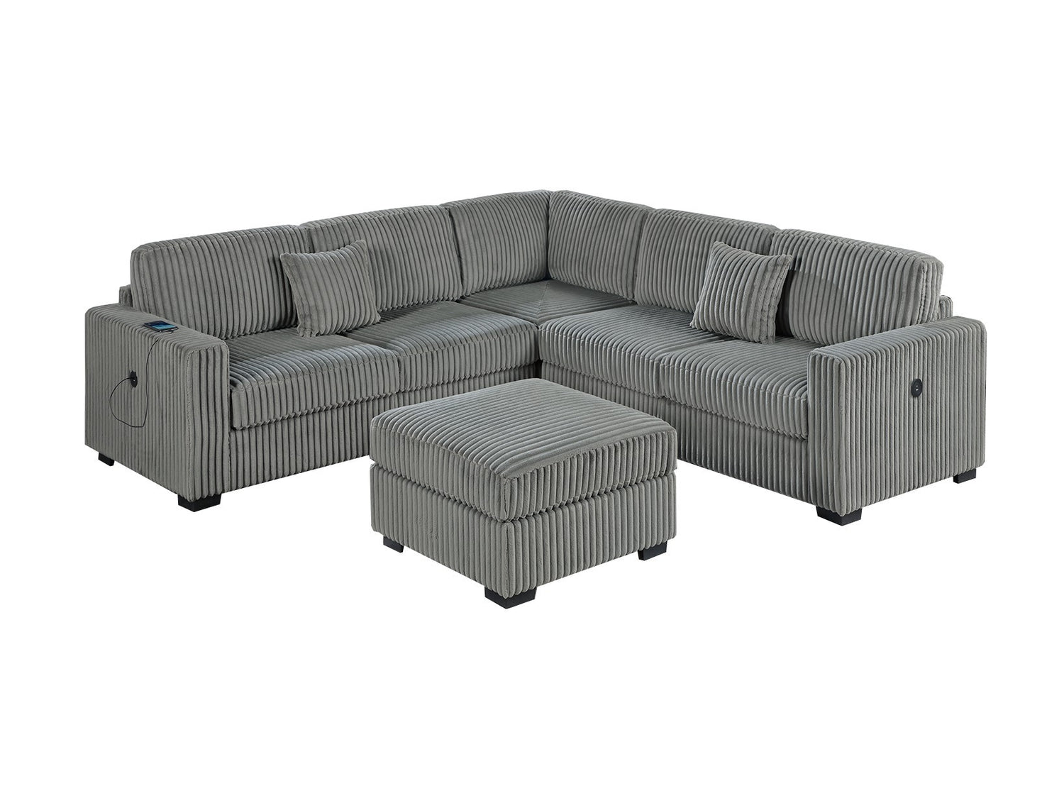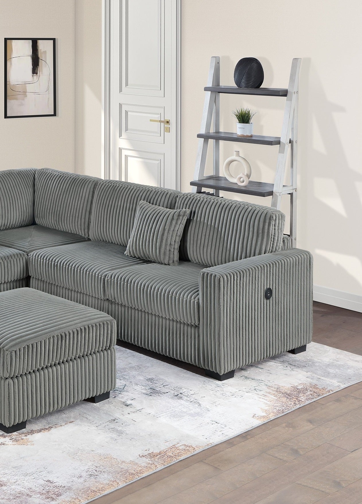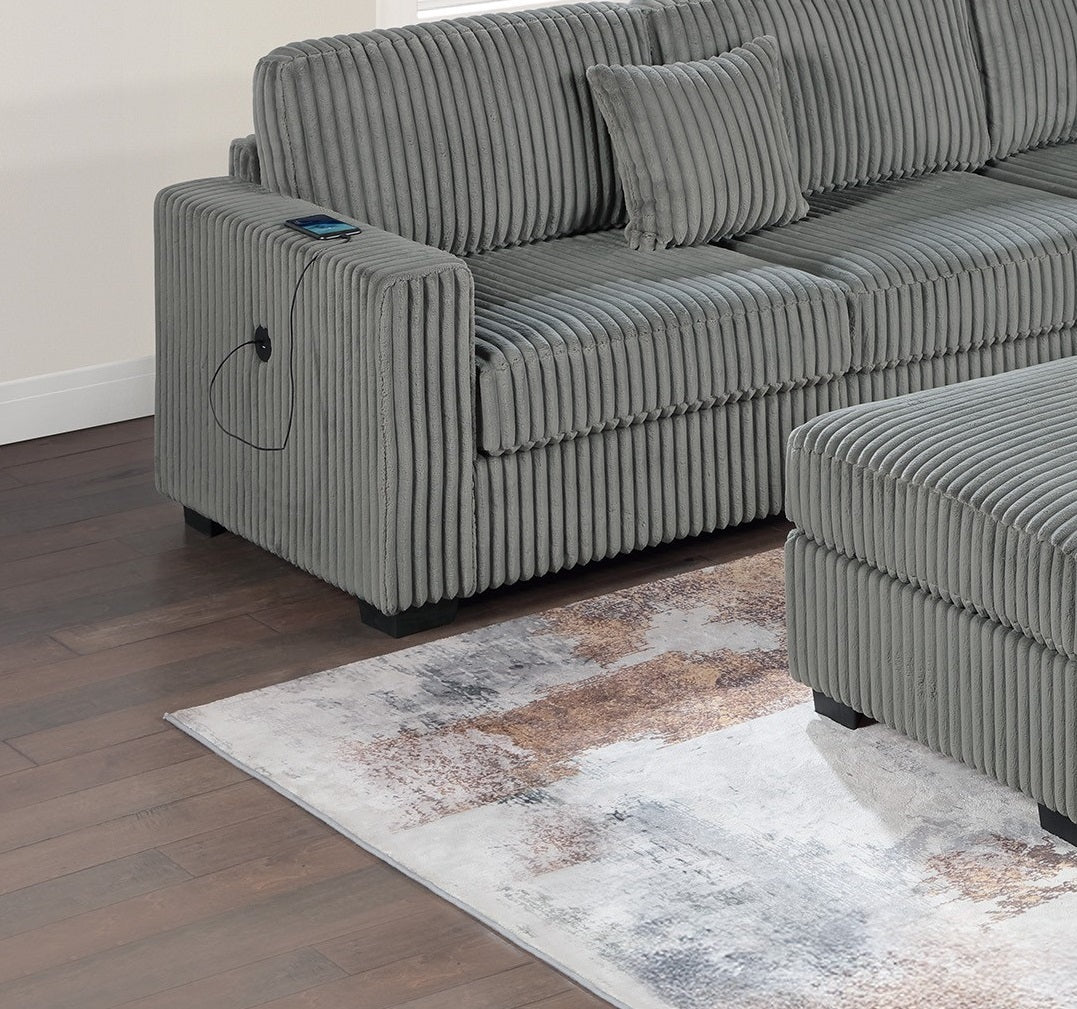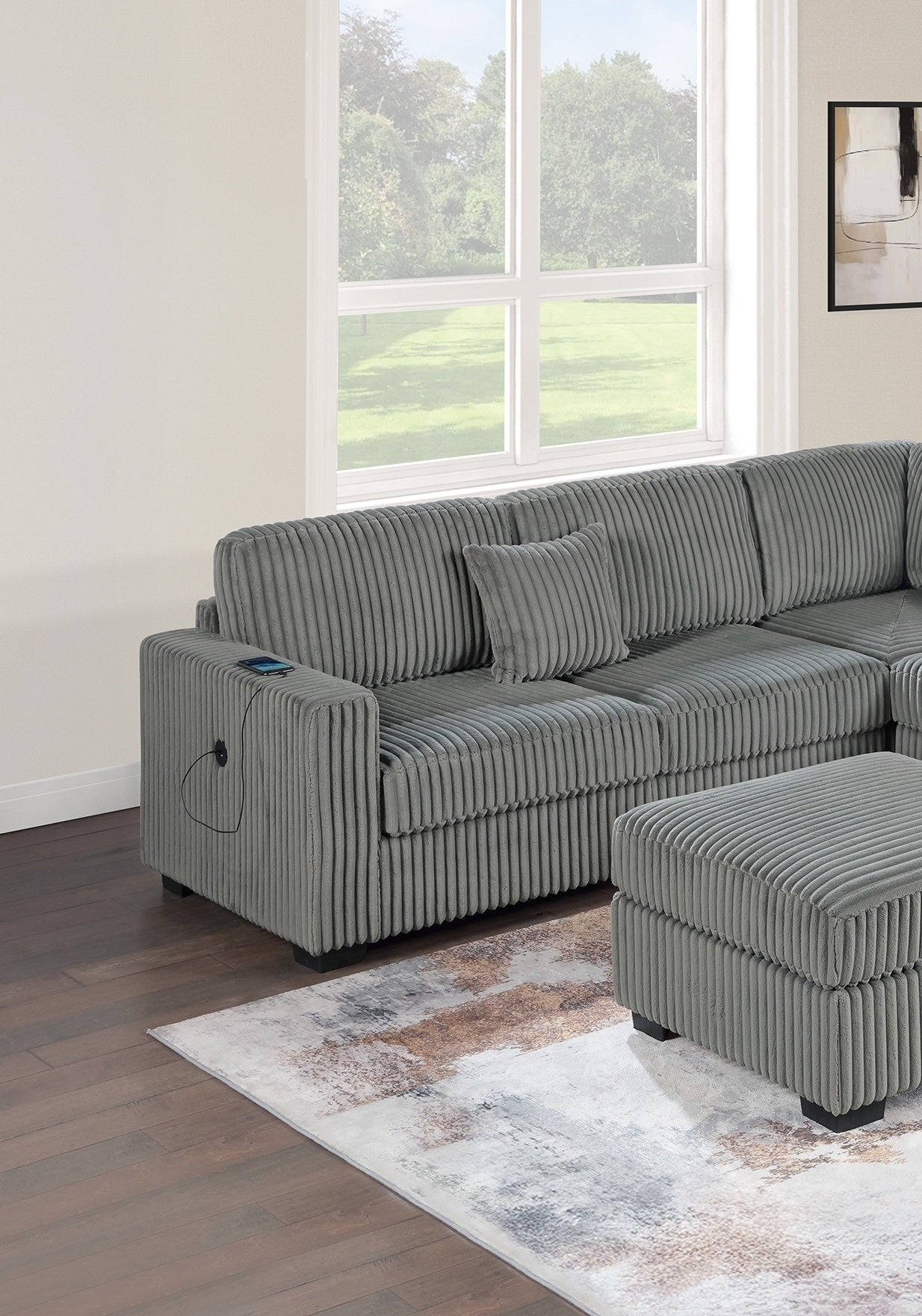 Living Room Corduroy Upholstered Smoke 4pc Sectional Set RAF/LAF One-Arm Loveseat W/USB, Corner Wedge, Cocktail Ottoman Cushion Couch