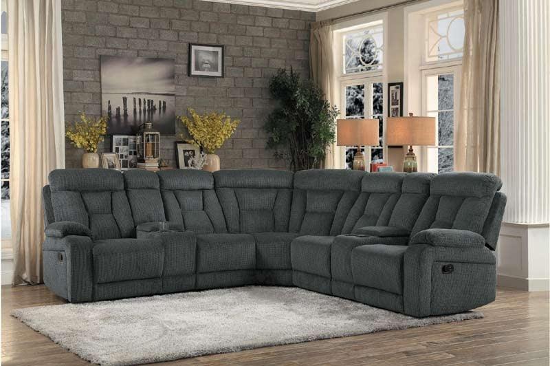 Sectional seating creates the perfect platform for comfort in the Rosnay Collection. Recliners bookend the symmetrical arrangement with dual consoles providing cup holders and lift top storage. Manual motion mechanisms, when engaged with the pull of a side mounted tab, ease you from seated to reclined. Gray or chocolate fabric covers this casual offering.