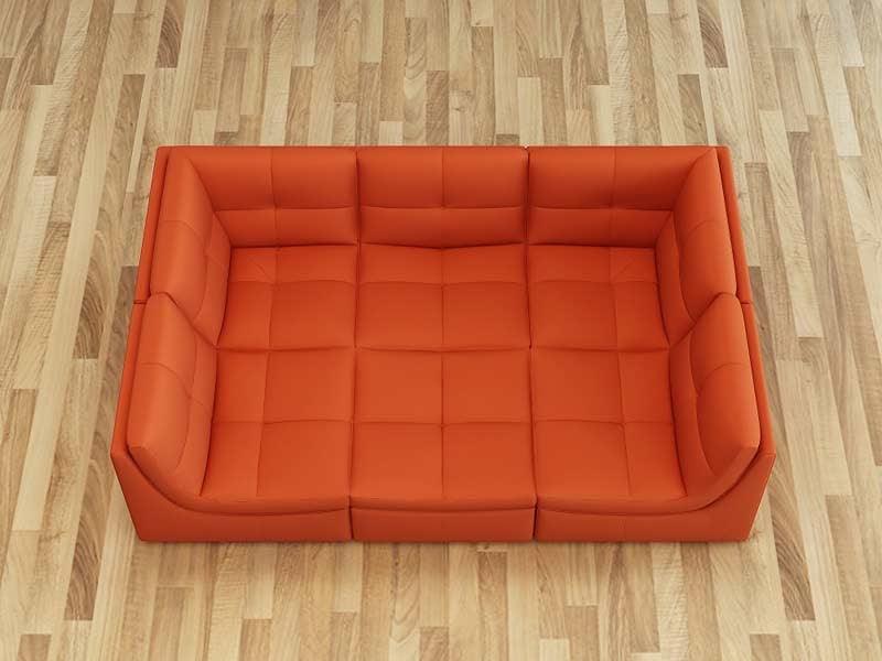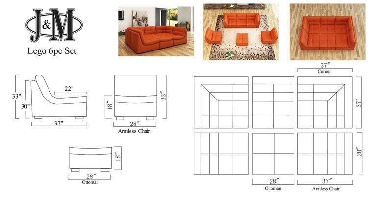 the size and shape of the room. The Lego features finished sides & is fully modular. This set can be ordered in a 6 or 7 piece combination which allows you to create your own customized combinations. From L-shapes of two- and three-seat sectional sofas with ottoman that can be used as a chaise lounge. The lego can be customized to fit your exact layout. Crafted in leather all around. The lego is stocked in White Leather, Pumpkin Leather, and Grey Leather but can be special order in many different colors.