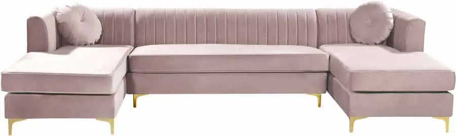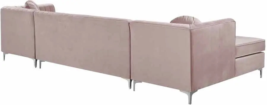Sit back and get comfy on this Pink velvet Graham three-piece sectional sofa. Plush Pink velvet with a channel tufted back creates a contemporary display that is sure to be the focal point of your living room.