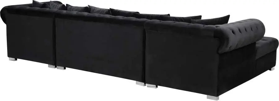 Get ready to relax after a long day with this Presley Black Velvet 3pc. Sectional from Meridian Furniture. Featuring rich black velvet upholstery with deep tufting and comfy pillows, this double chaise sectional provides a luxurious, cozy space to kick back and watch TV, take a nap, or curl up with a nice book. Complete sets of gold and chrome legs complement your contemporary home decor while providing solid support for the sectional's frame.