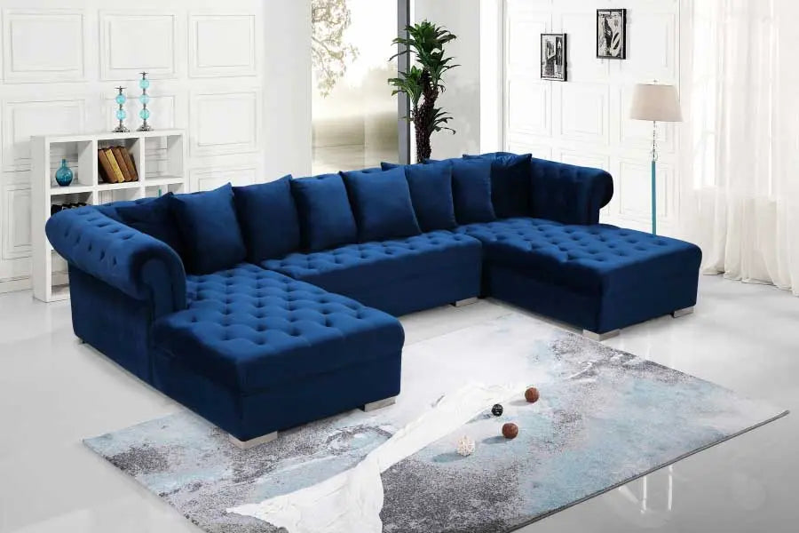 Get ready to relax after a long day with this Presley Navy Velvet 3pc. Sectional from Meridian Furniture. Featuring rich Navy velvet upholstery with deep tufting and comfy pillows, this double chaise sectional provides a luxurious, cozy space to kick back and watch TV, take a nap, or curl up with a nice book. Complete sets of gold and chrome legs complement your contemporary home decor while providing solid support for the sectional's frame.