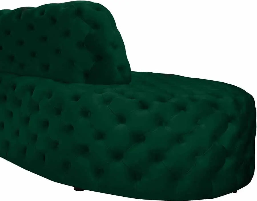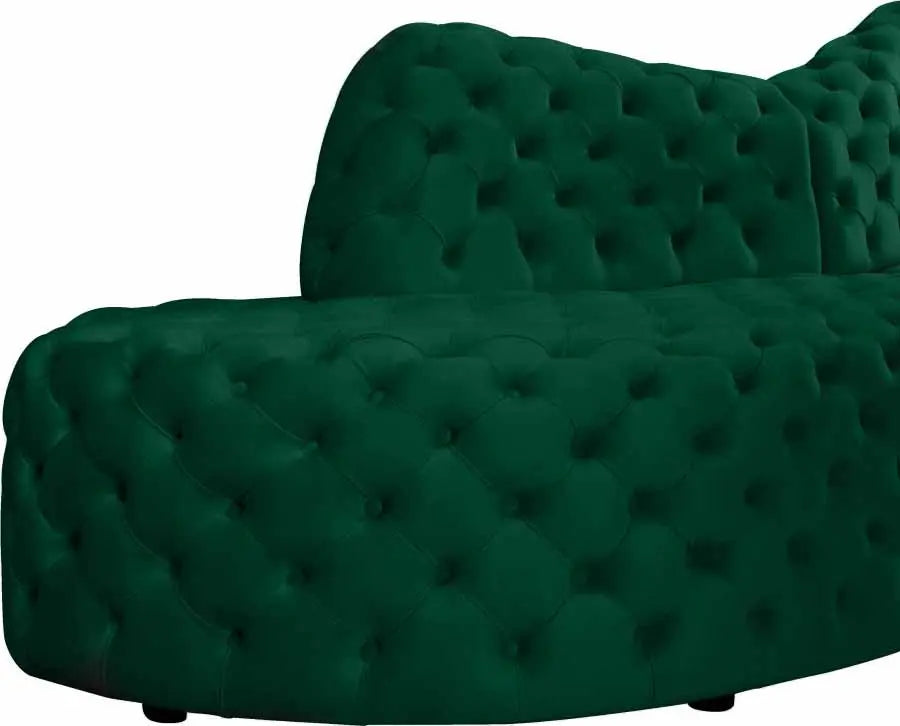 Settle in for family game night atop this Royal velvet sectional that’s upholstered with soft Green velvet material. This 3-piece sectional has a lot to offer, with its deep seating and extra wide design that gives you oodles of room to move around and get comfy. The tufted design of the arms, back, and seats adds to their durability and soft, welcoming touch. The sectional comes in neutral colors to mesh nicely with other elements in your room.