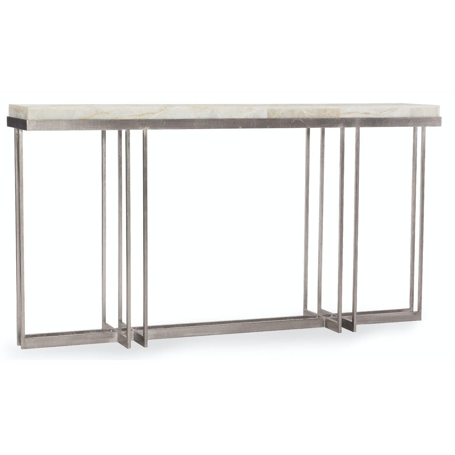 The Blaire Console Table from the Melange Collection by Hooker Furniture offers a chic, minimalist profile that brings subtle luxury to any room. Its slim tubular steel frame in a pewter finish pairs gracefully with the natural elegance of a tumbled white onyx top—ideal for modern and contemporary interiors.
