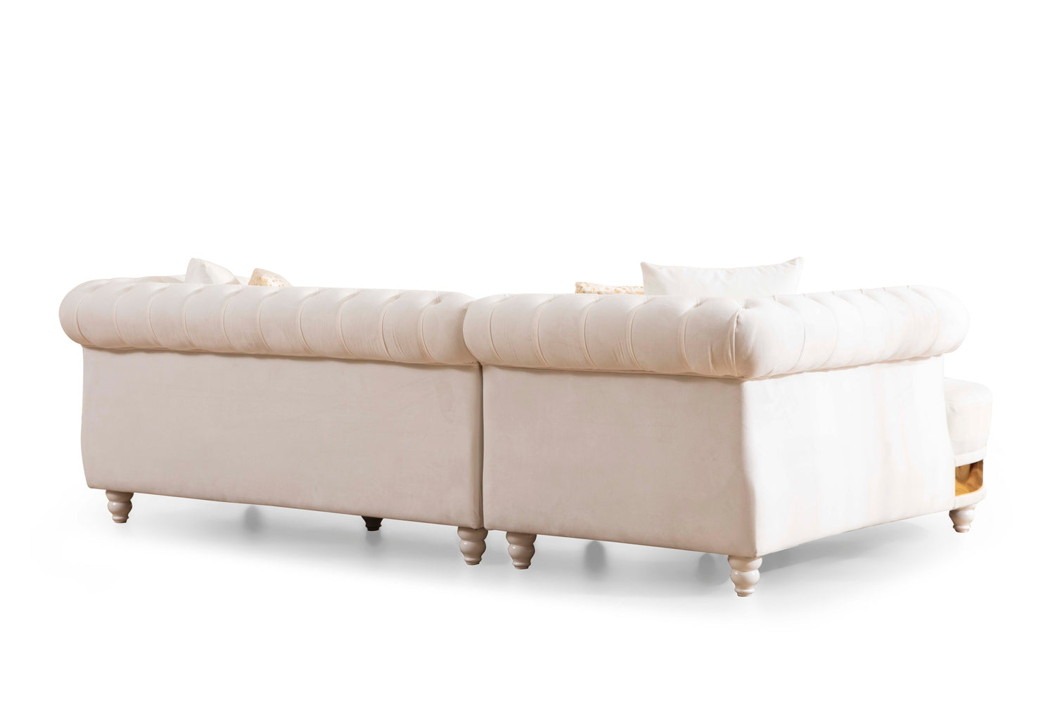 The perfect mix of Milky white velvet and gold stainless steel comes to life in your space with this immaculate L-shaped living room set. This bold sofa comes upholstered in rich, sumptuous-to-the-touch velvet to make a fashionable statement in your space. The curved button tufted back of the design lends it a modish touch, and the gold stainless steel trim around its arms and base adds to its glitzy appeal. This one-of-a-kind living room sectional has a quilted back and seat detail made with a luxuriously padded fabric. The matching four accent pillows are included as pictured for this set. This living room piece has matching color spindle wood legs that complement the entire design. The armrests are brimmed with layers of high-density cushioning. The hardwood frame in this furniture piece will last you for years. Uncluttered and endlessly inviting, this piece offers a clean design and tempting cushions. This living room collection embodies the fundamental elements of modern design and effortlessly adds sleekness to any space. Cuddle up in the luxury comfort of this sectional sofa. The generous size adapts to the contours of your body and invites many hours of naps, socializing, and relaxation.