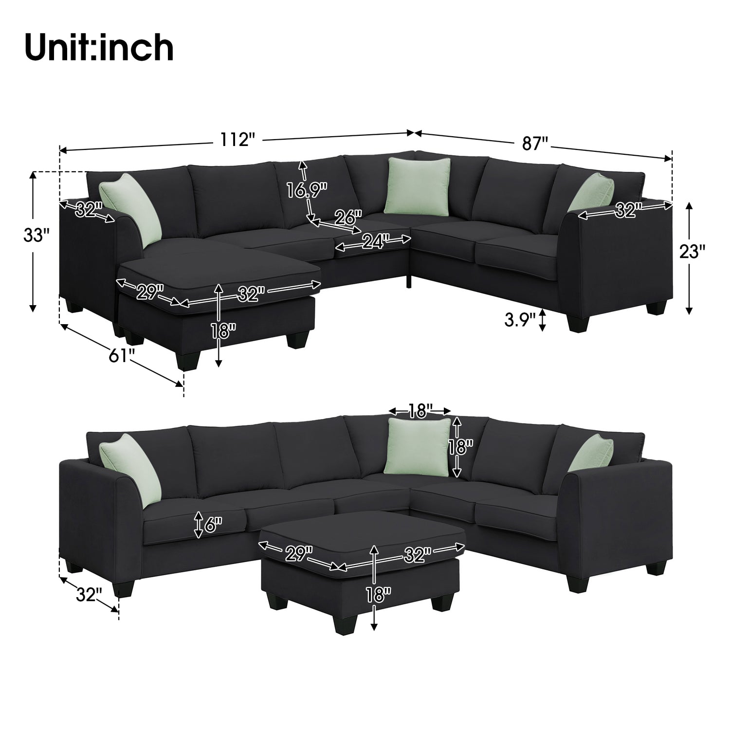 - Notes & Dimensions: This product is shipped in 3 packages with overall dimensions: 112.5''W x 87.5''D x 33.5''H; Ottoman size: 29"W x32"D x 18"H; Weight Capacity: 330lbs/seat. This sofa will be shipped from the US in a total of 3 packs, please wait with patience to get all.