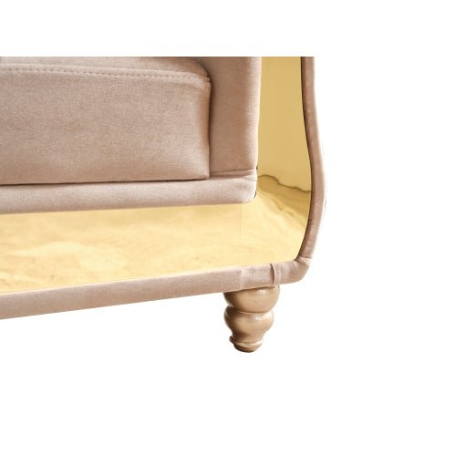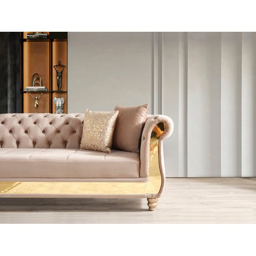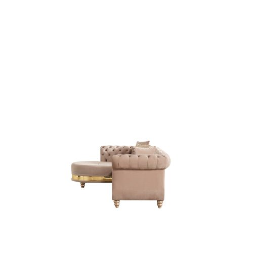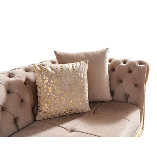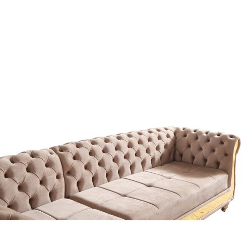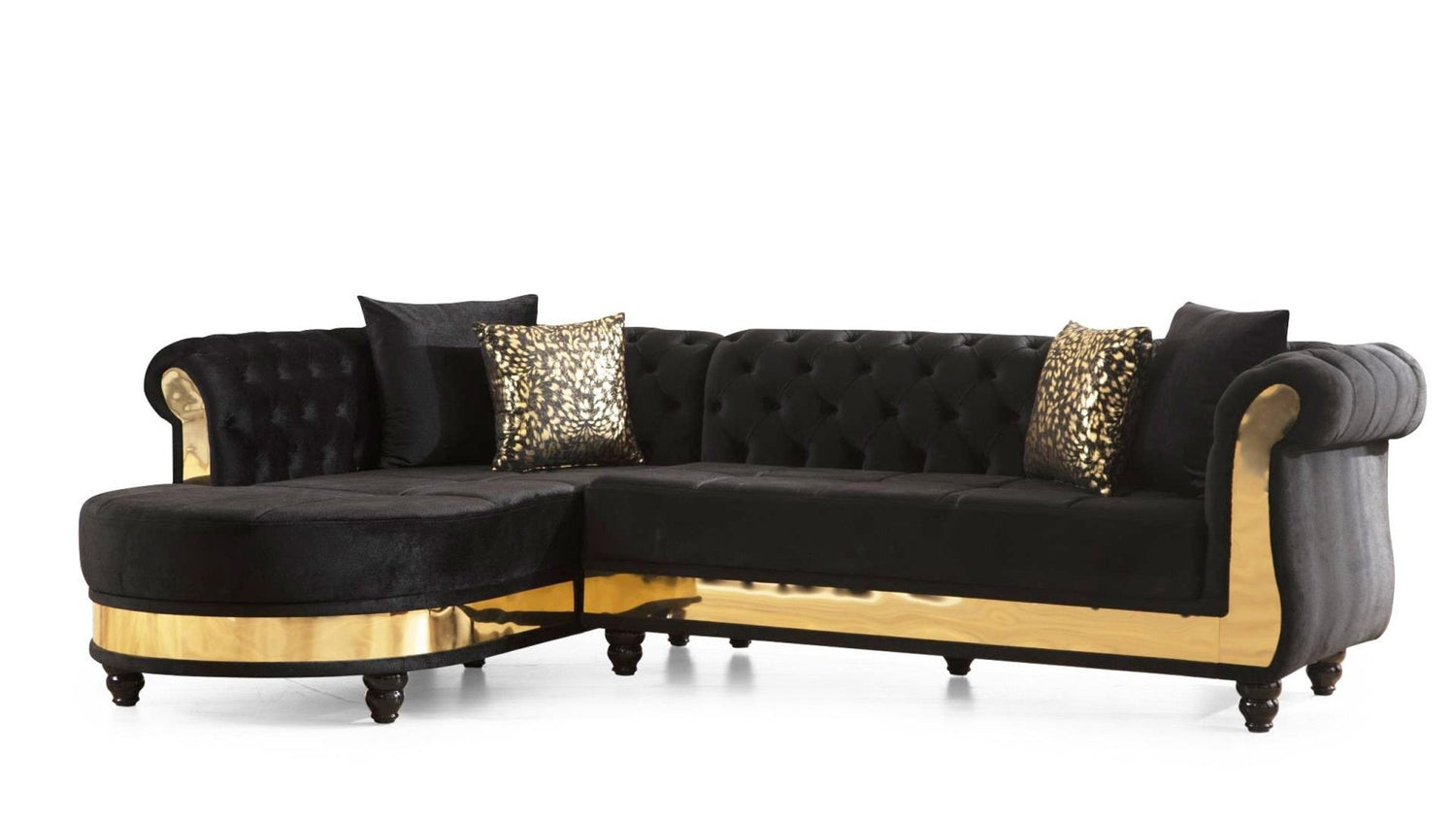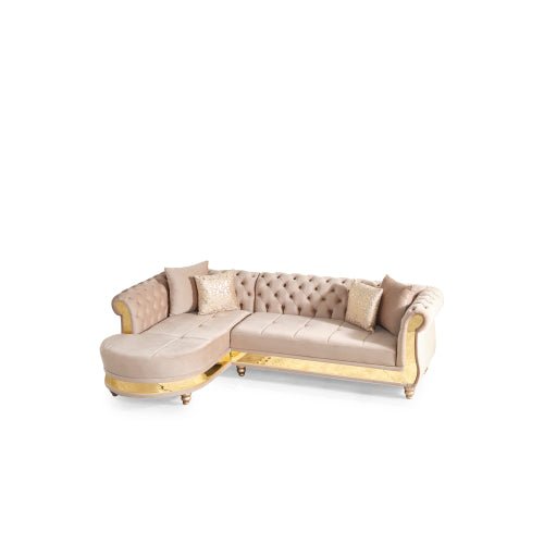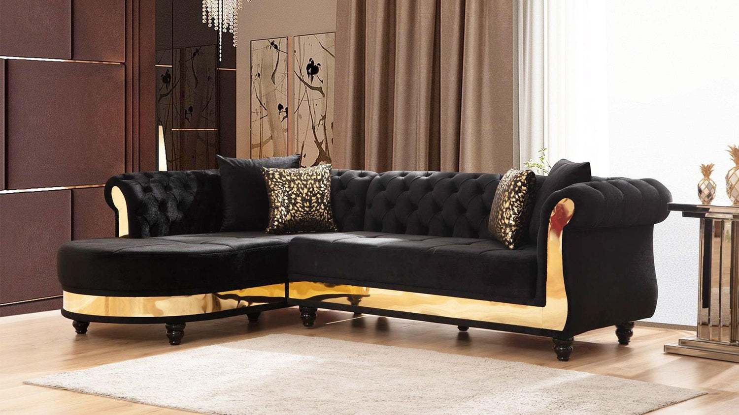 The perfect mix of Milky White, Taupe or Black with velvet and gold stainless steel comes to life in your space with this immaculate L-shaped living room set. This bold sectional comes upholstered in rich, sumptuous-to-the-touch velvet to make a fashionable statement in your space. The curved button tufted back design lends it a modish touch, and the gold stainless steel trim around its arms and base adds to its glitzy appeal. This one-of-a-kind living room sectional has a quilted back and seat detail made with a luxuriously padded fabric.