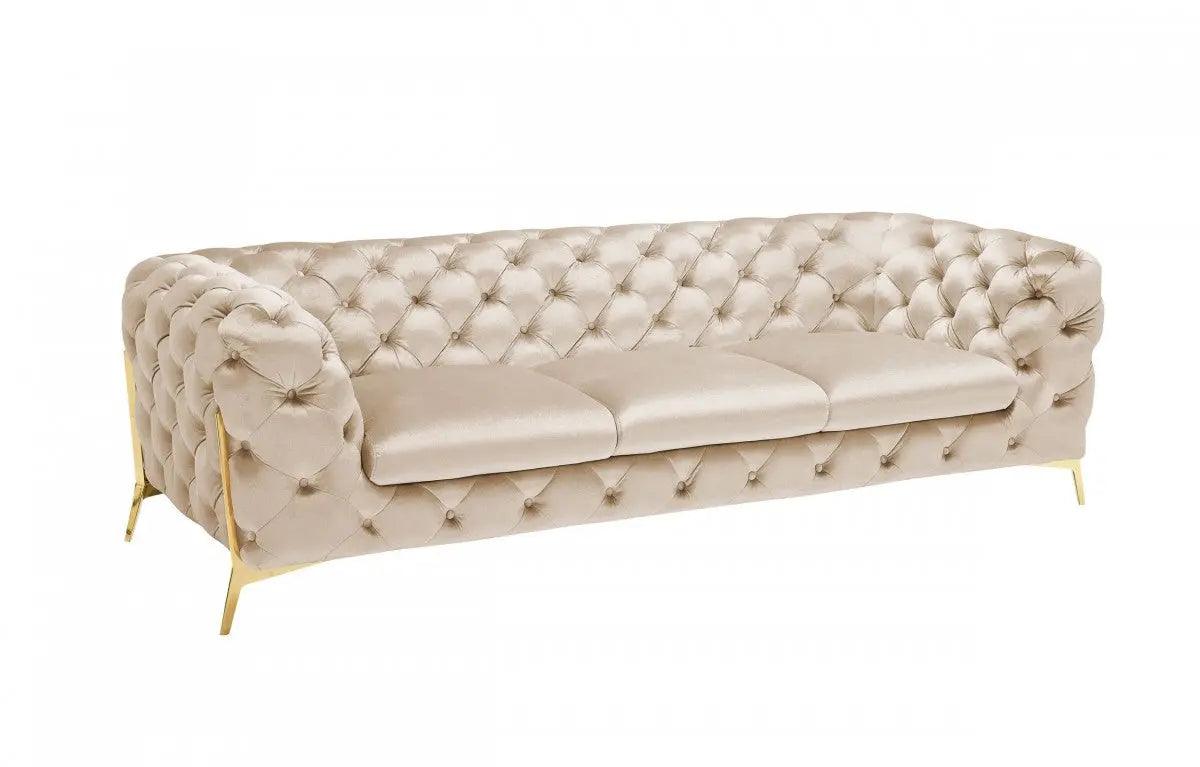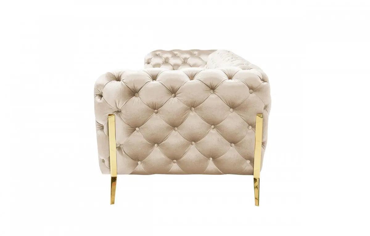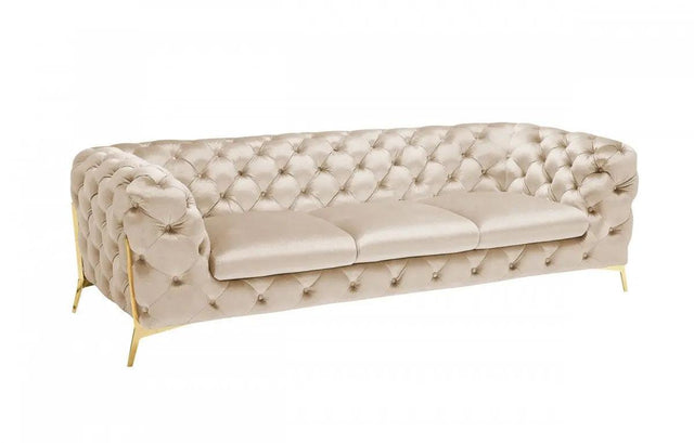 The Sheila Beige Sofa is a beautiful transitional, glam piece that can be used in different design settings; glam, transitional and contemporary. The sofa is upholstered in beige velvet fabric, with overstuffed back and arms in a tuxedo style with diamond button tufting, and polished gold legs that extend upward creating a design feature of their own. Pair with the two seater loveseat, and chair.