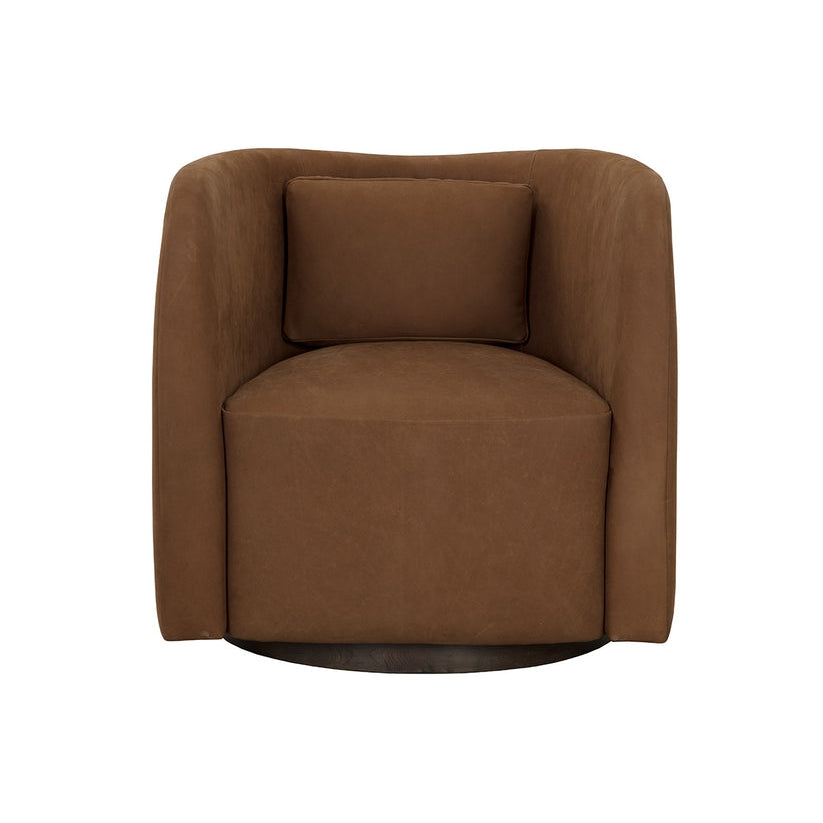 Experience ultimate comfort with the luxurious Emilie Swivel Lounge Chair. Features a well-defined rounded profile fully upholstered in nubuck caramel leather. A brown oak wood swivel base completes the look. Handle with Care: This design has been crafted with 100% genuine leather. Leather is a natural material; as such, colour variations, markings, wrinkles, grooves and light scratches are acceptable and appreciated characteristics. No two pieces are alike. Visit our Product Care page for more information on how to ensure the lasting beauty of this piece. As wood is an organic, porous material, these pieces will contain natural variation of texture and may also exhibit fine indentations and cracks. Wood pieces will also display a disparity of colour and grain, and visible knots and burls that add to the character of each piece.
