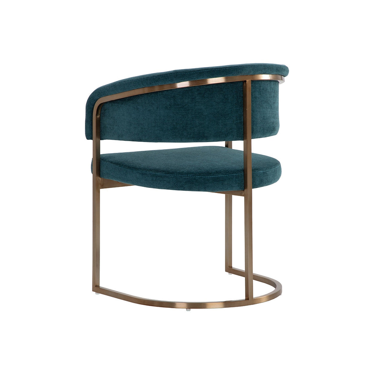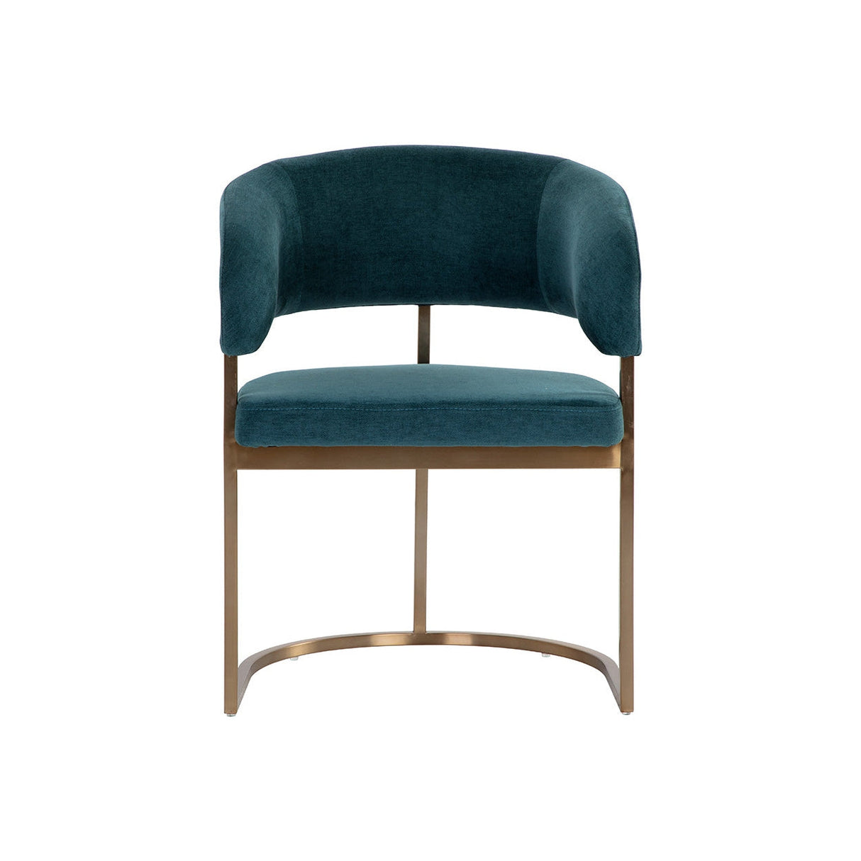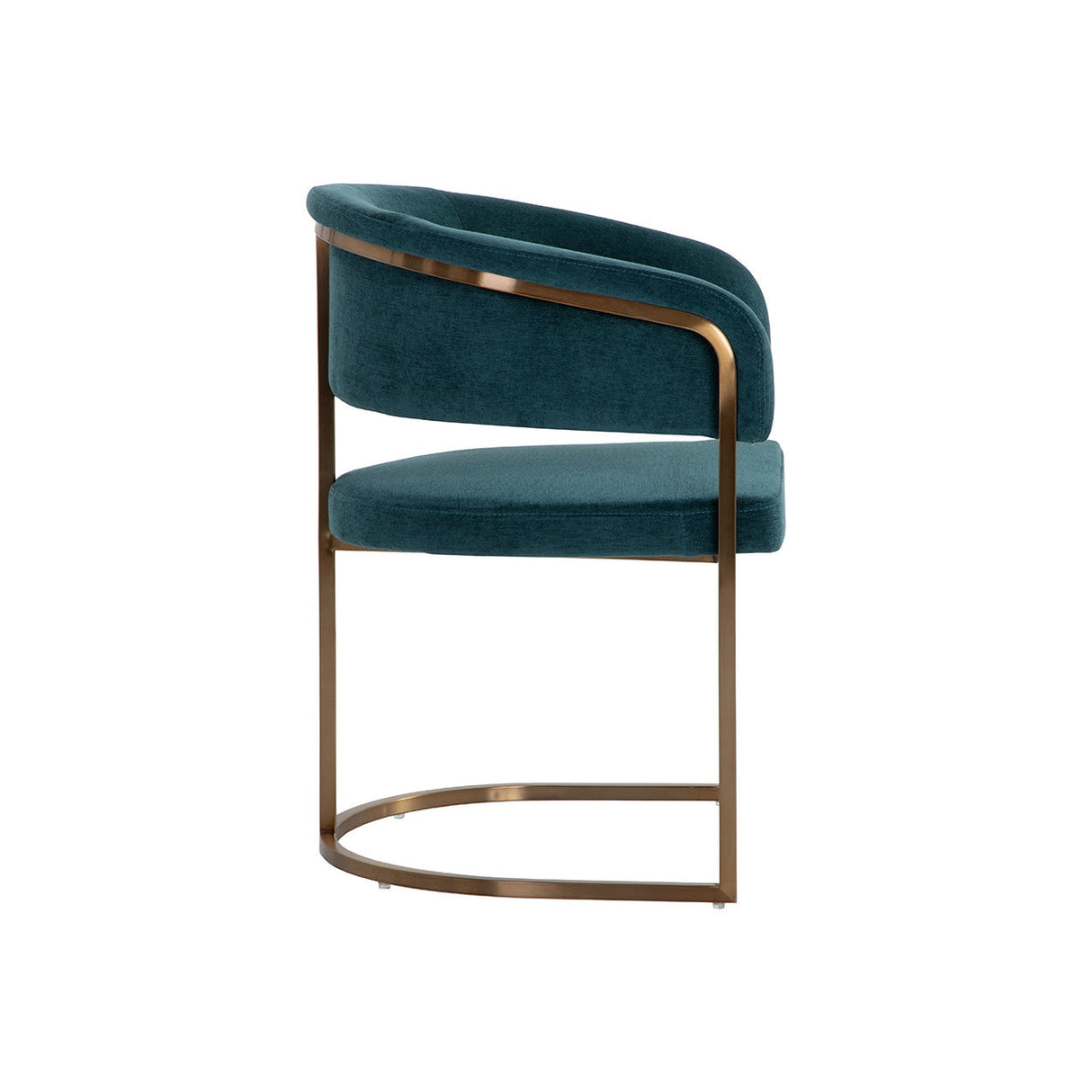 Uniting the beauty of sleek modern design with timeless elegance, this dining armchair is a great addition to any dining space. Stocked in danny teal fabric and completed with a cantilever frame in a gold stainless steel finish. Also available in belfast heather grey fabric with a gunmetal stainless steel finish.