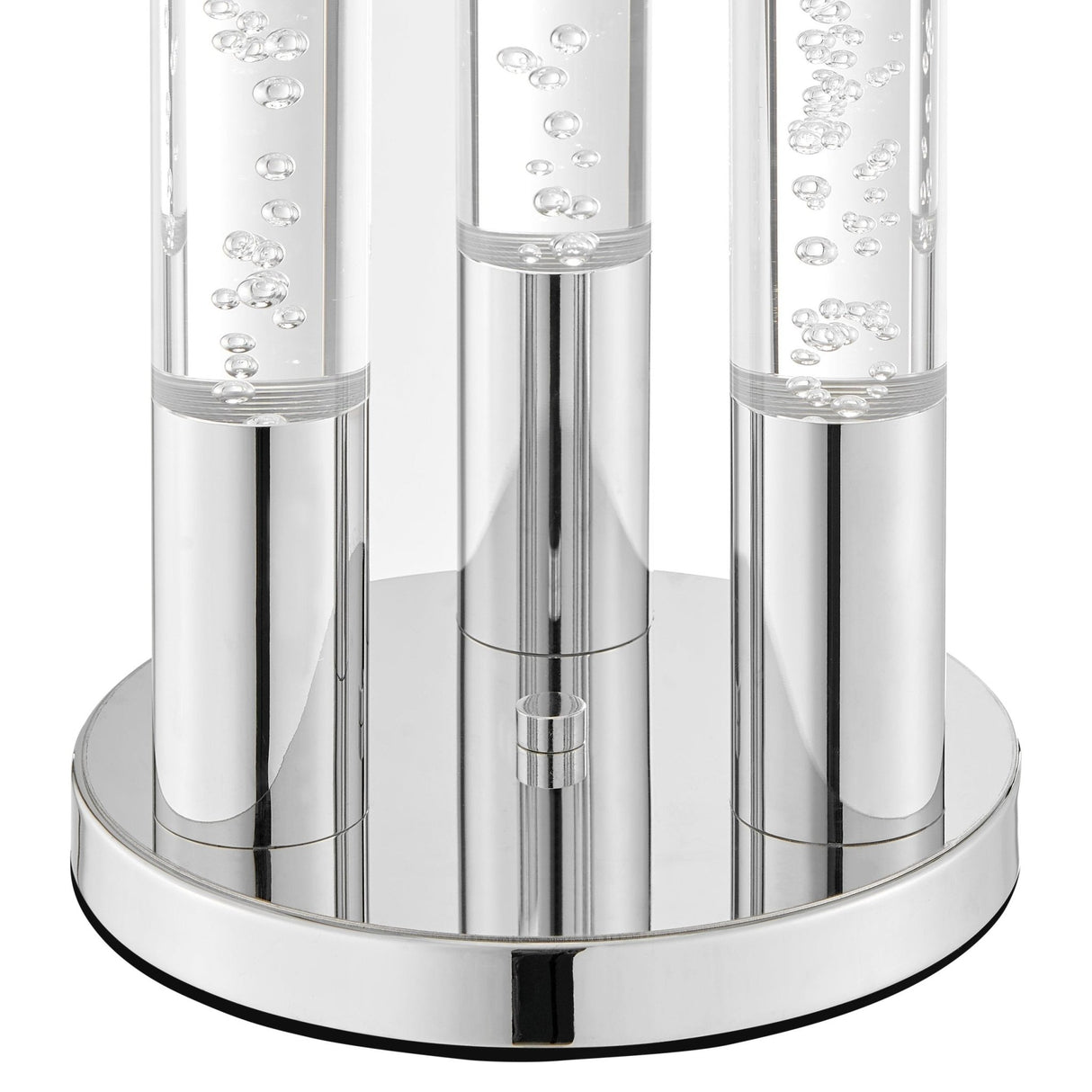 This collection of lamps is a modern approach to your home decor. Brings an elegant atmosphere into your space, features a round chrome base with acrylic cylinders. These cylinders are different sizes and hold a bulb at the base of the light and when lite they reflect light throughout the acrylic. The lamp is perfect to create mood lighting, ambiance, and will double as a reading lamp.