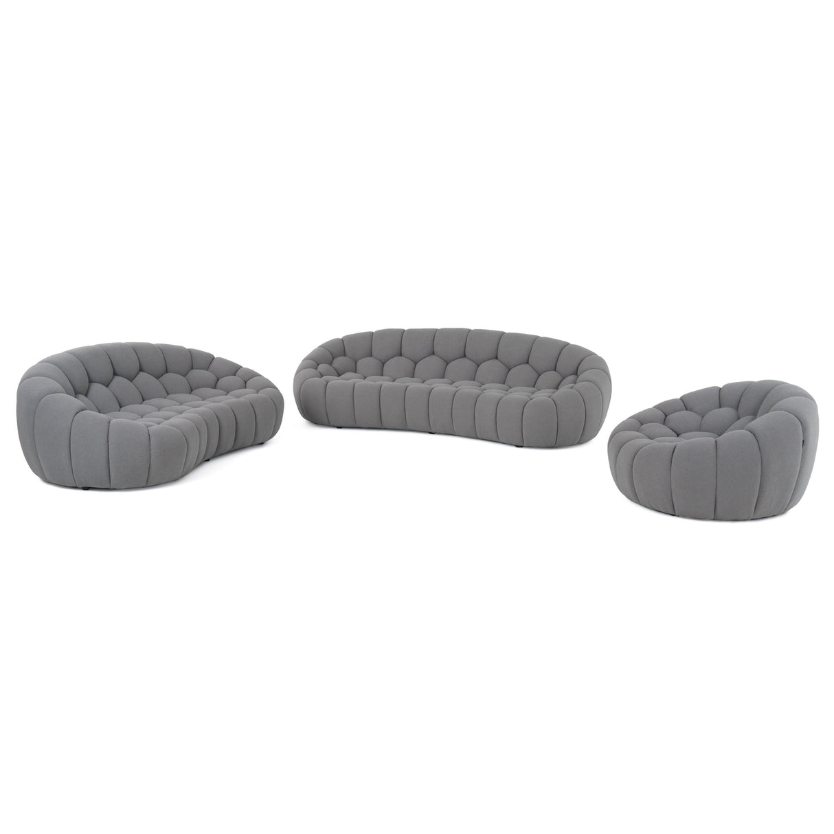 The Yolonda Curved Modern Light Grey Sofa Set offers a stunning collection for your living space. The set includes a sofa, loveseat and single chair. The hexagonal tufted cushions provide a unique, non-traditional and stylish design for the sofa as well the teddy fabric upholstery providing maximum comfort.